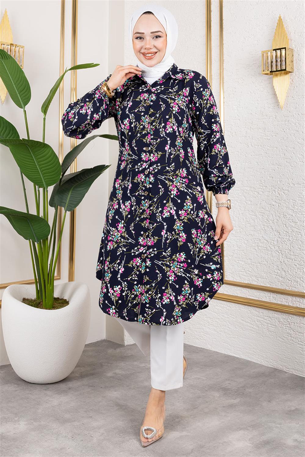 Asel Çiçekli Viskon Tunik LACİVERT