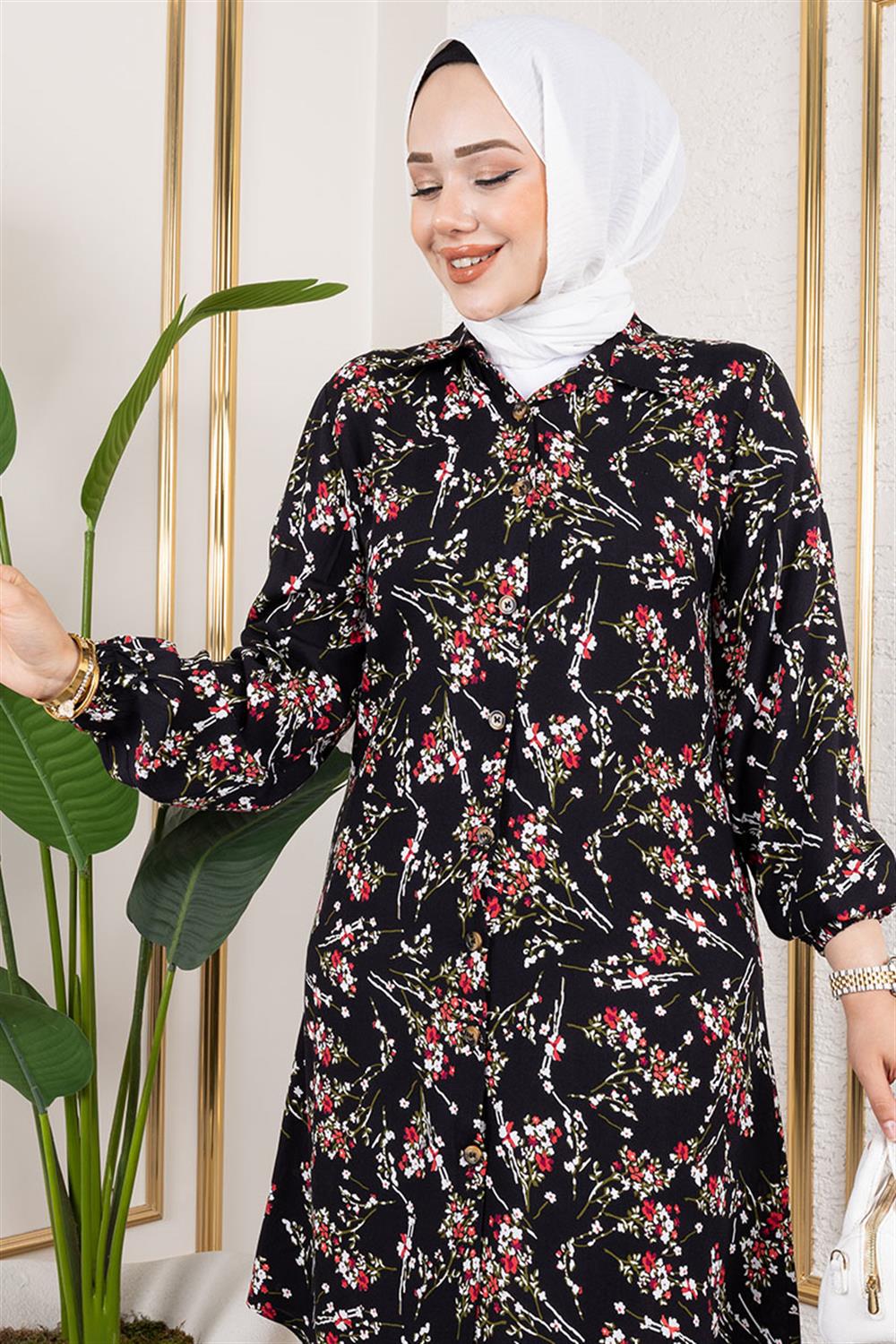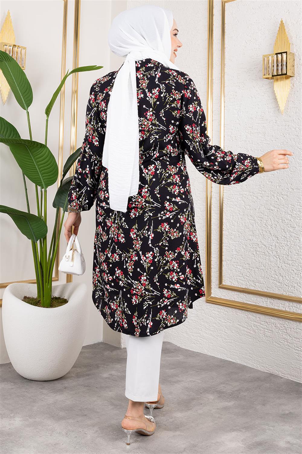 Asel Çiçekli Viskon Tunik SİYAH