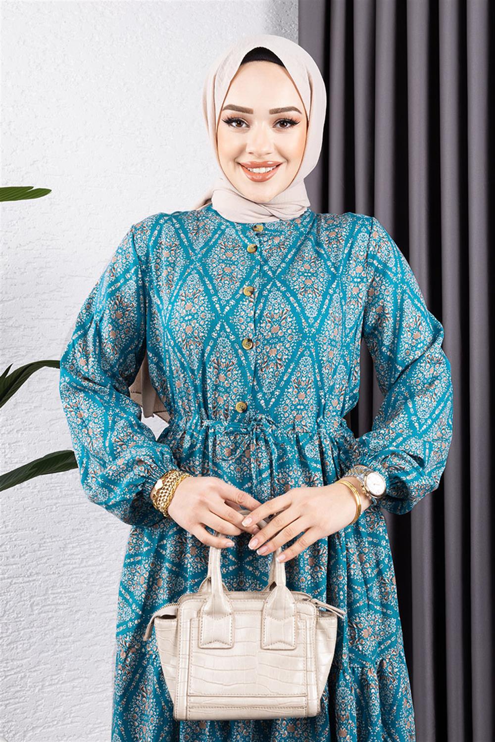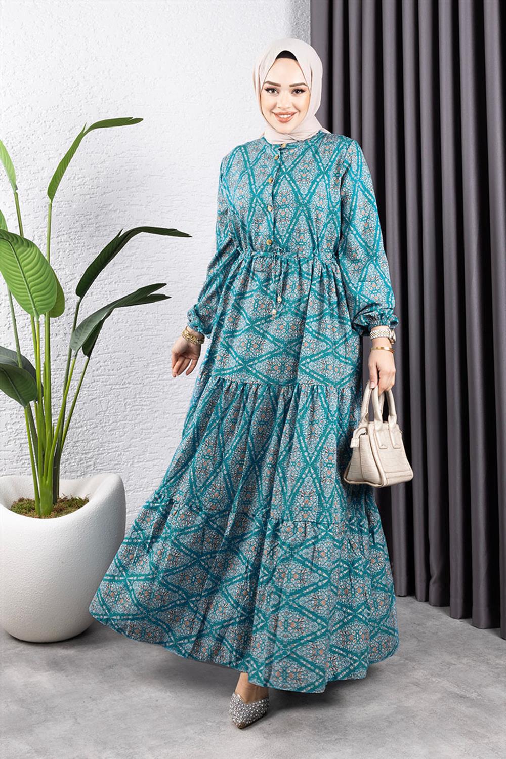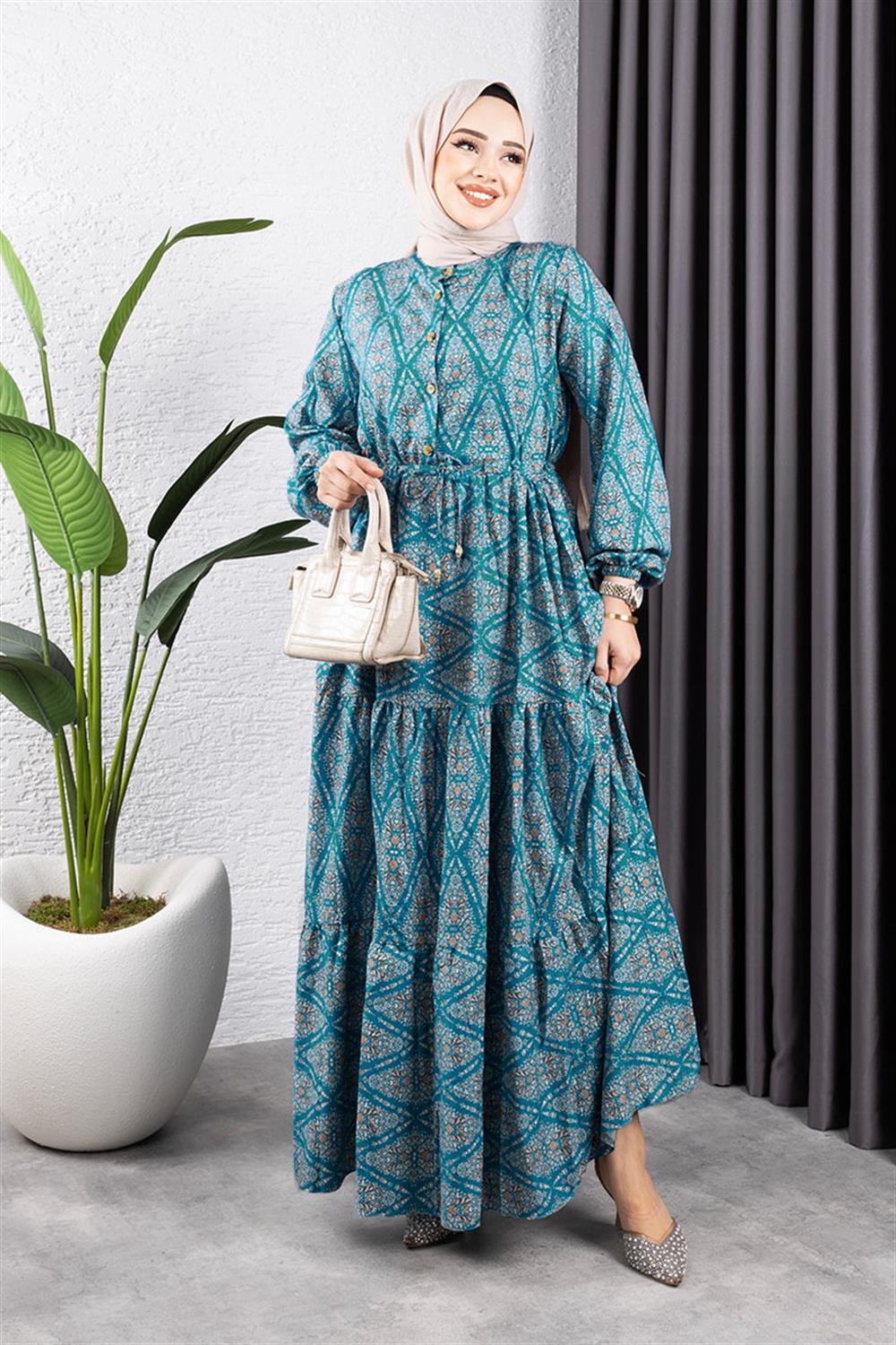 Bağcıklı Desenli Viskon Elbise