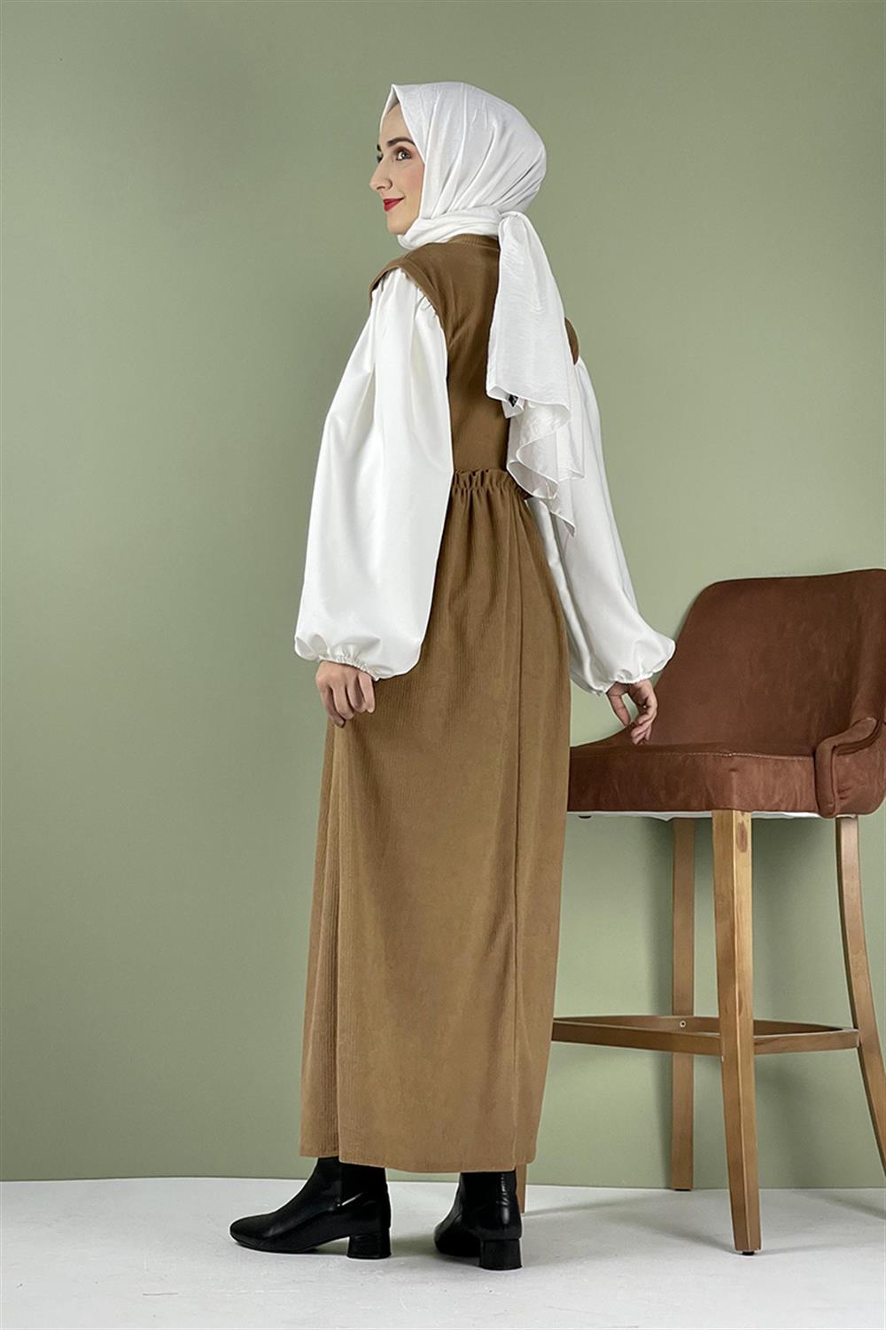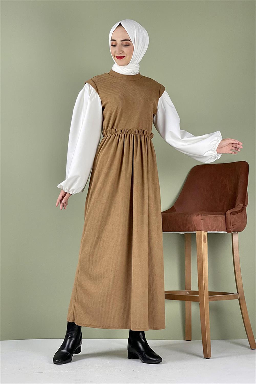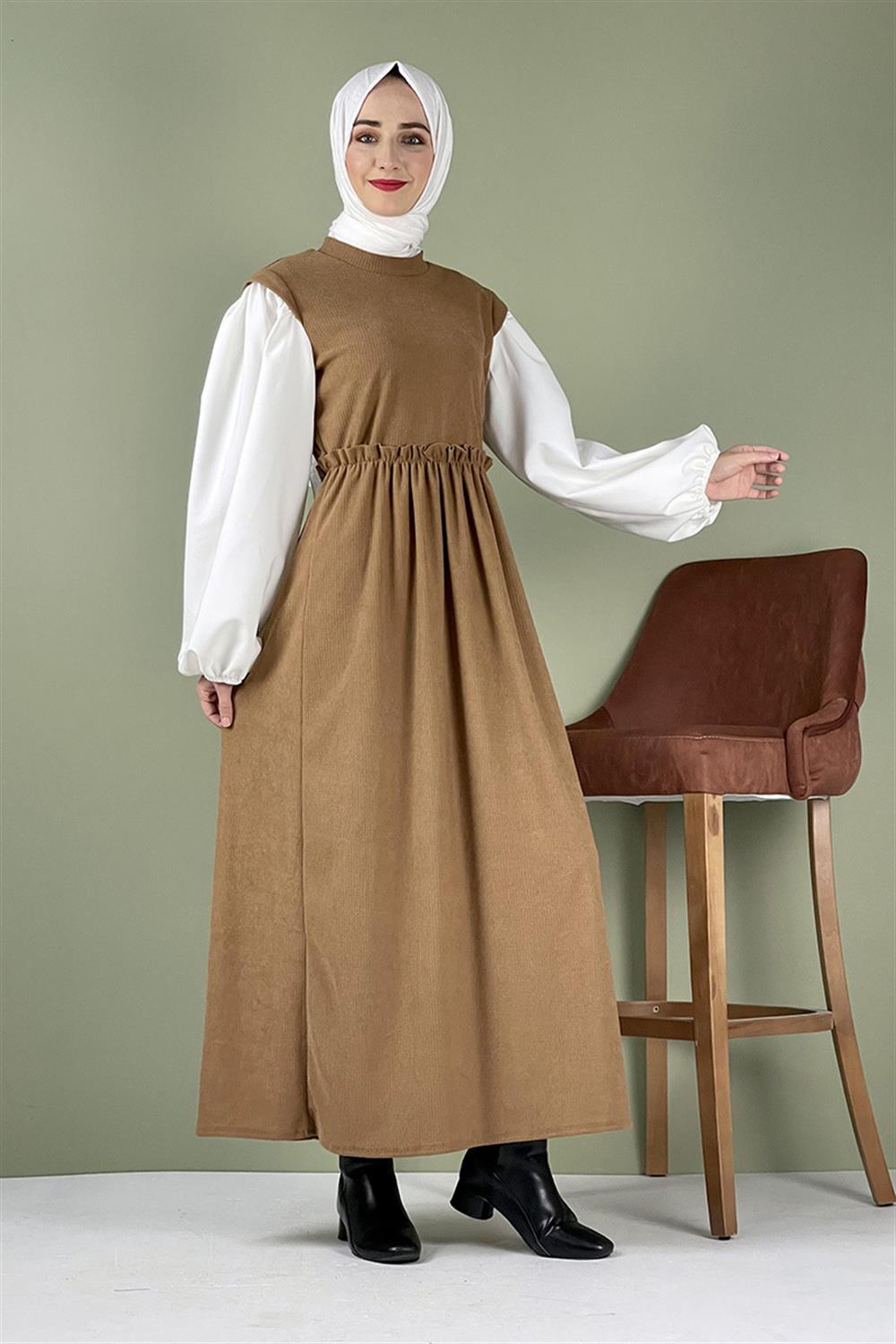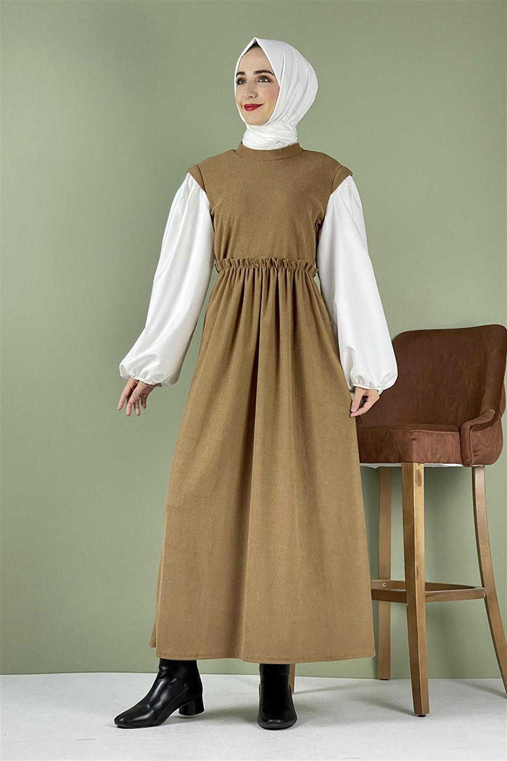 Balon Kol Kadife Elbise Camel