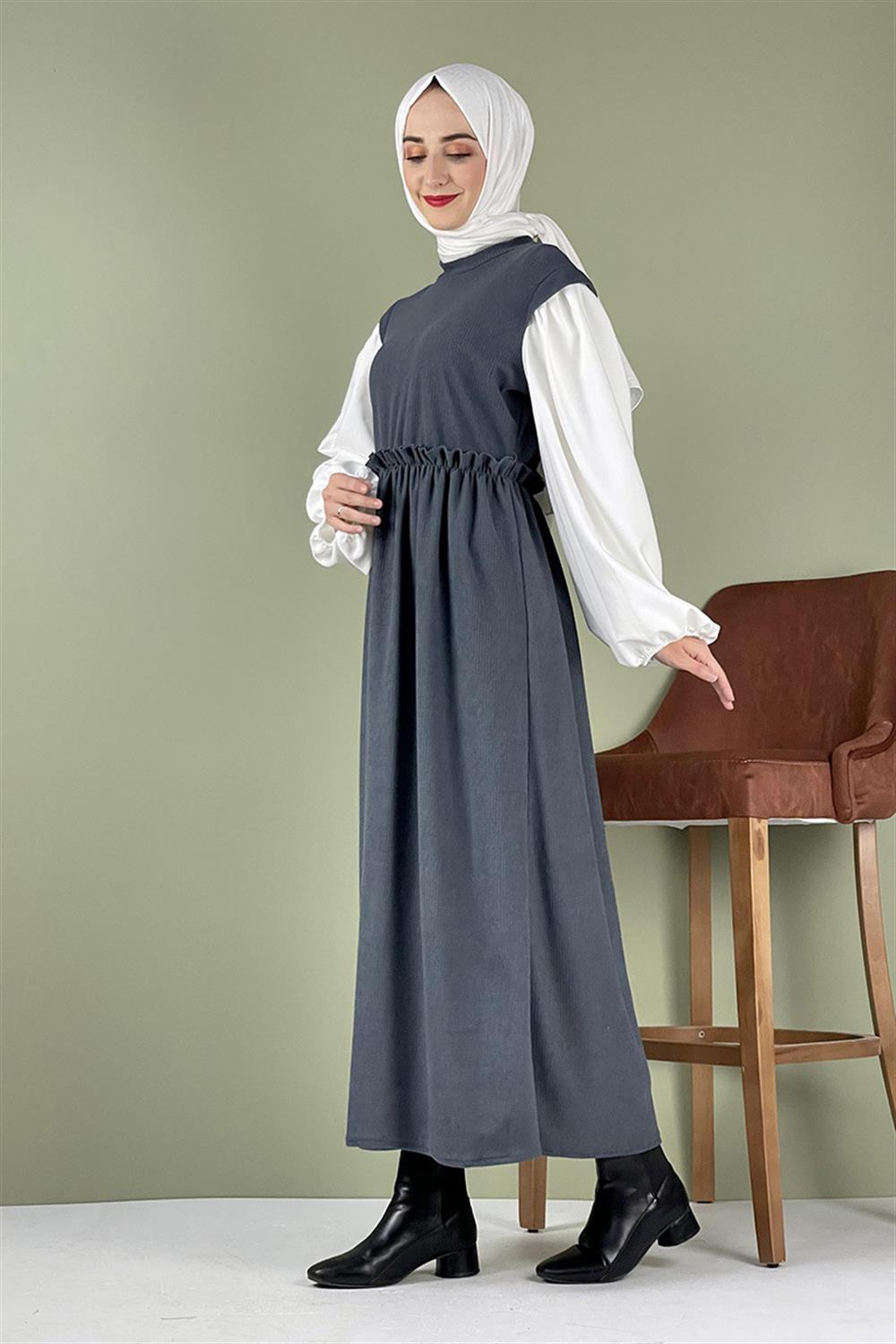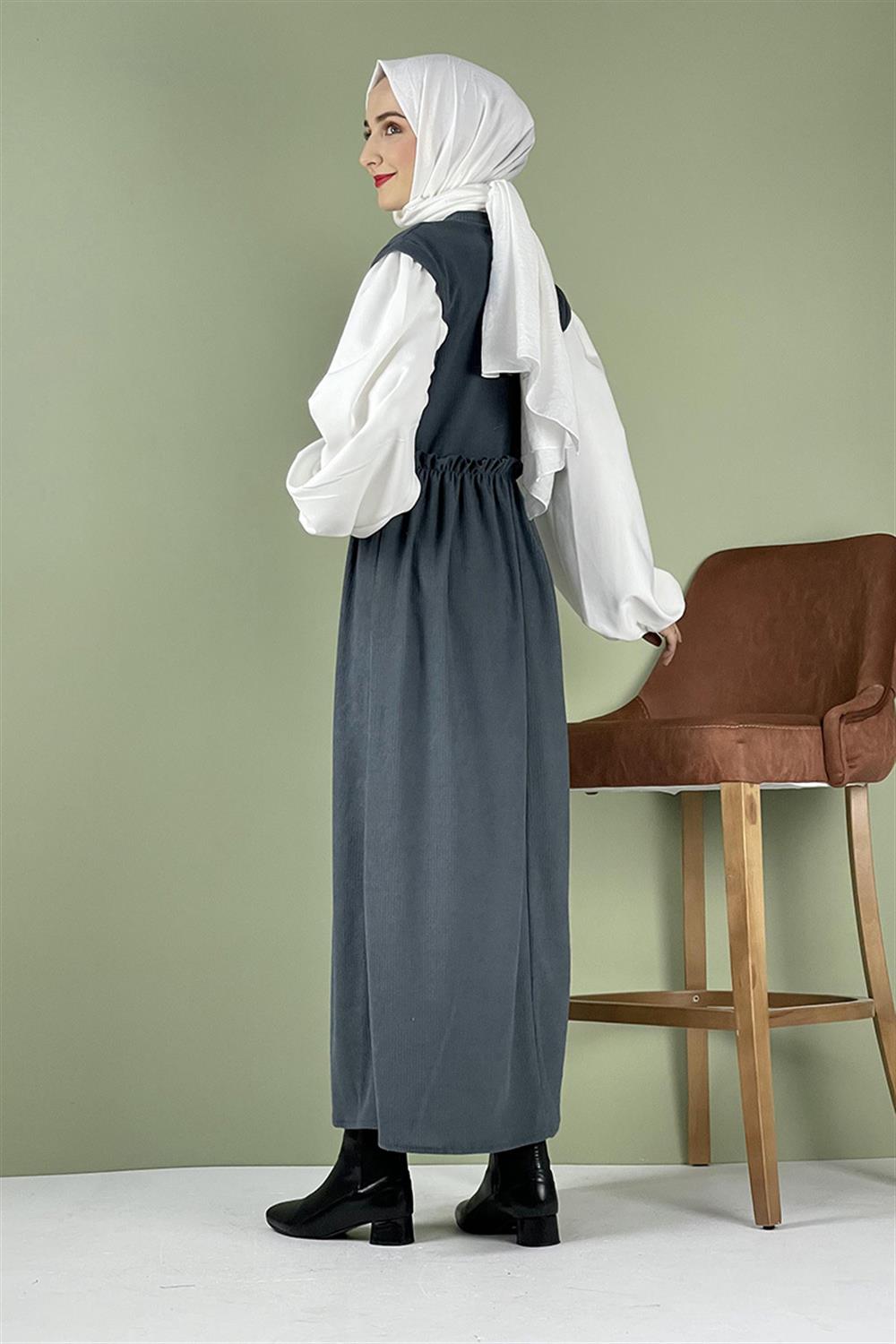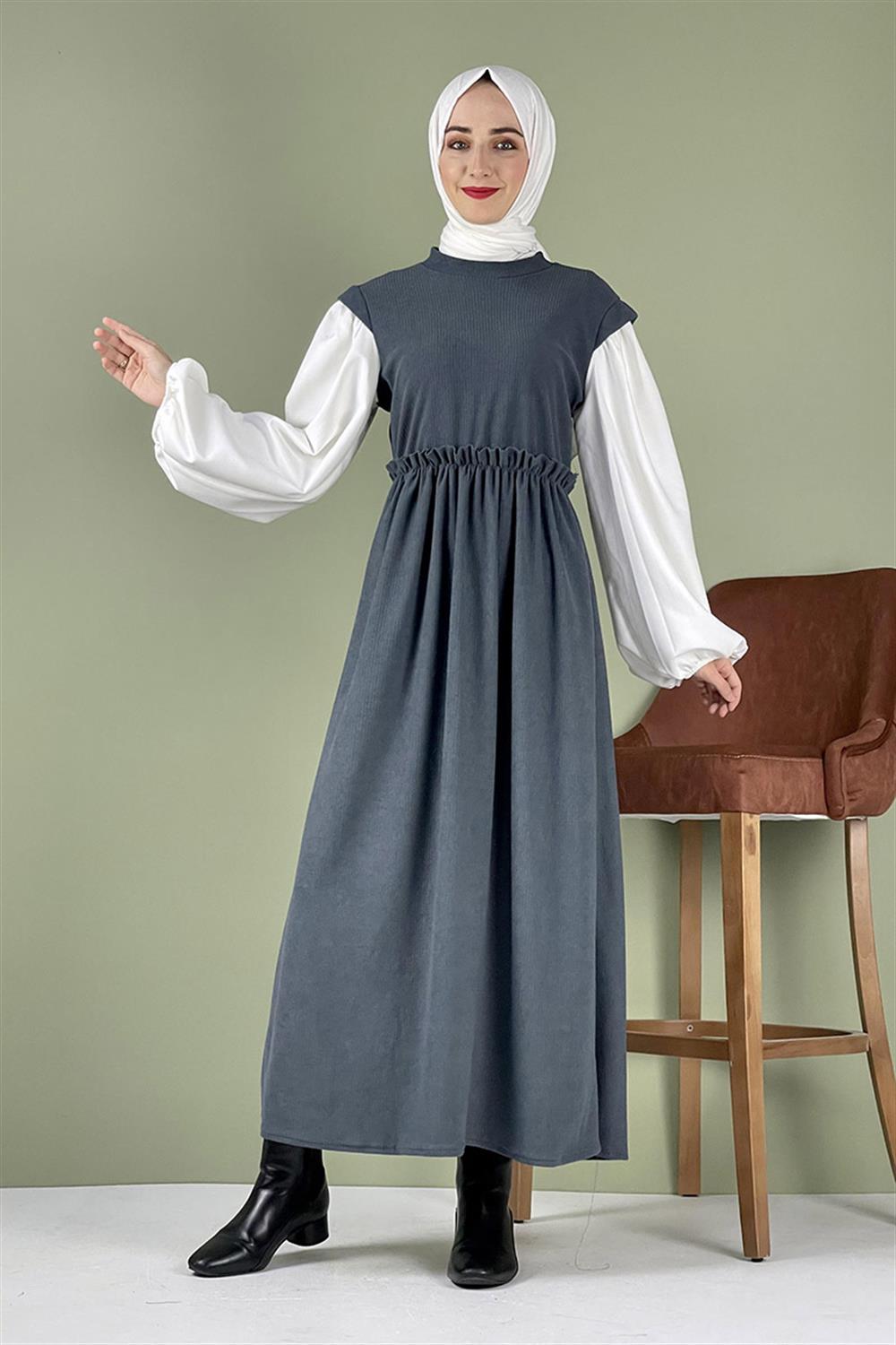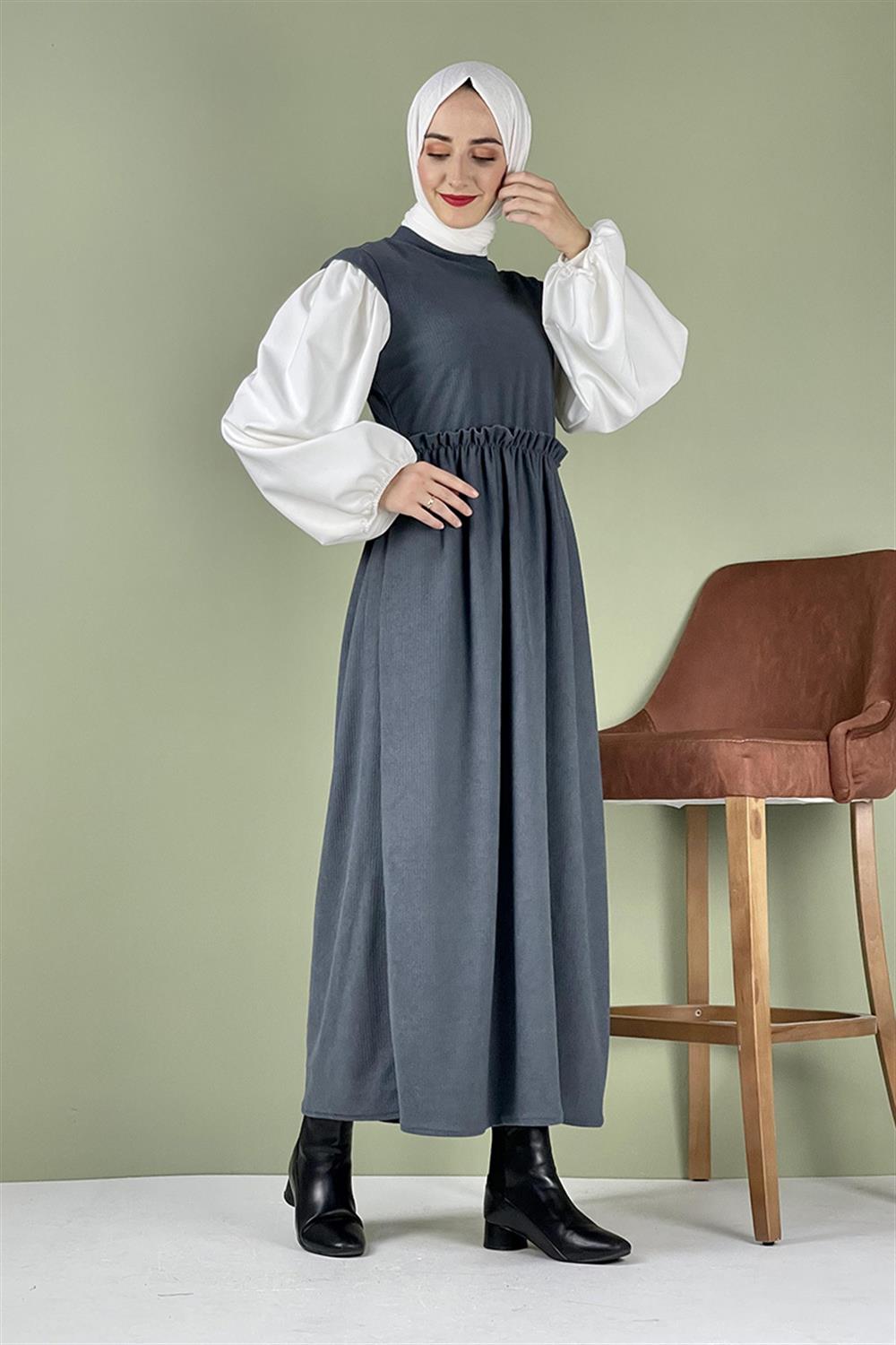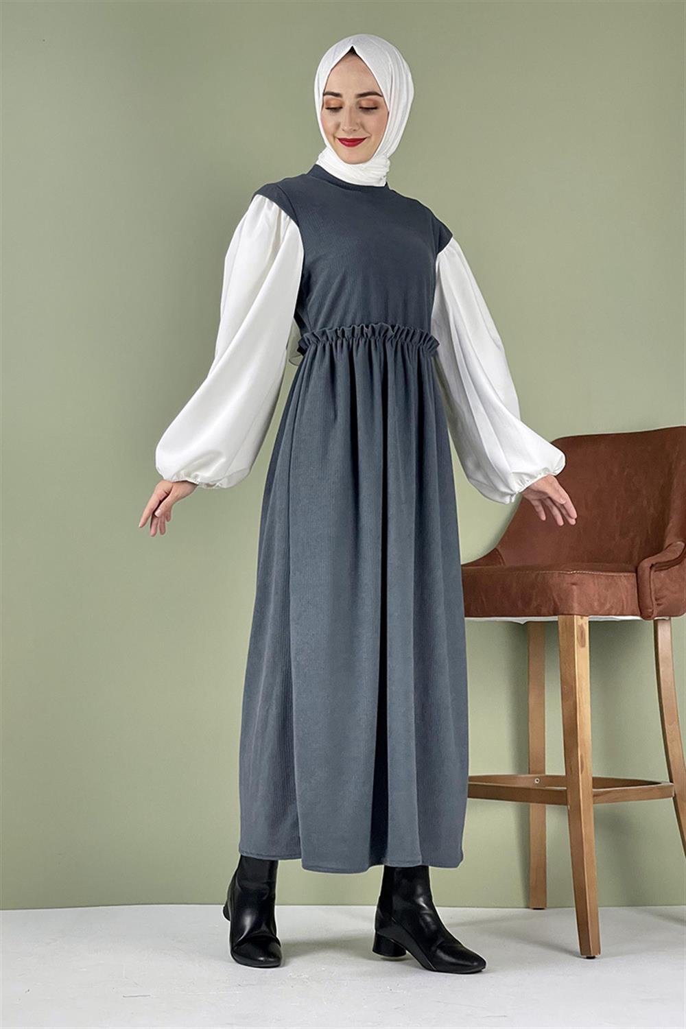 Balon Kol Kadife Elbise Gri