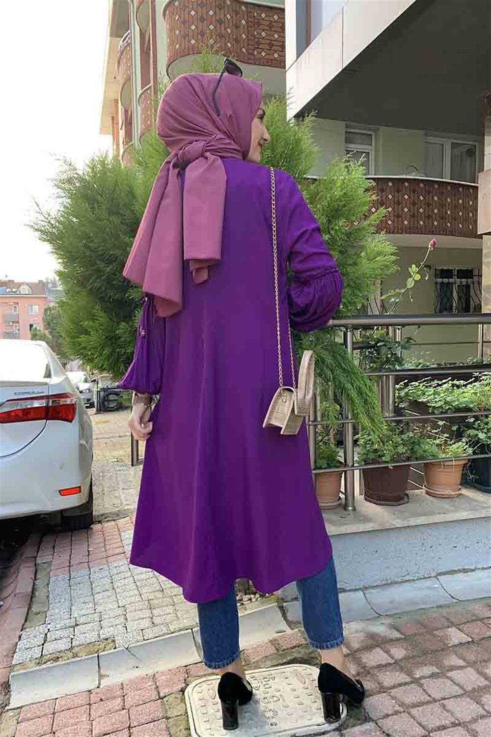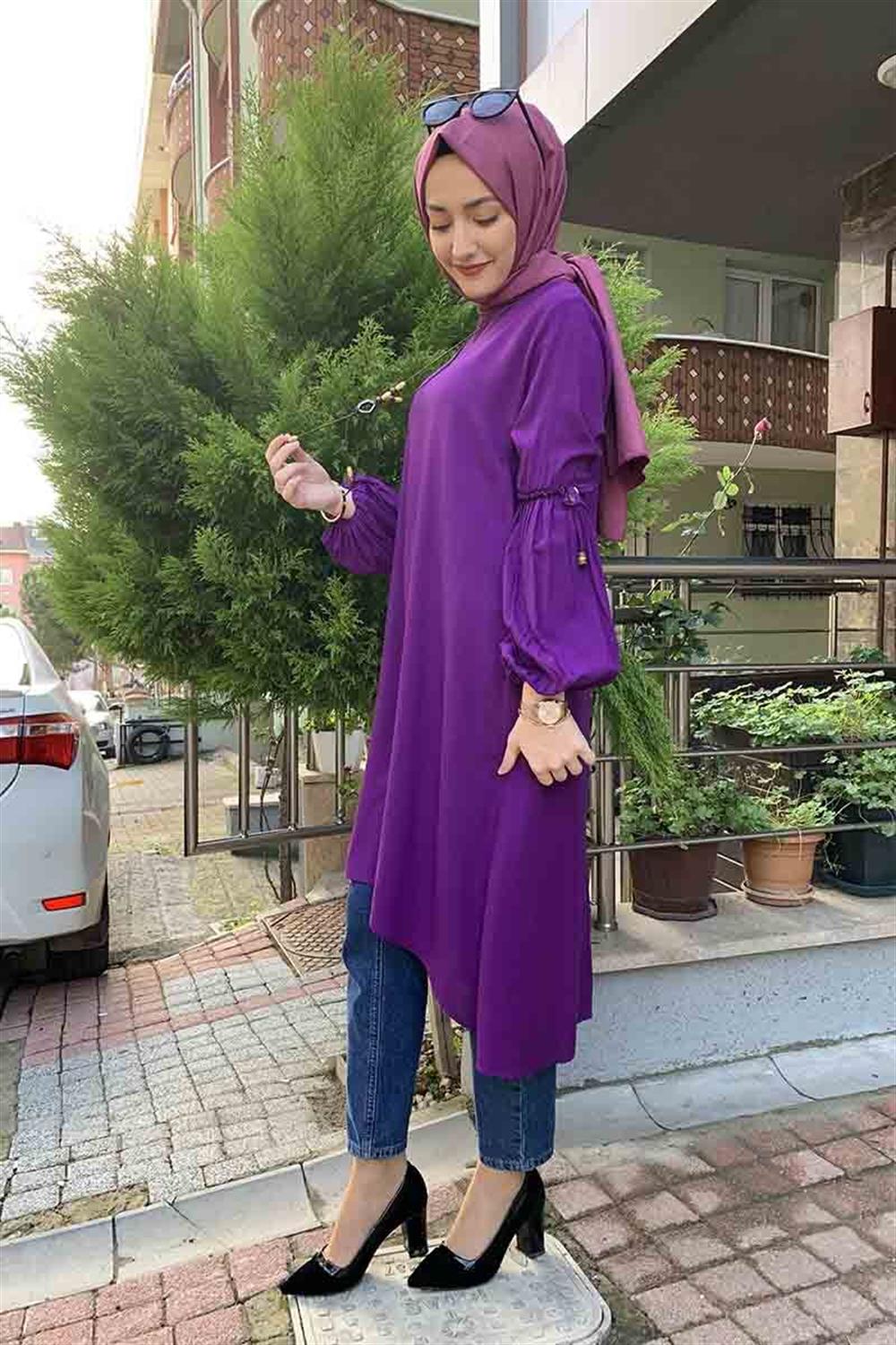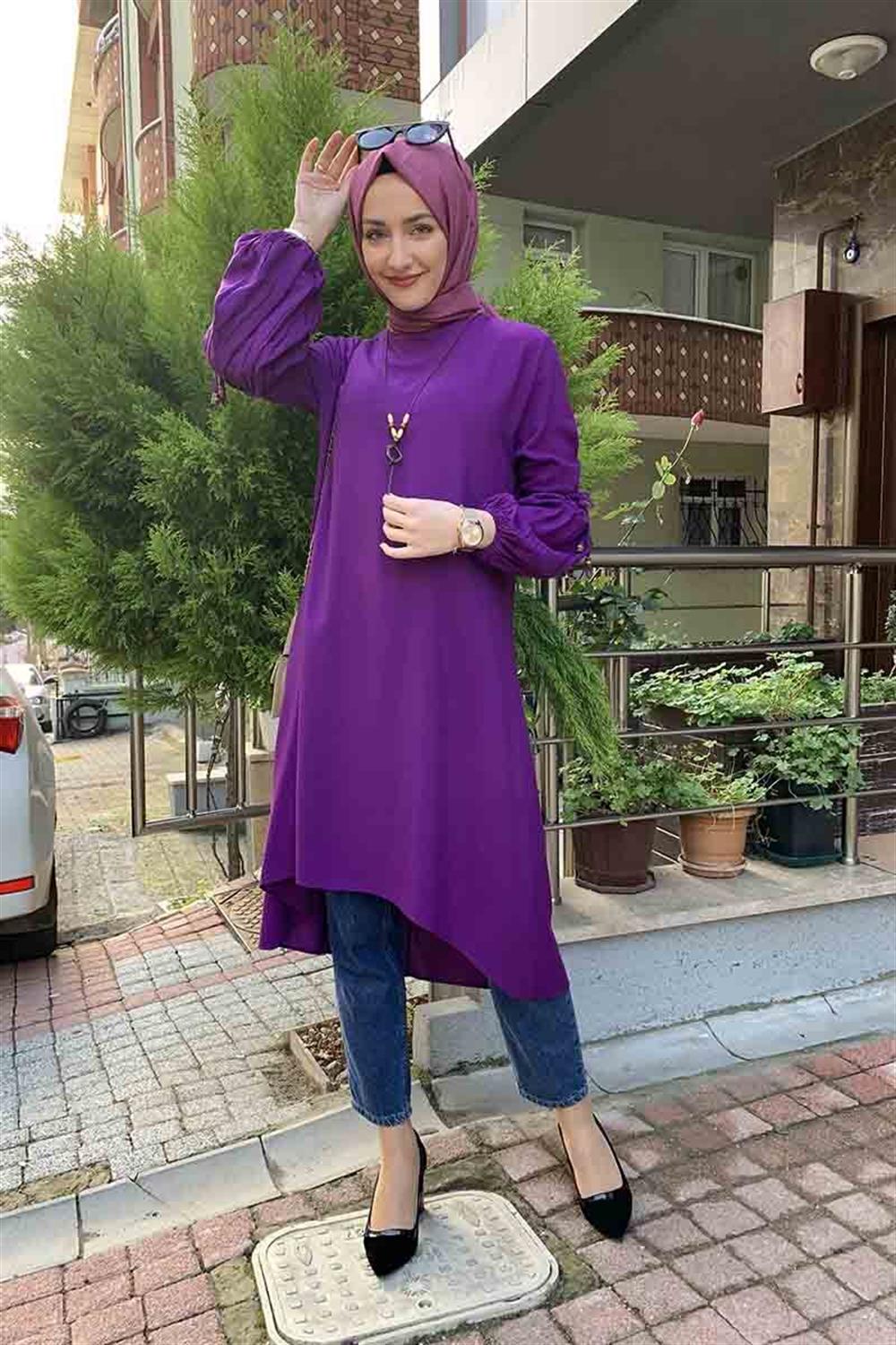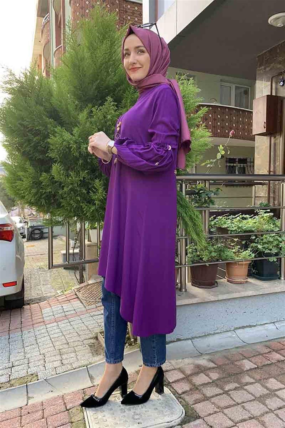 Balon Kol Kolye Detaylı Tesettür Tunik Mor