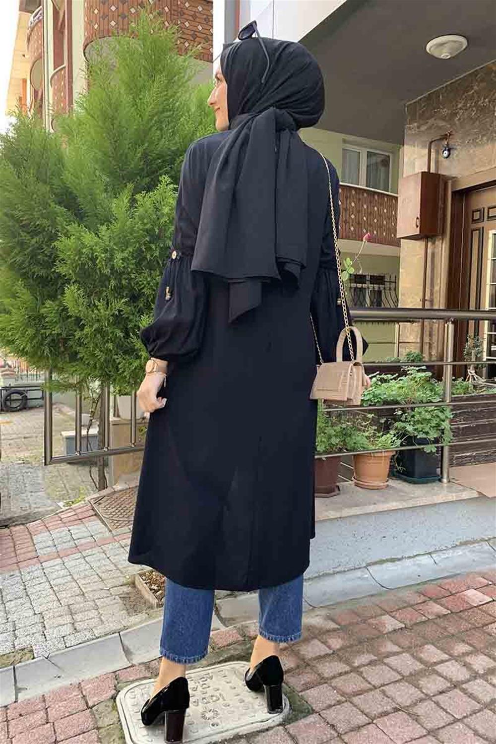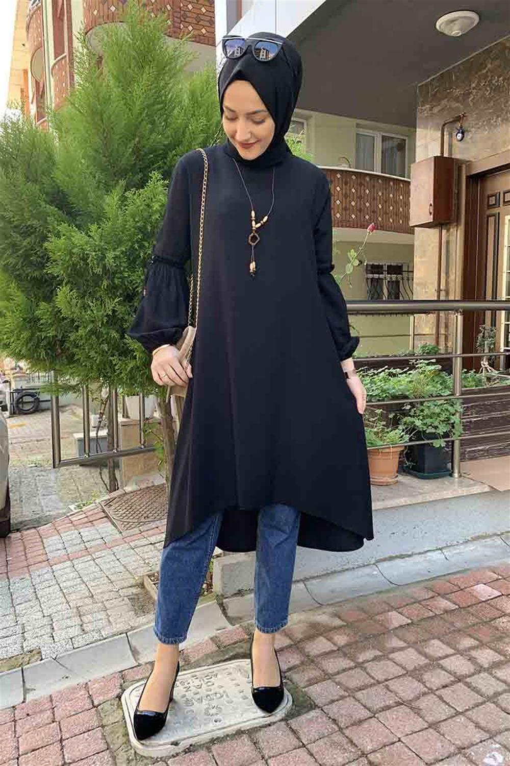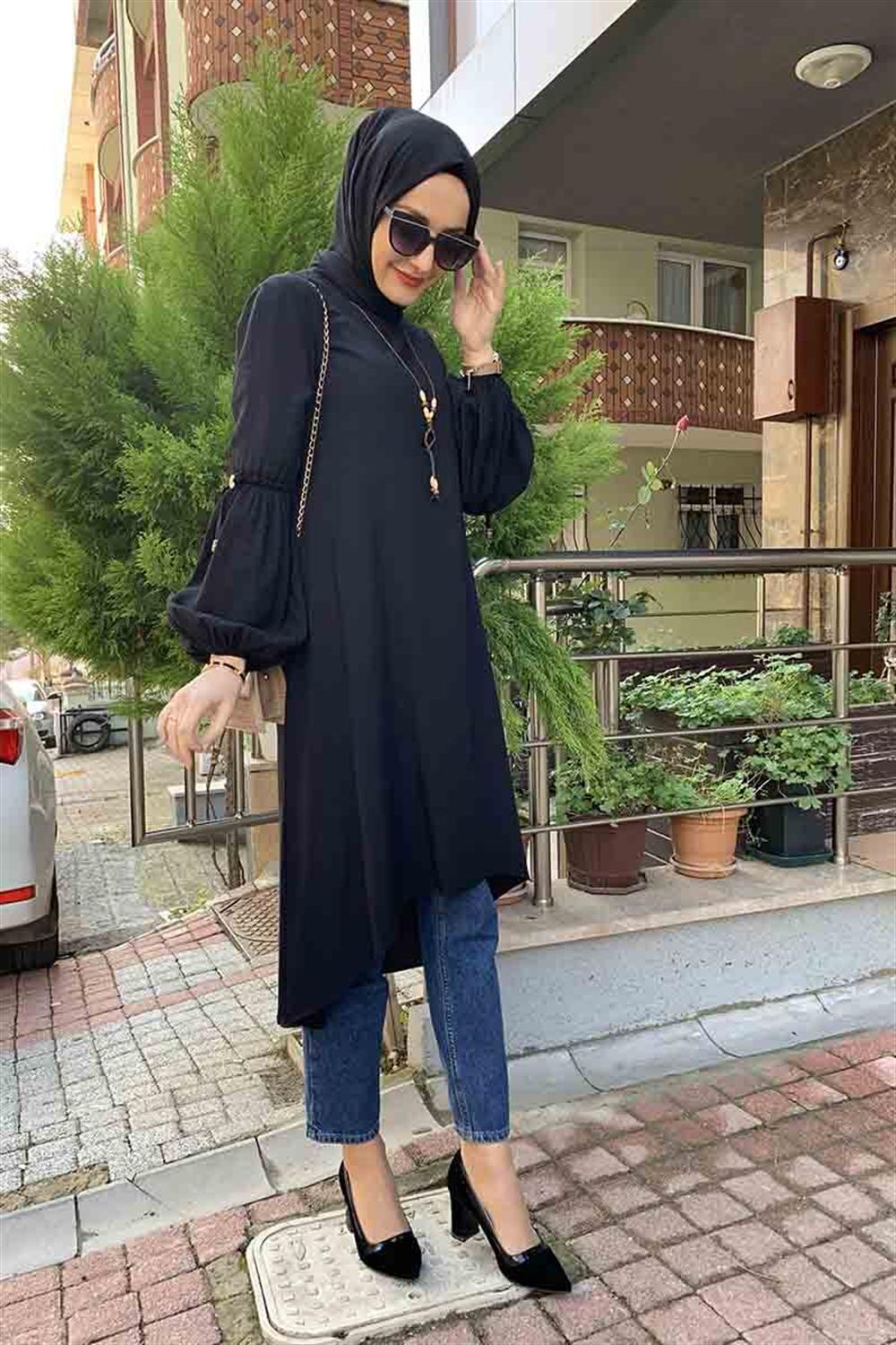 Balon Kol Kolye Detaylı Tesettür Tunik Siyah