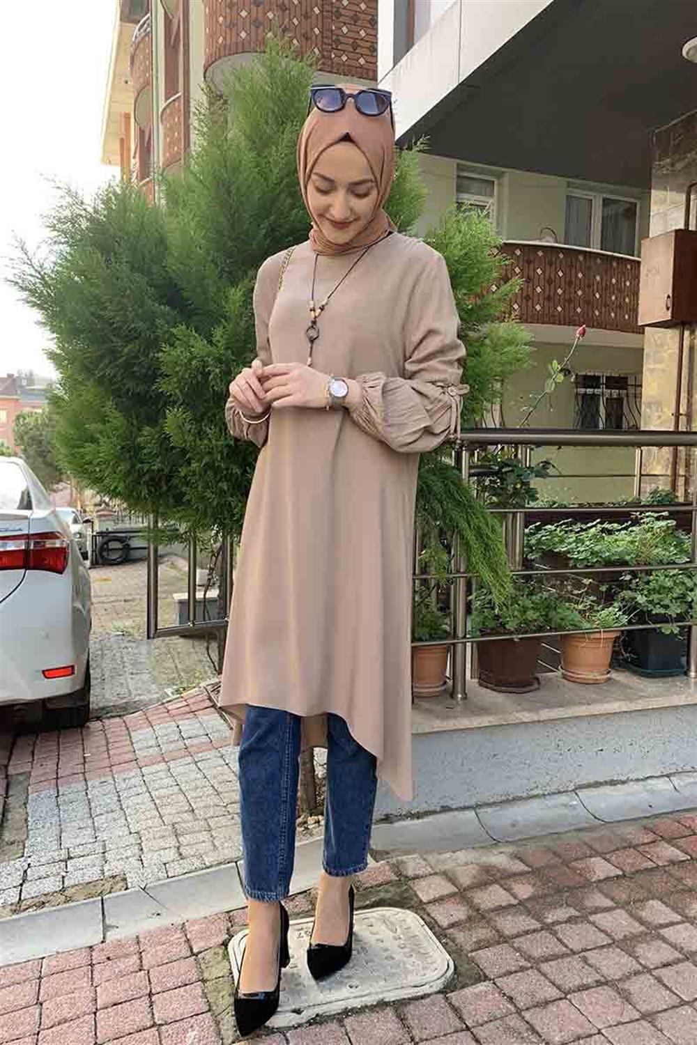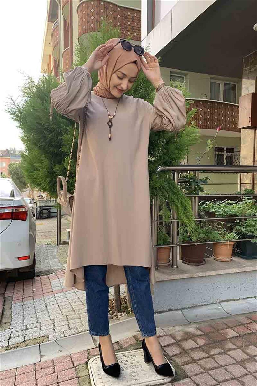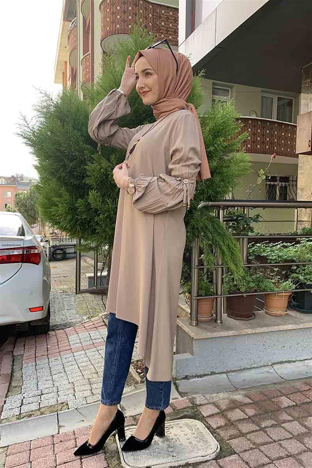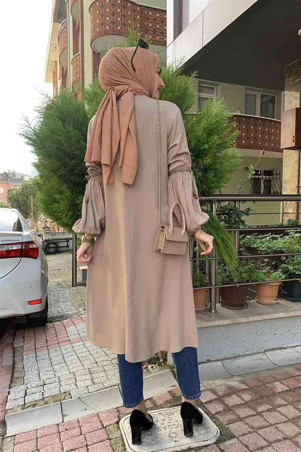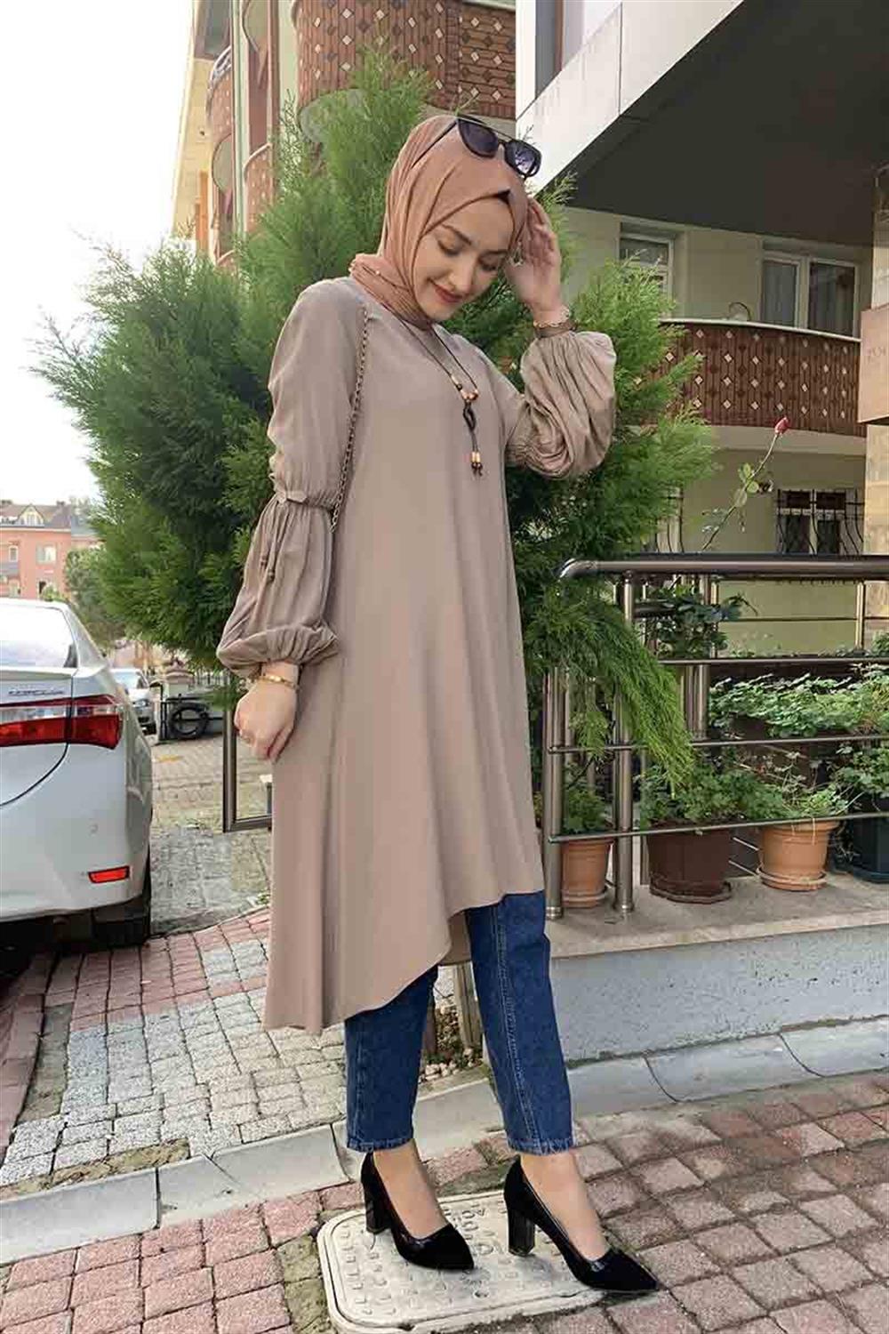 Balon Kol Kolye Detaylı Tesettür Tunik Vizon