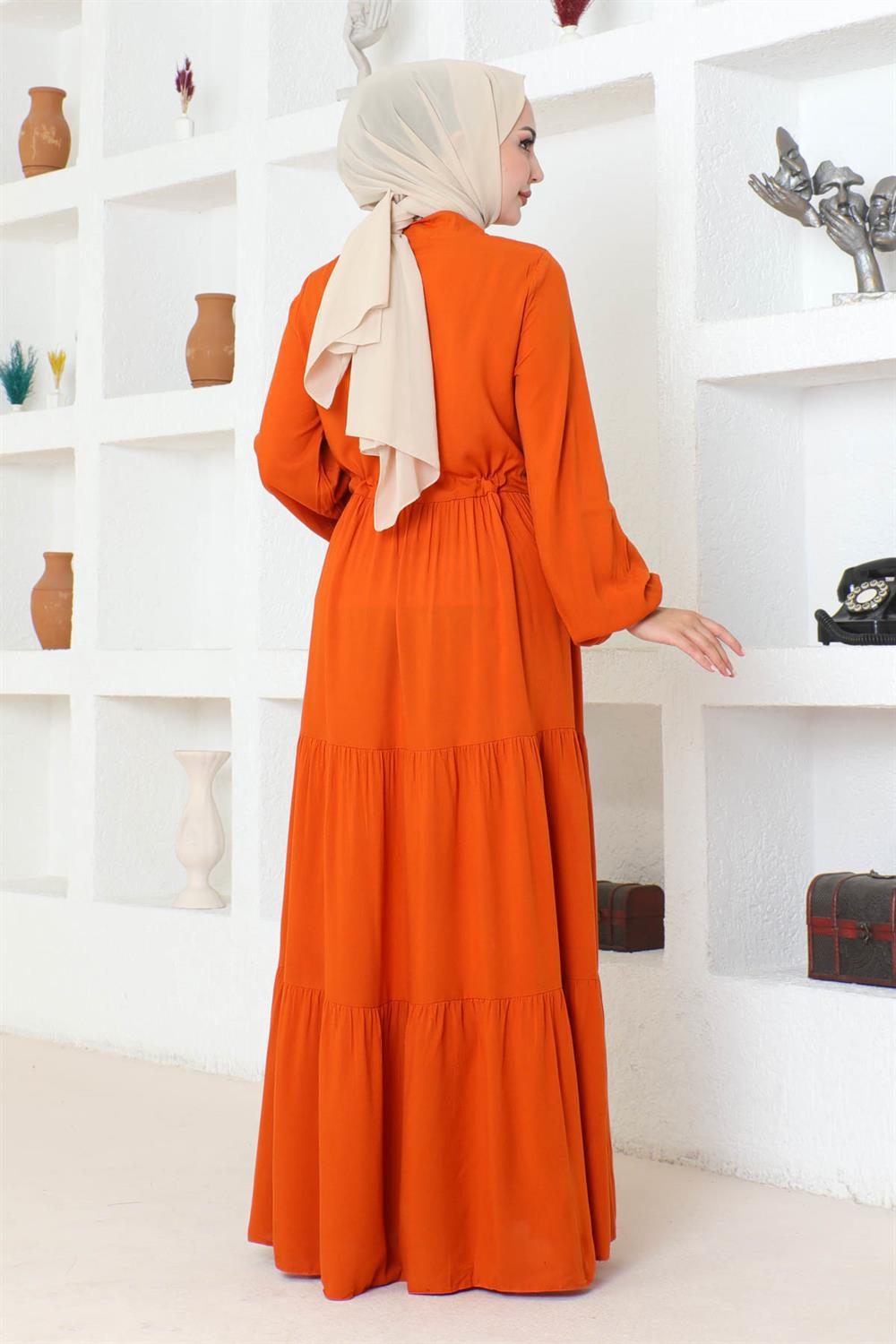 Belden Bağcıklı Viskon Elbise TURUNCU