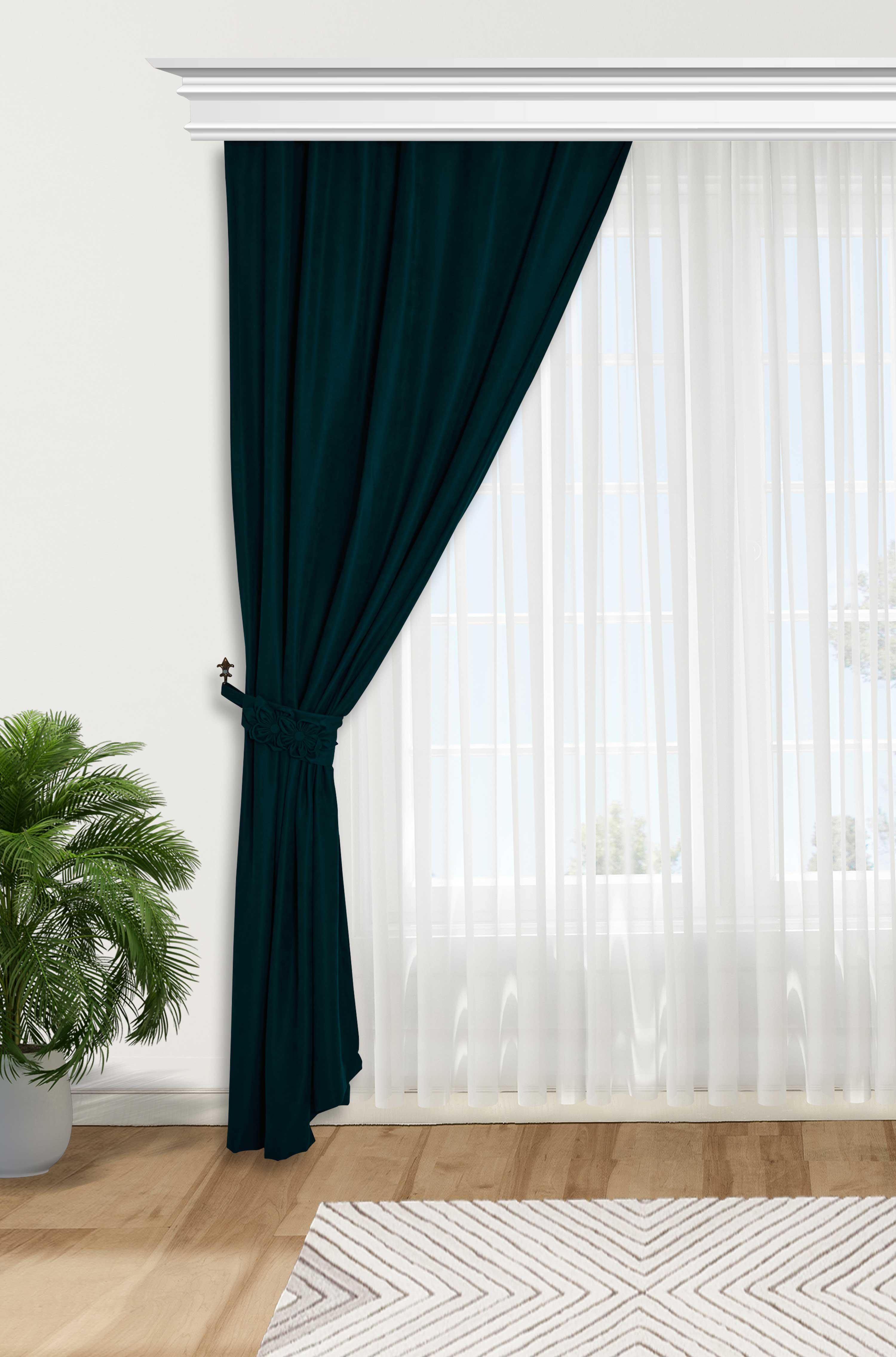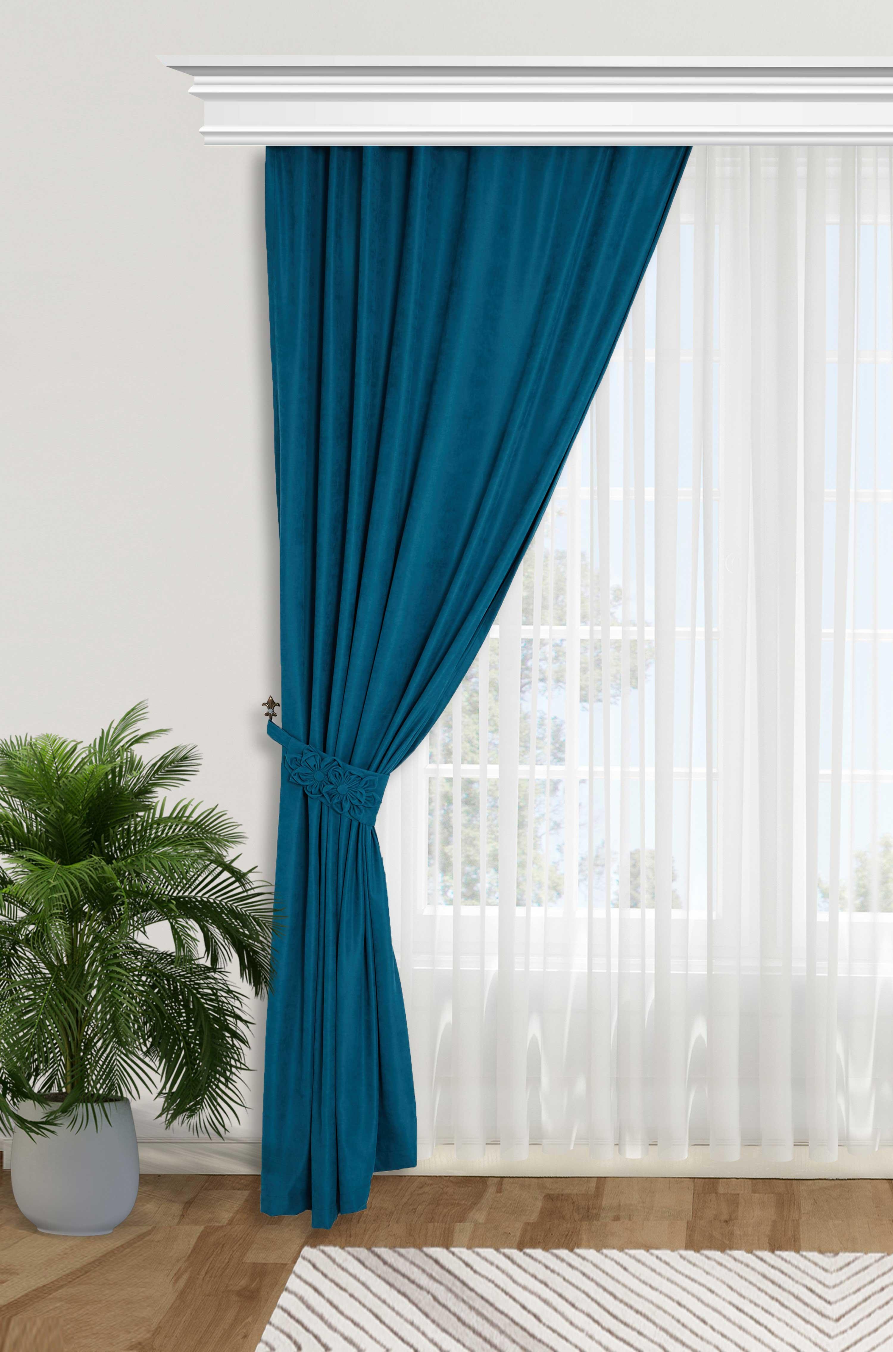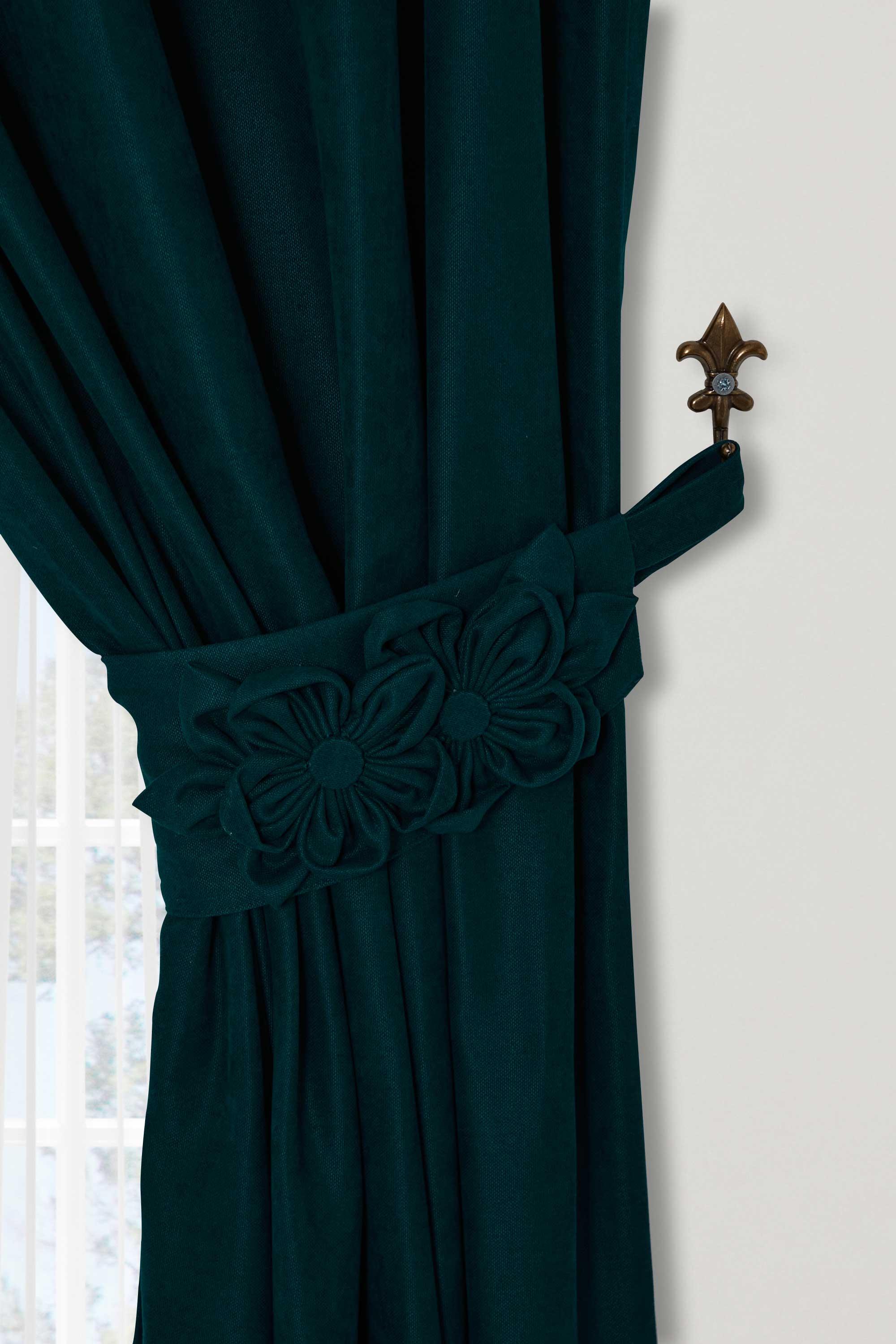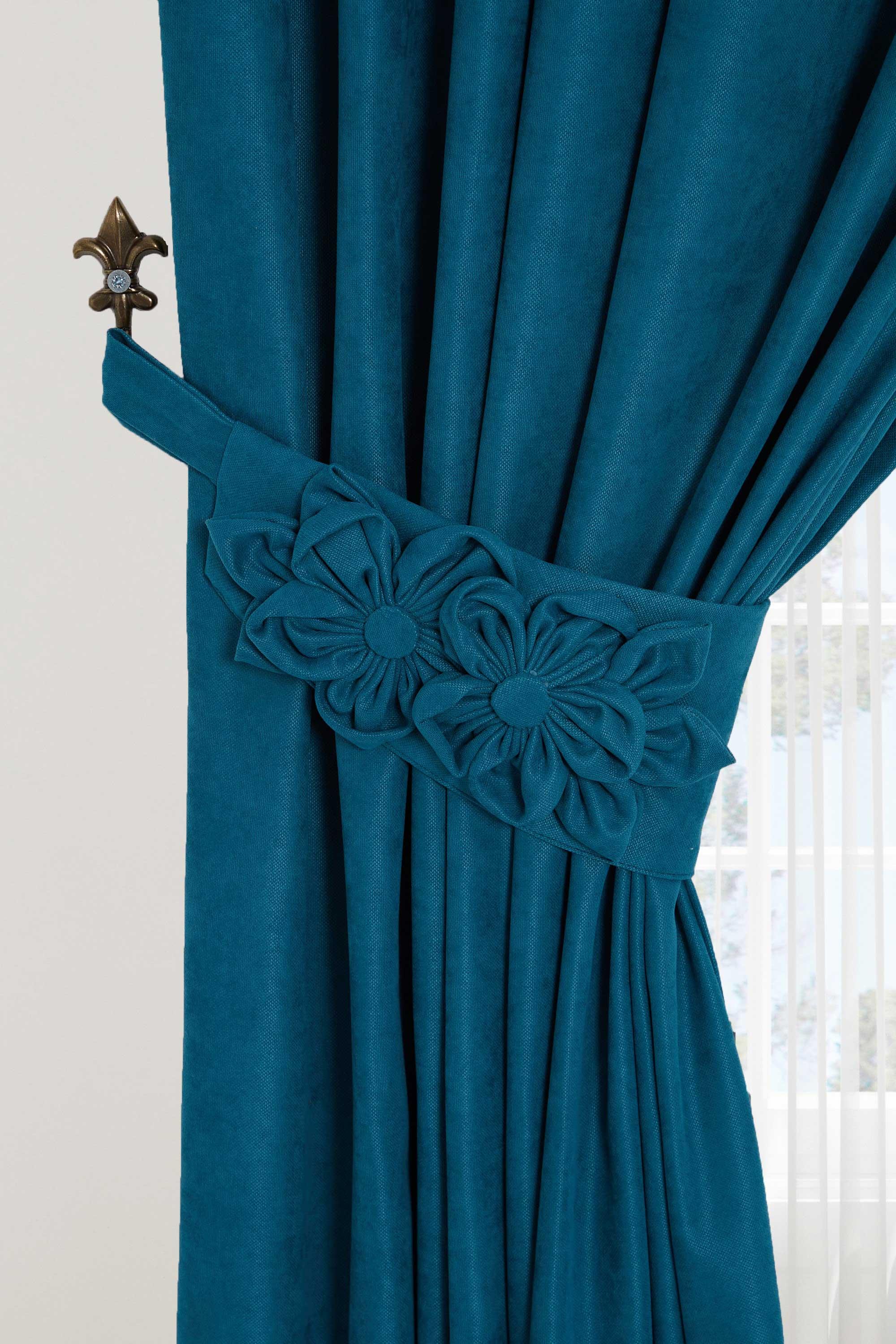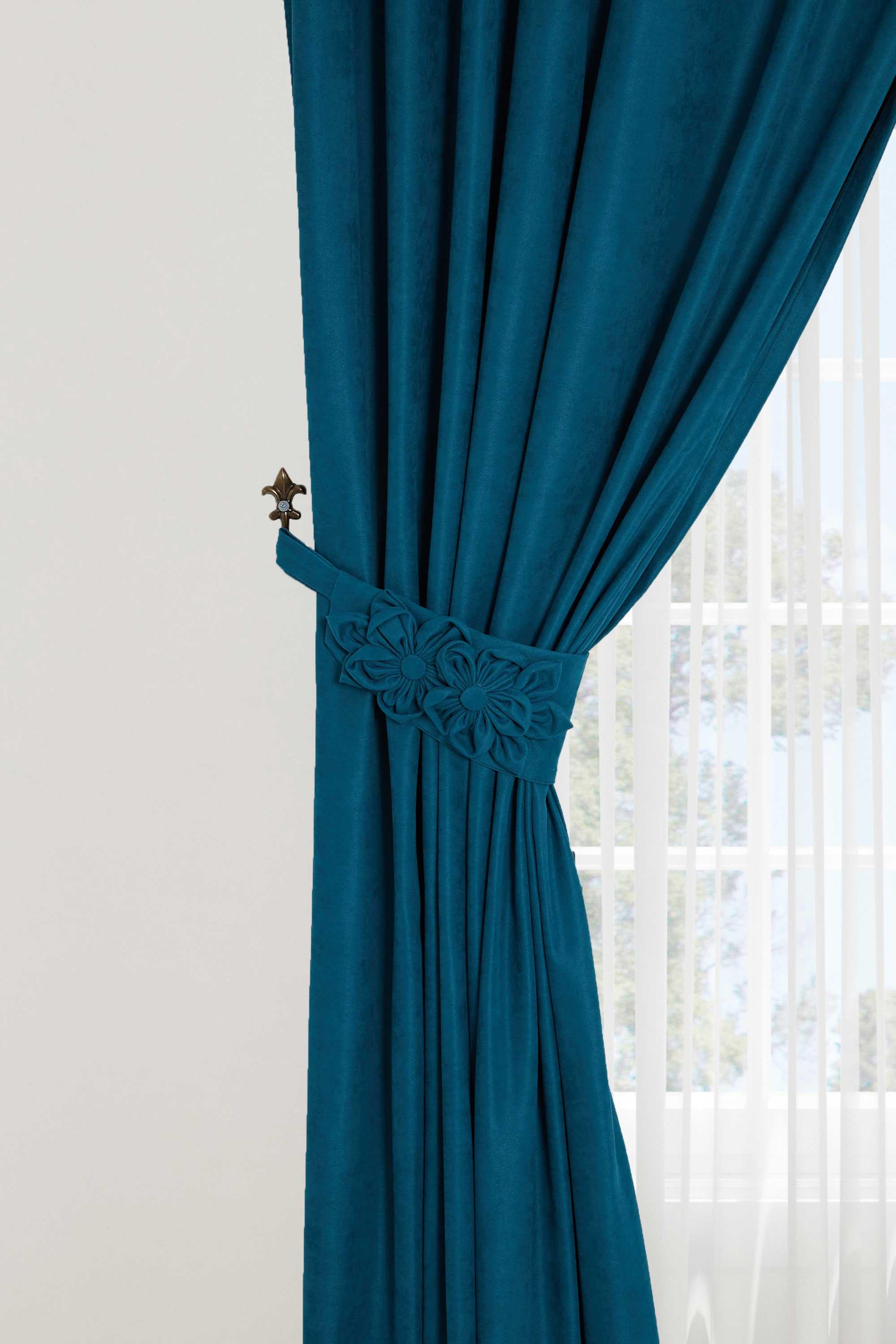 Çiçek Aksesuarlı Fon Perde Sol Kenar,PR-3SOL Petrol Mavisi