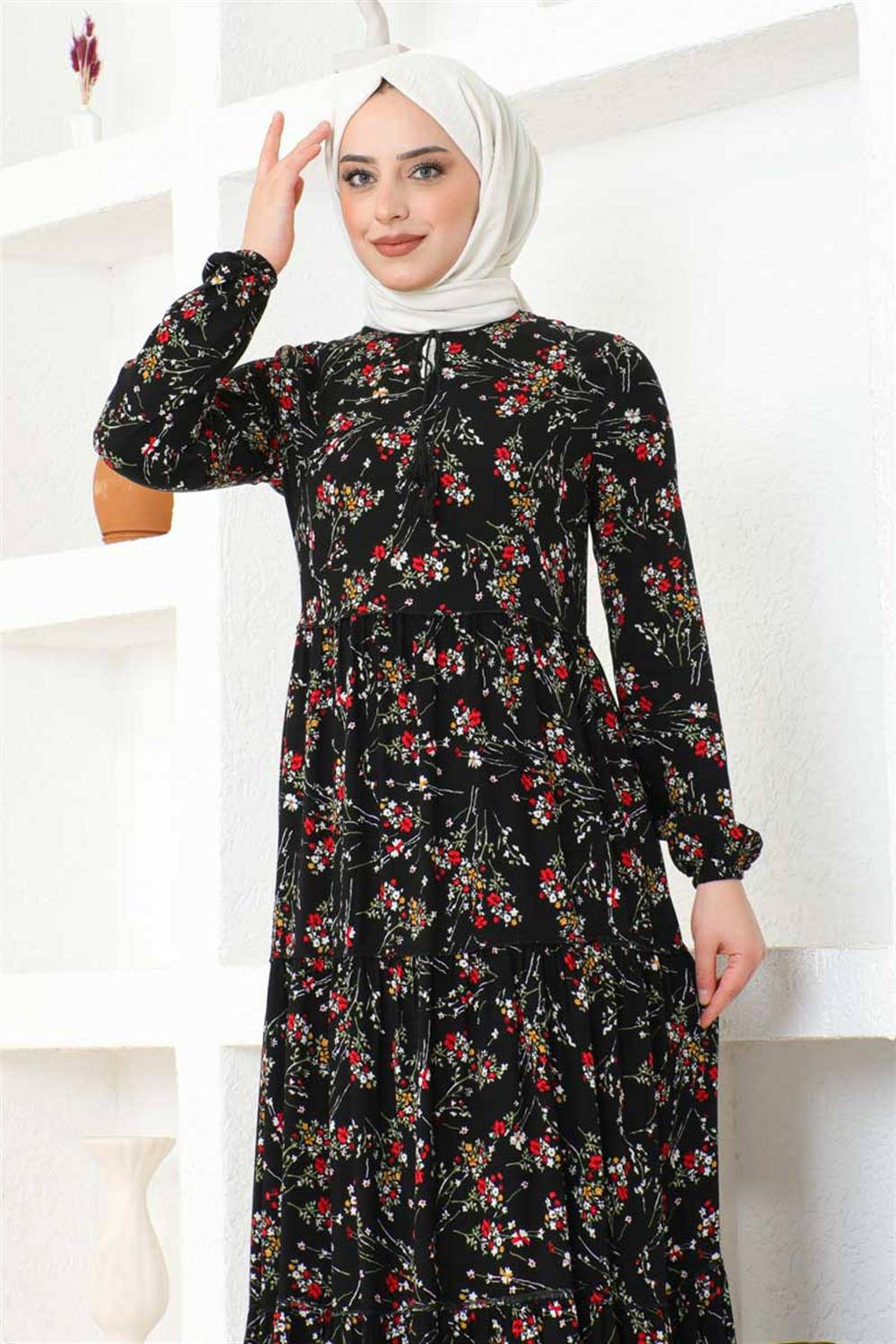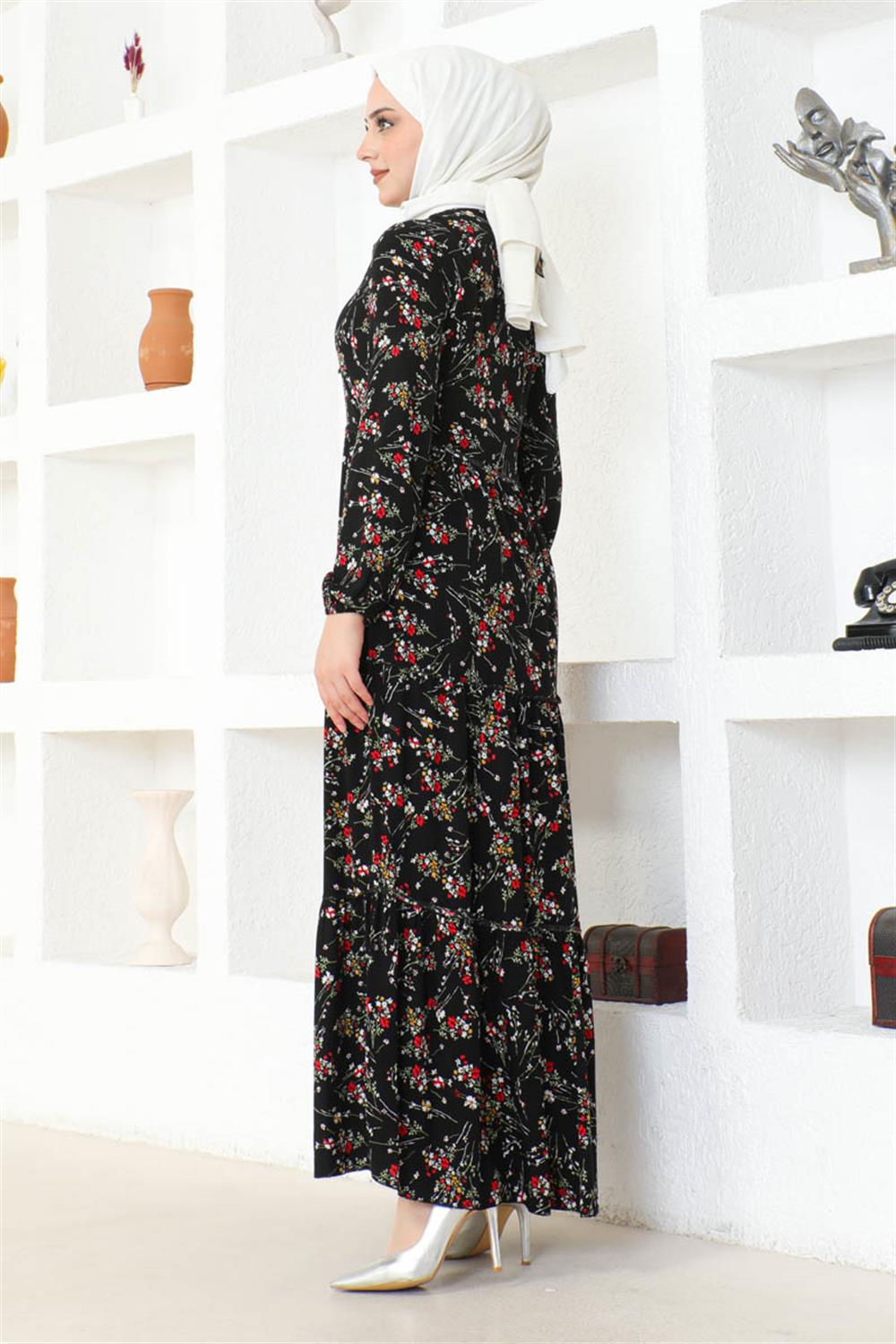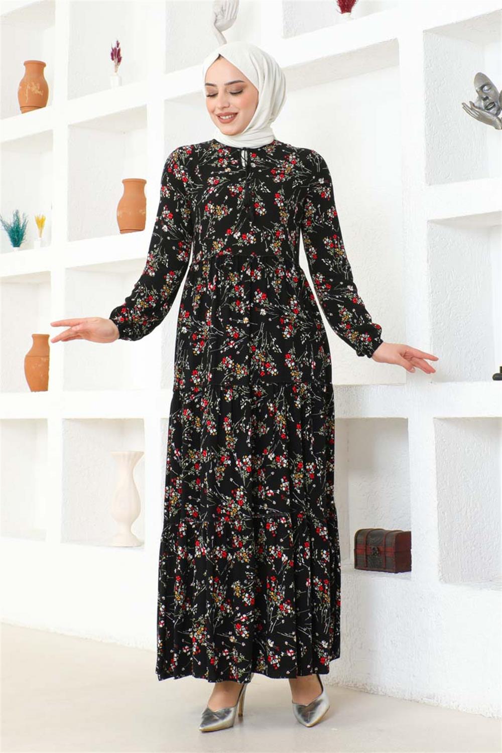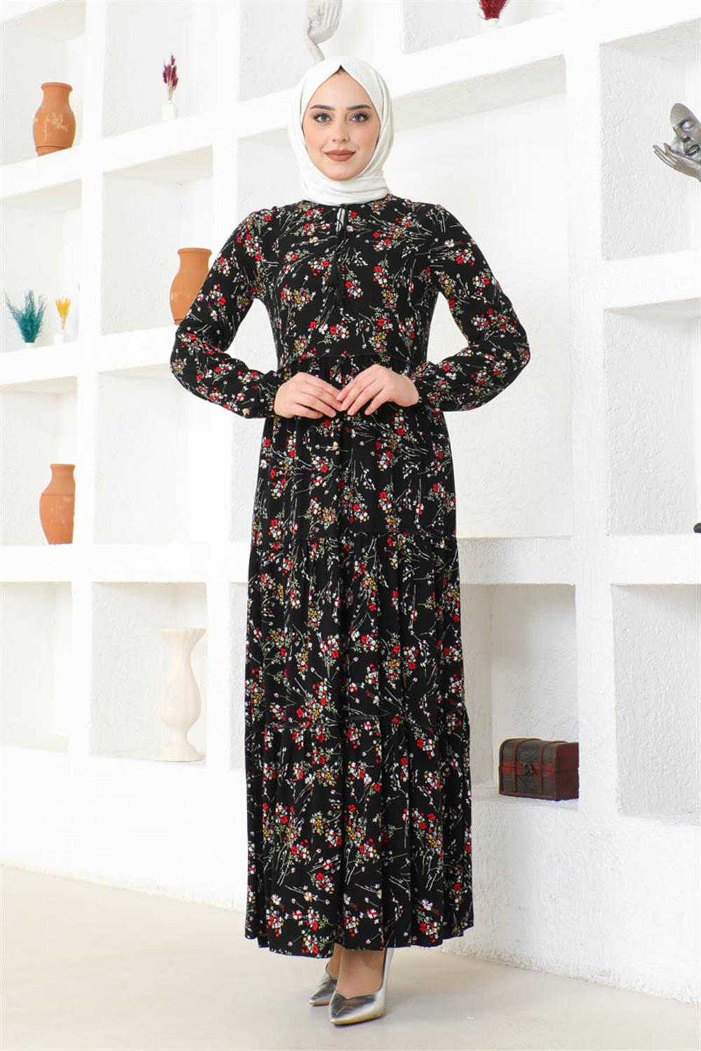 Çiçek Desenli Viskon Elbise SİYAH
