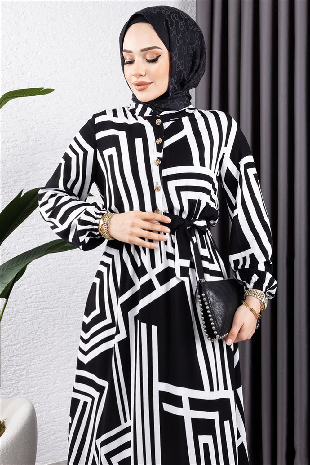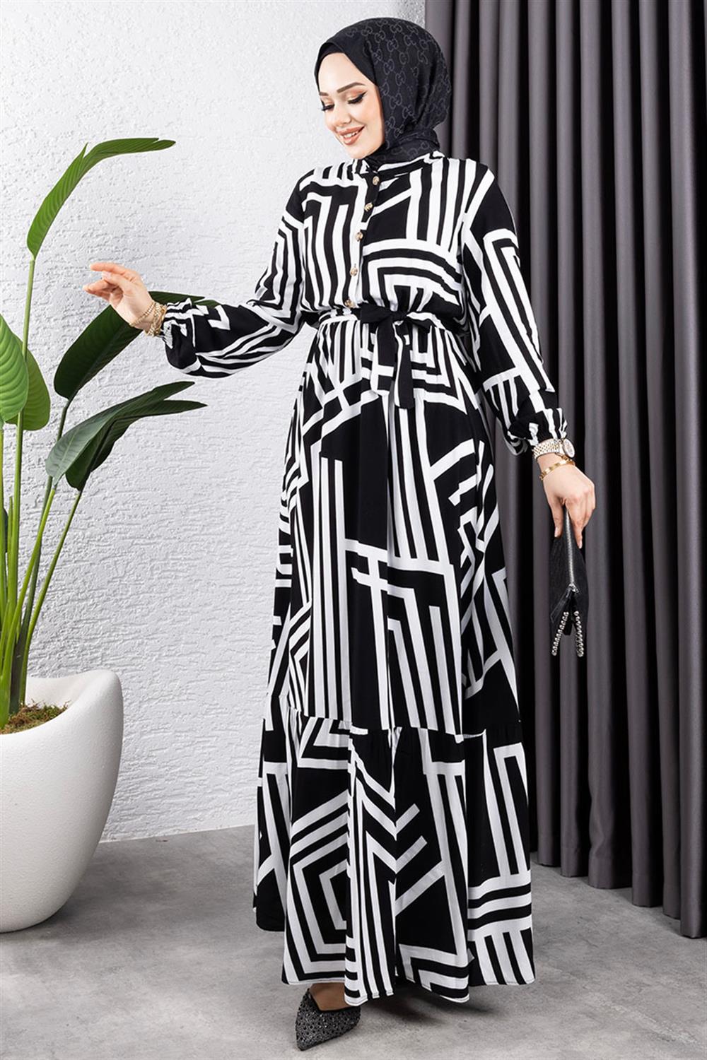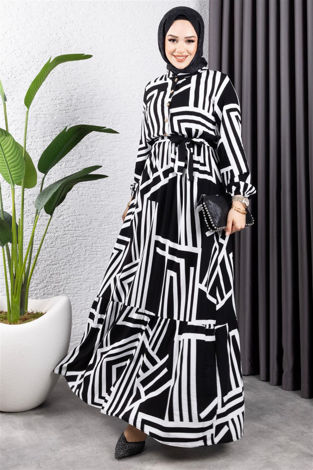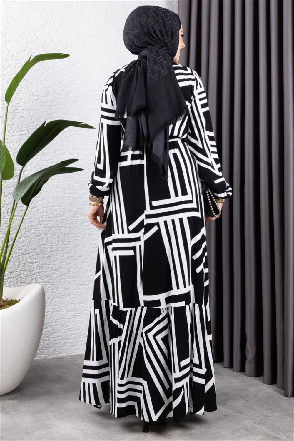 Çizgili Viskon Elbise SİYAH