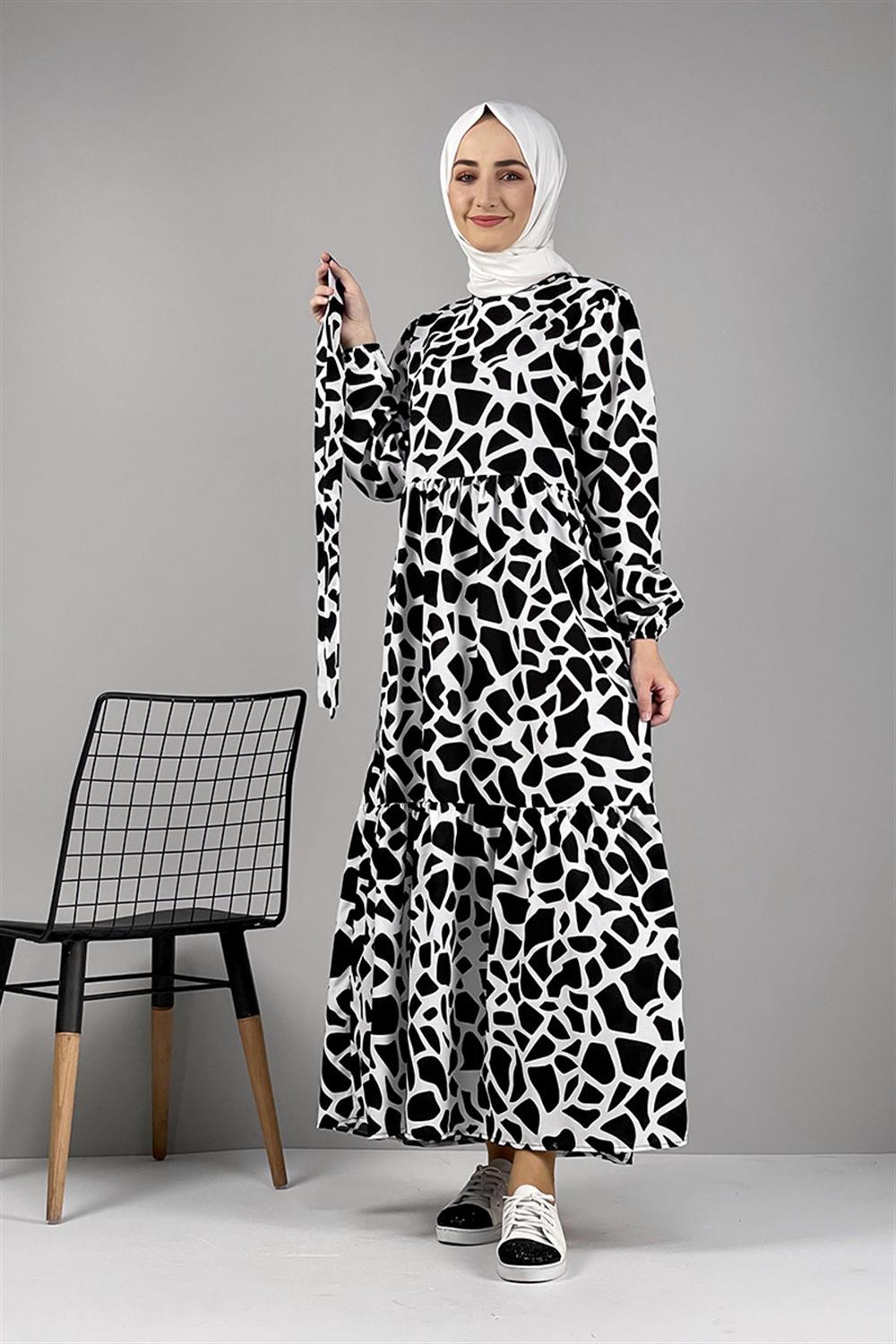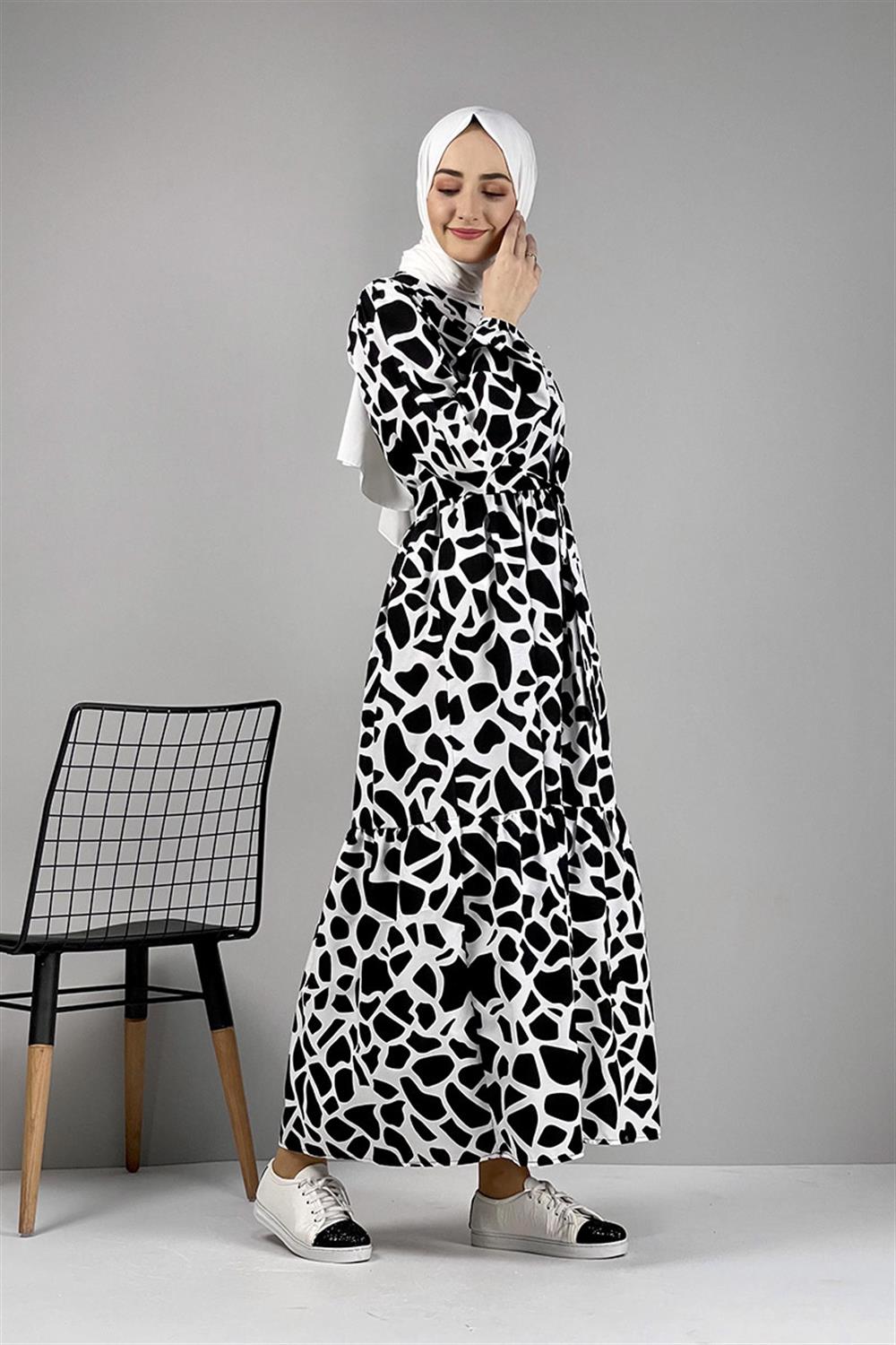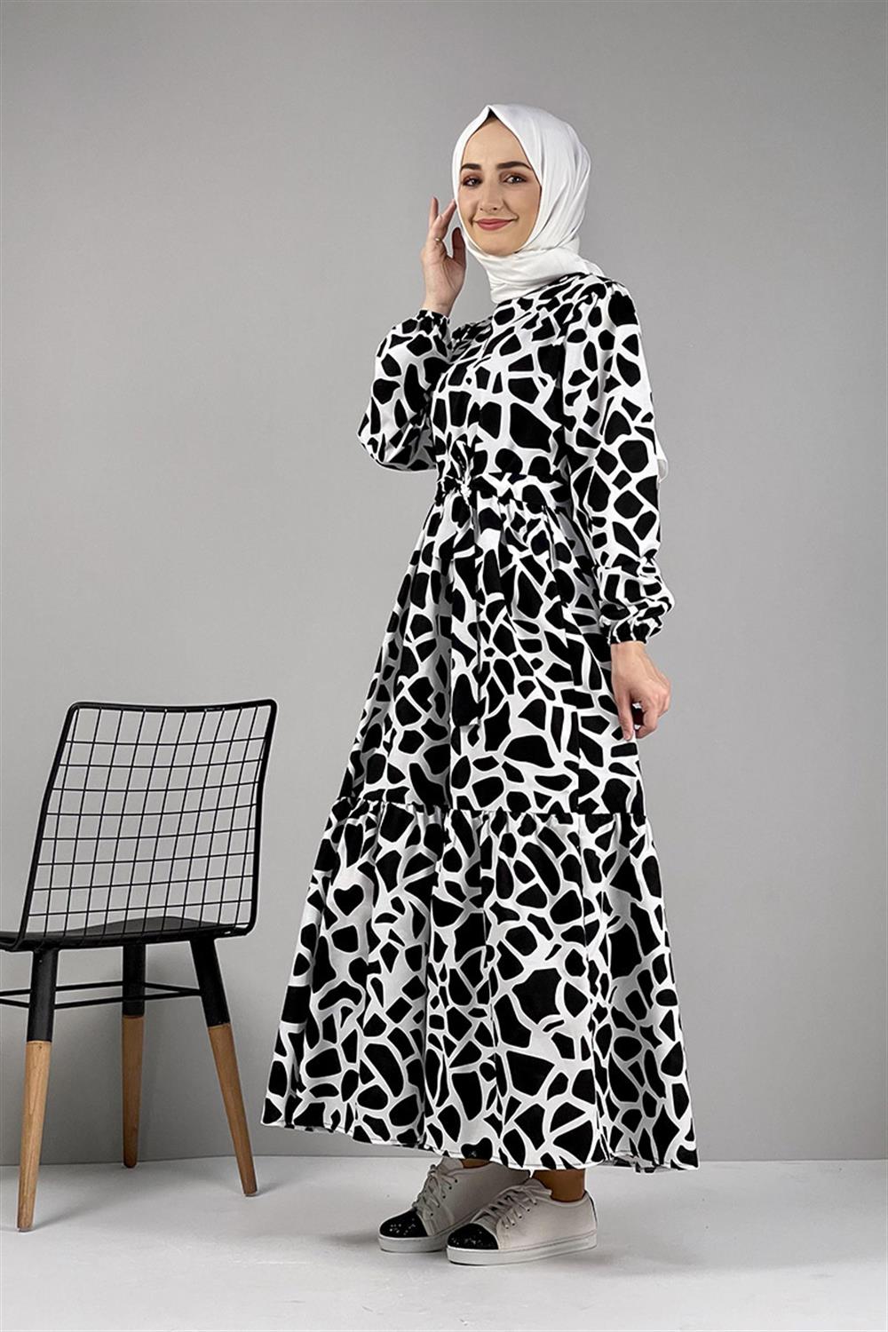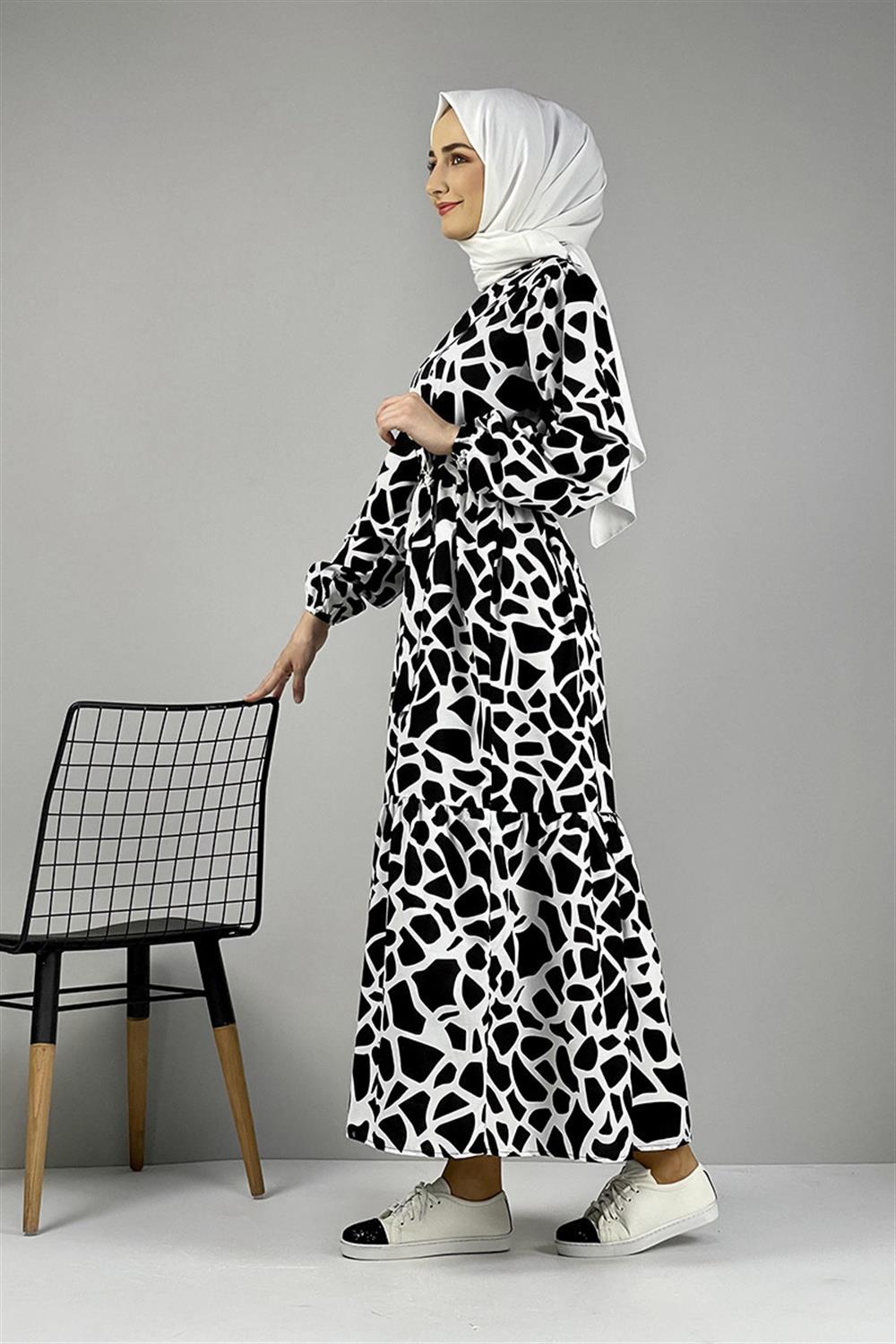 Desenli Tesettür Elbise Siyah