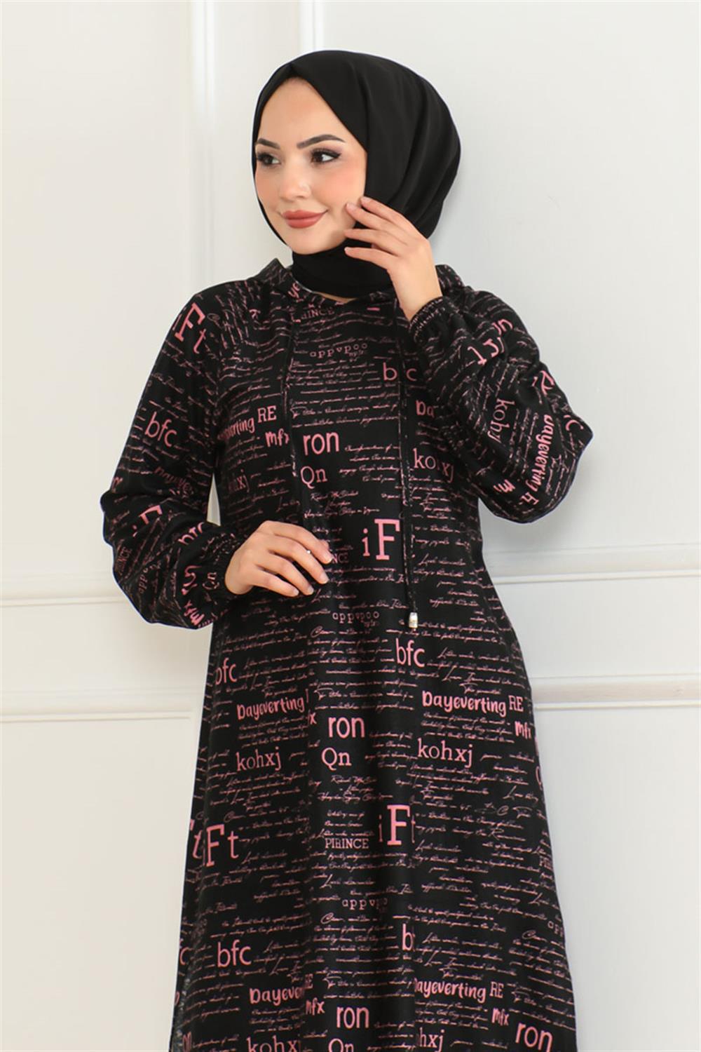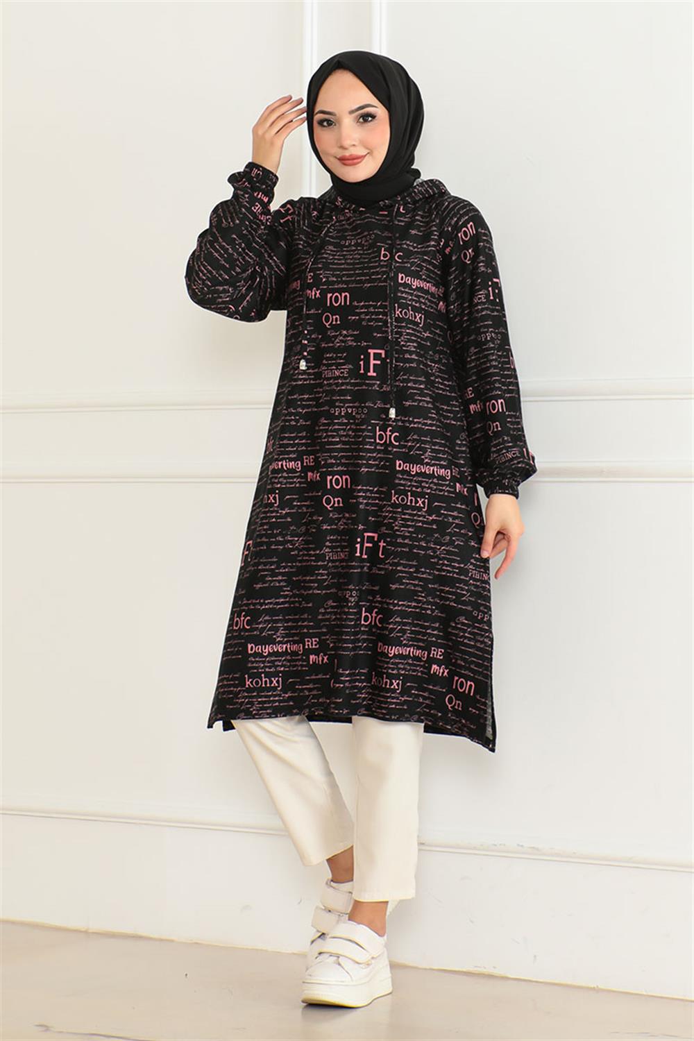 Desenli Kapşonlu Spor Tunik GÜLKURUSU SİYAH