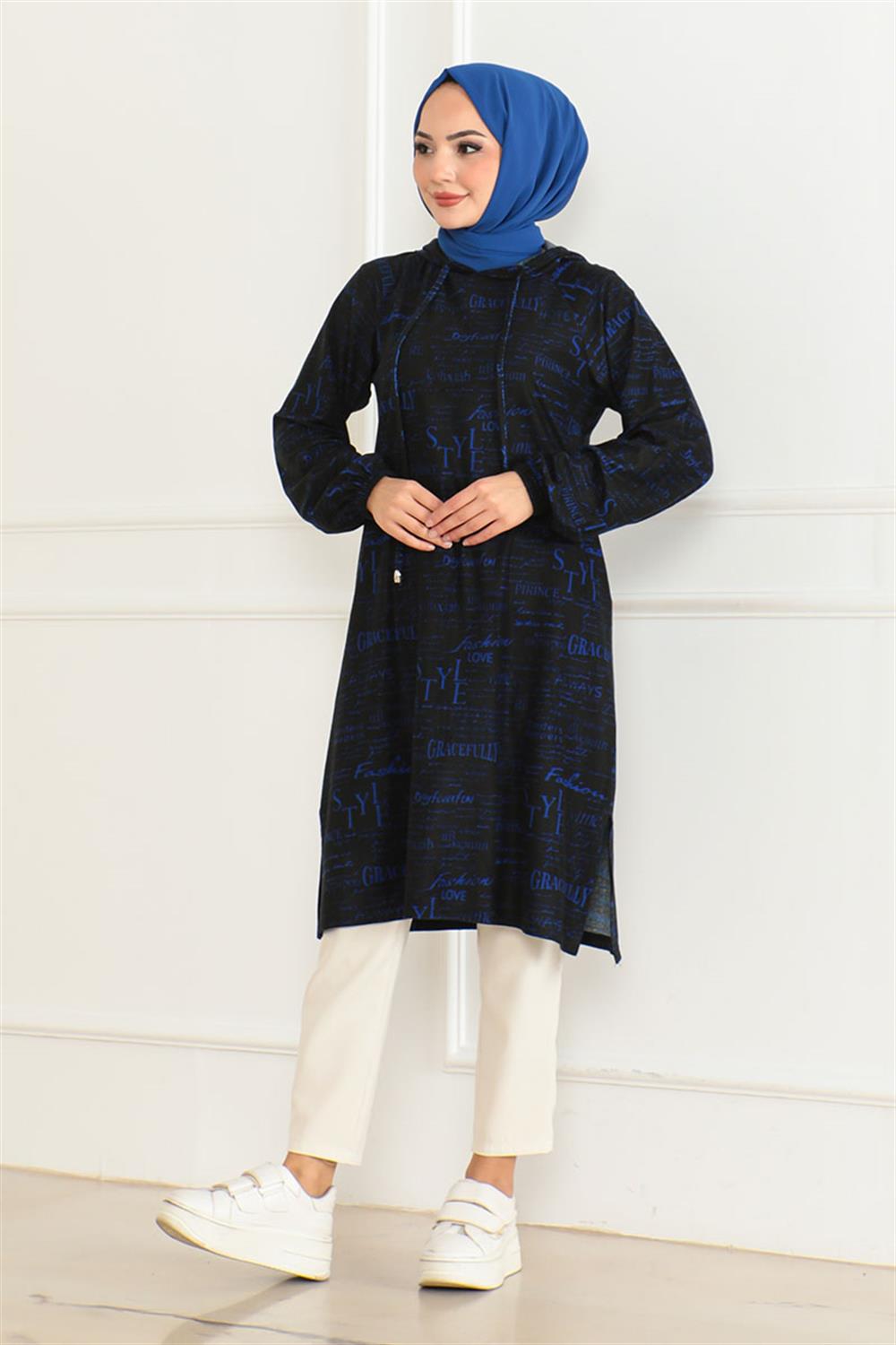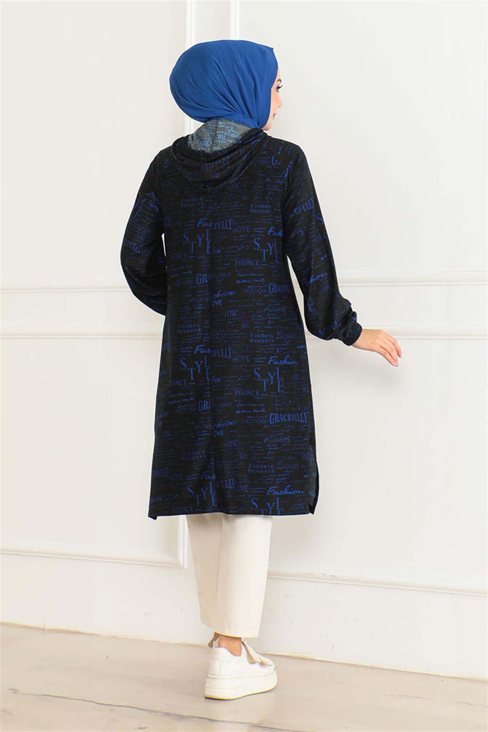 Desenli Kapşonlu Spor Tunik SAKS MAVİSİ SİYAH