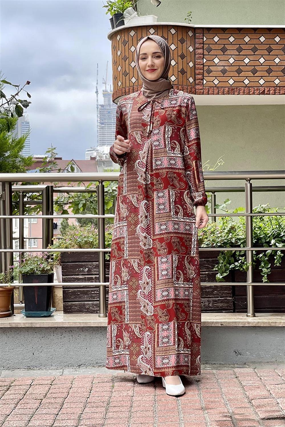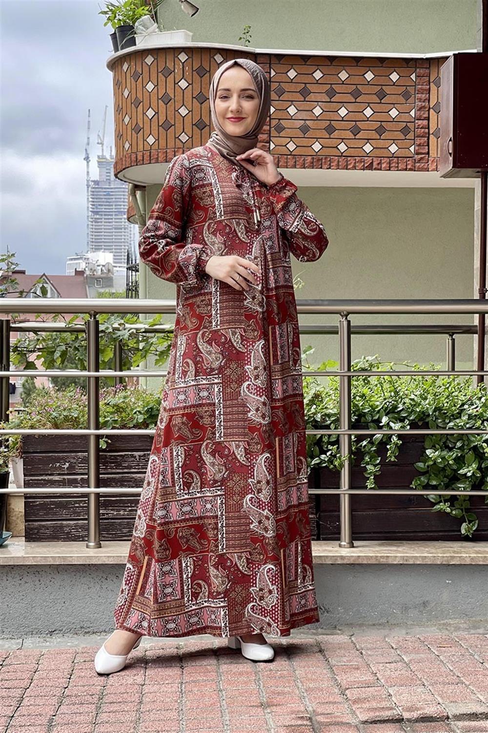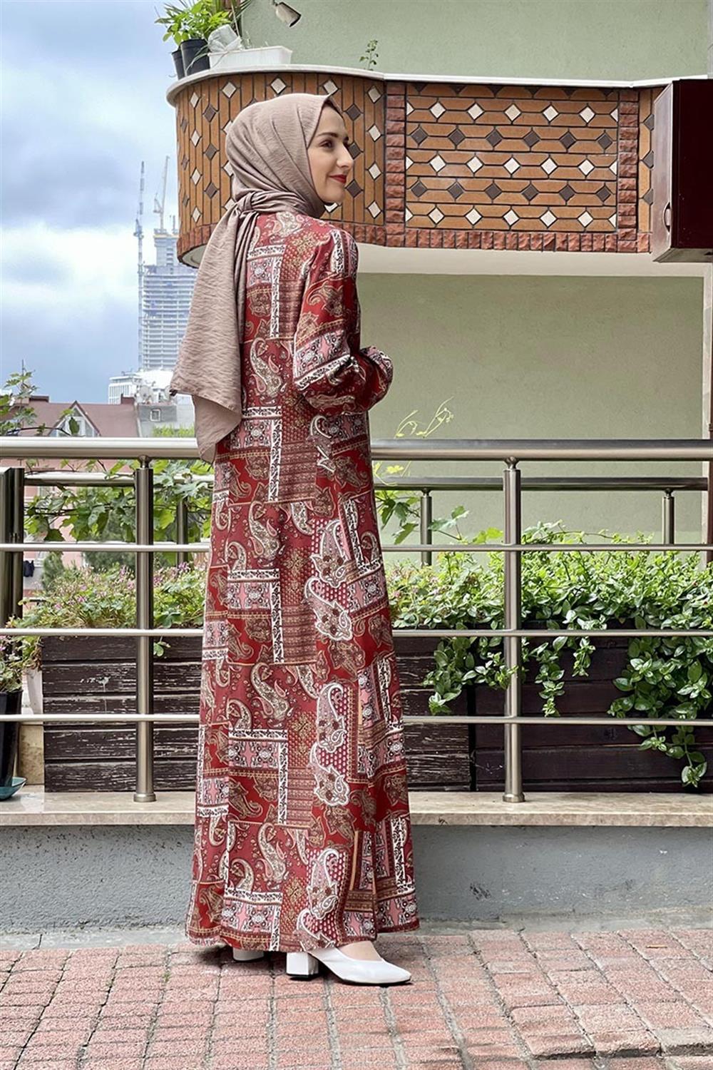 Desenli Tesettür Elbise Kiremit