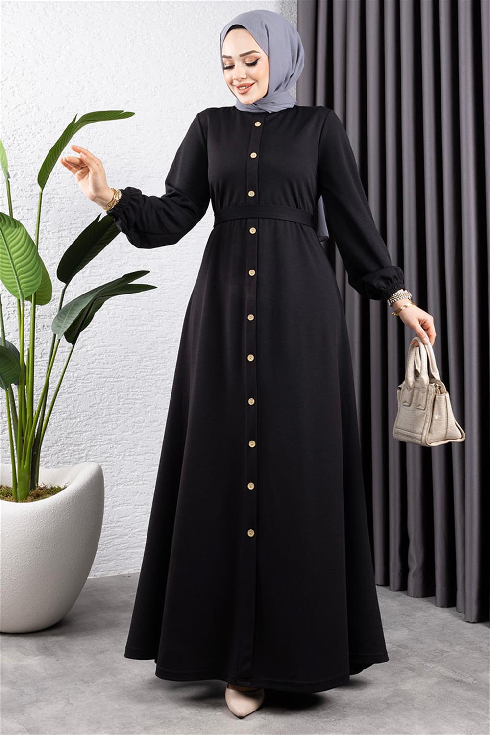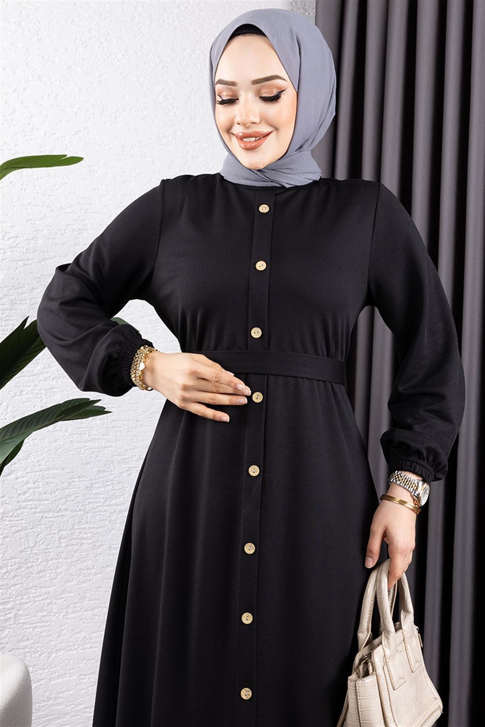 Düğme Detaylı Kemerli Elbise SİYAH