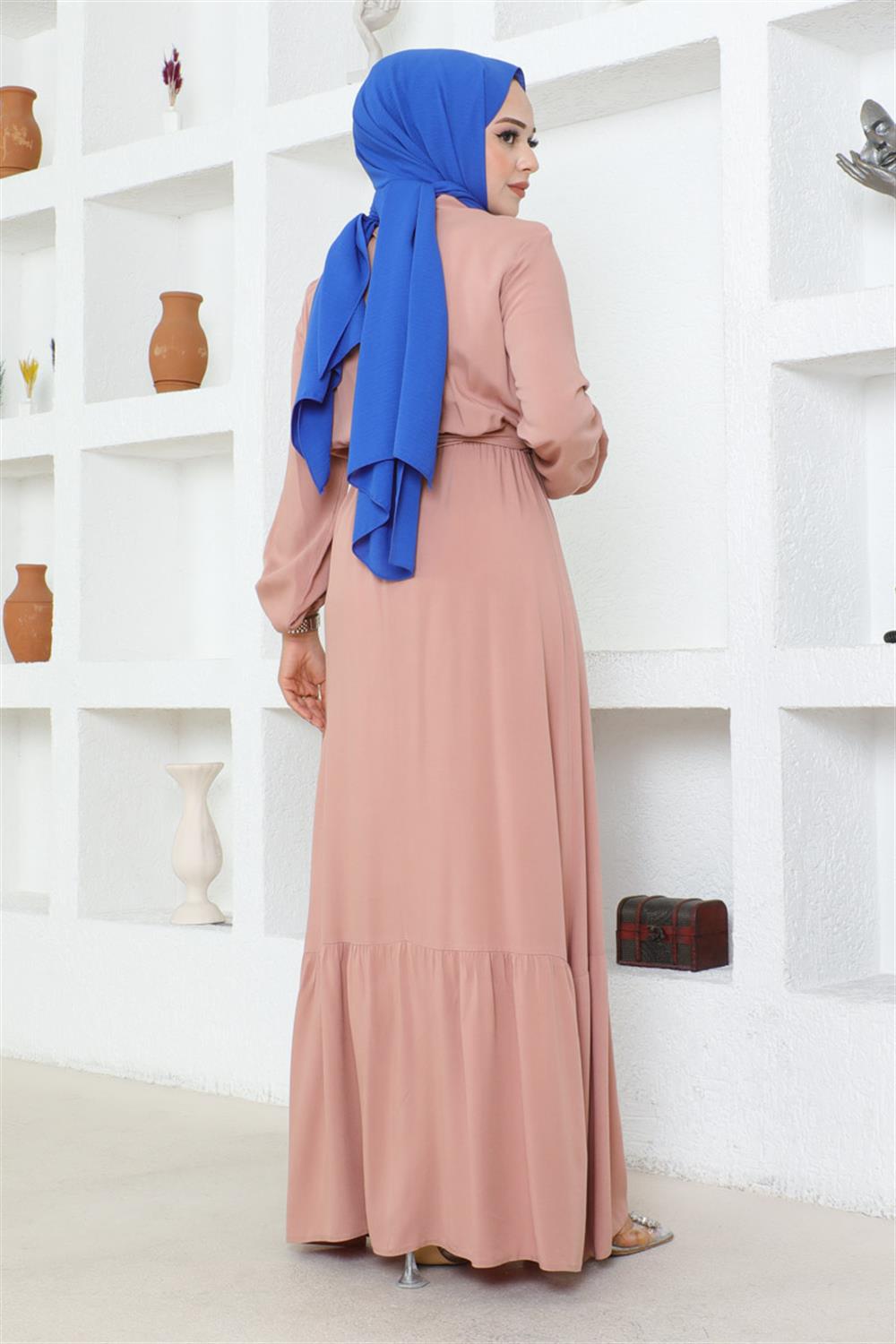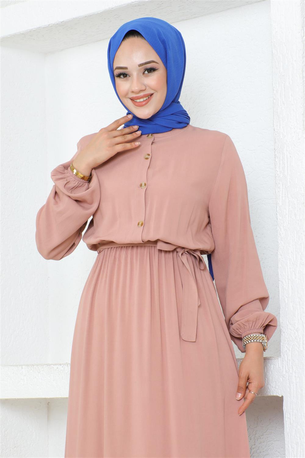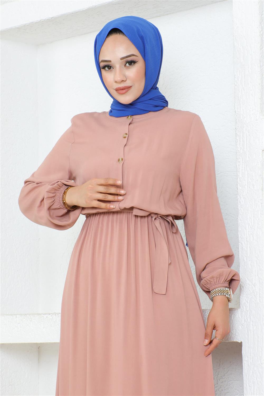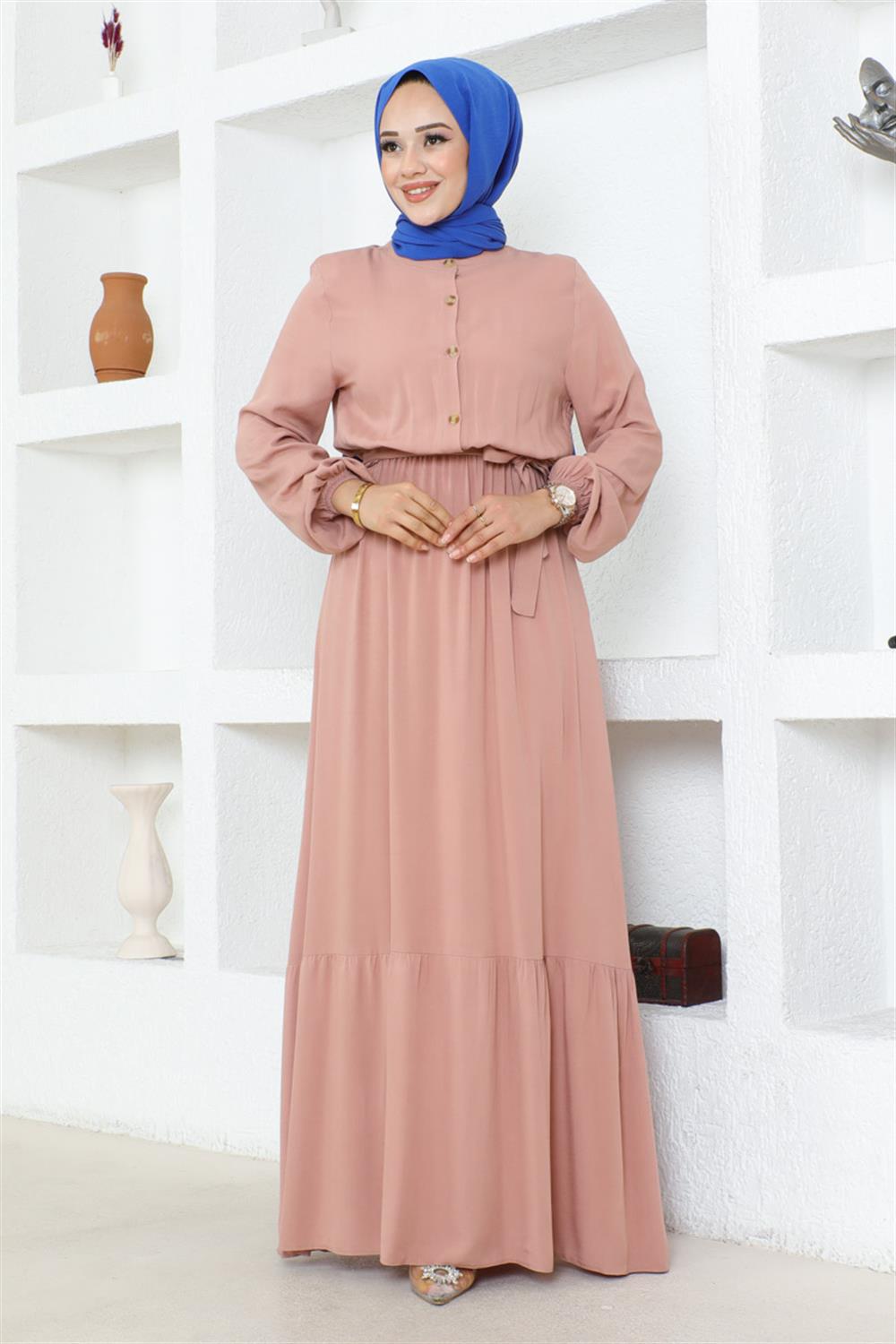 Uzun kolludur. Kolları lastiklidir.Büzgülere kadar düğme detayı bulunmaktadır