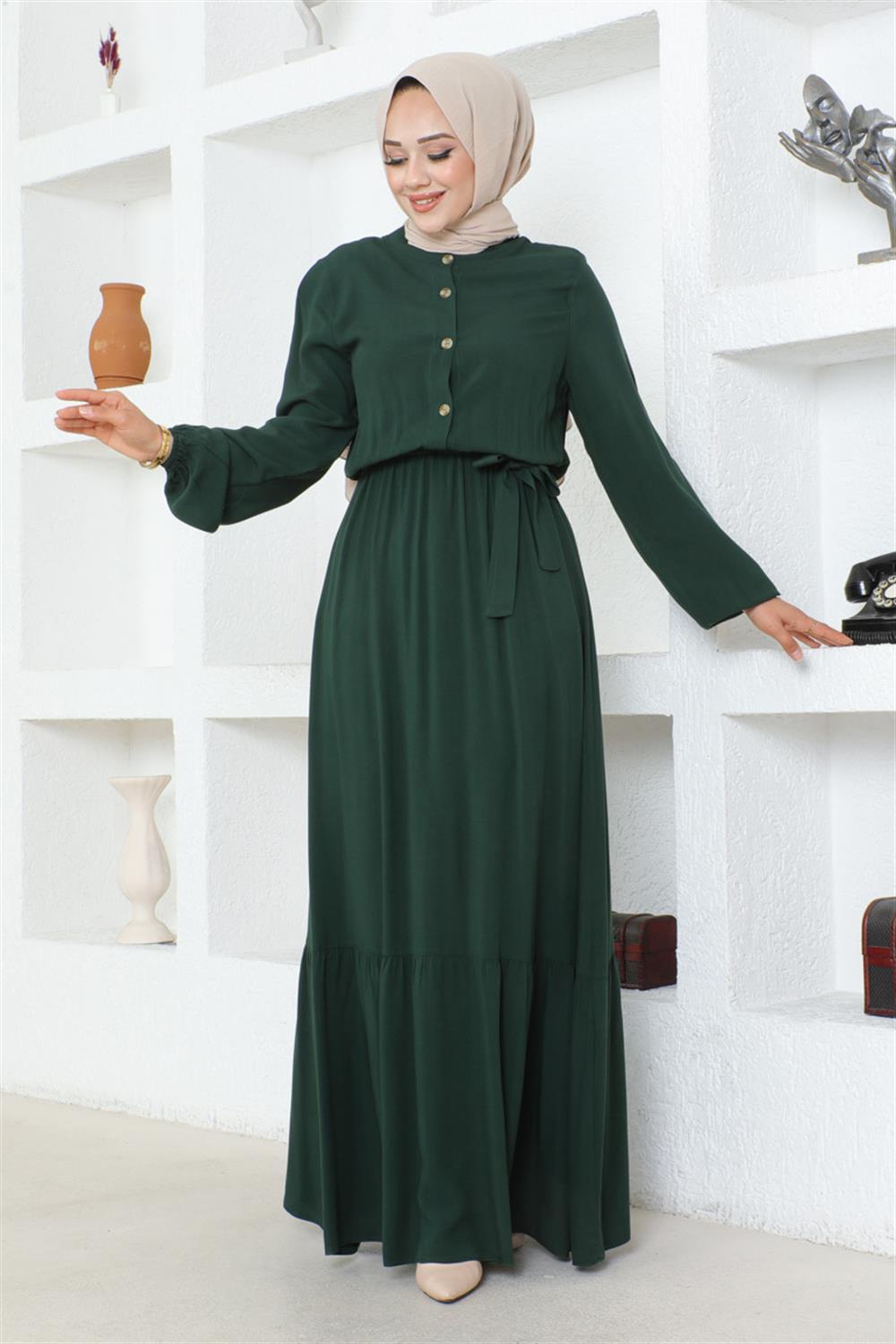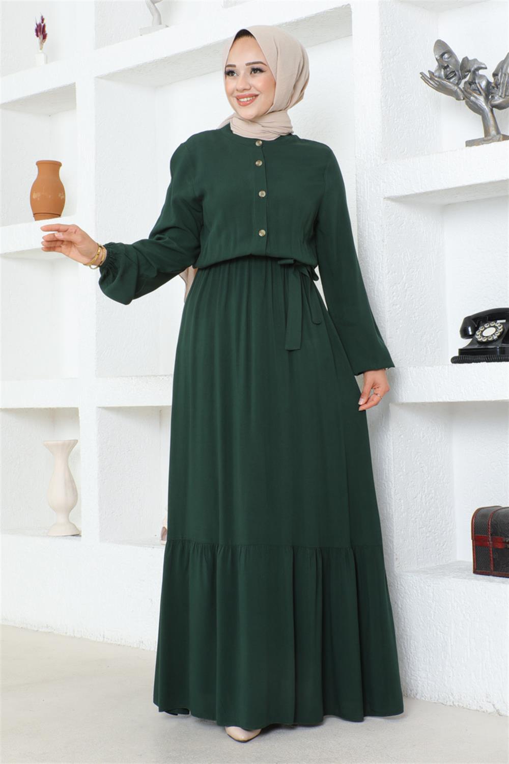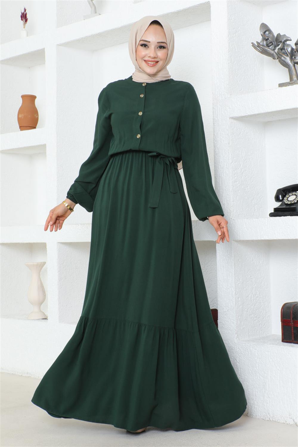 Düğme Detaylı Viskon Elbise ZÜMRÜT YEŞİLİ