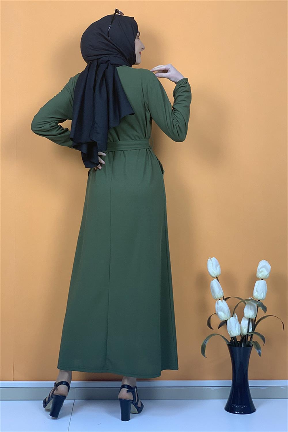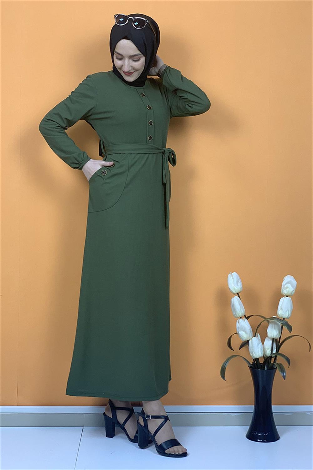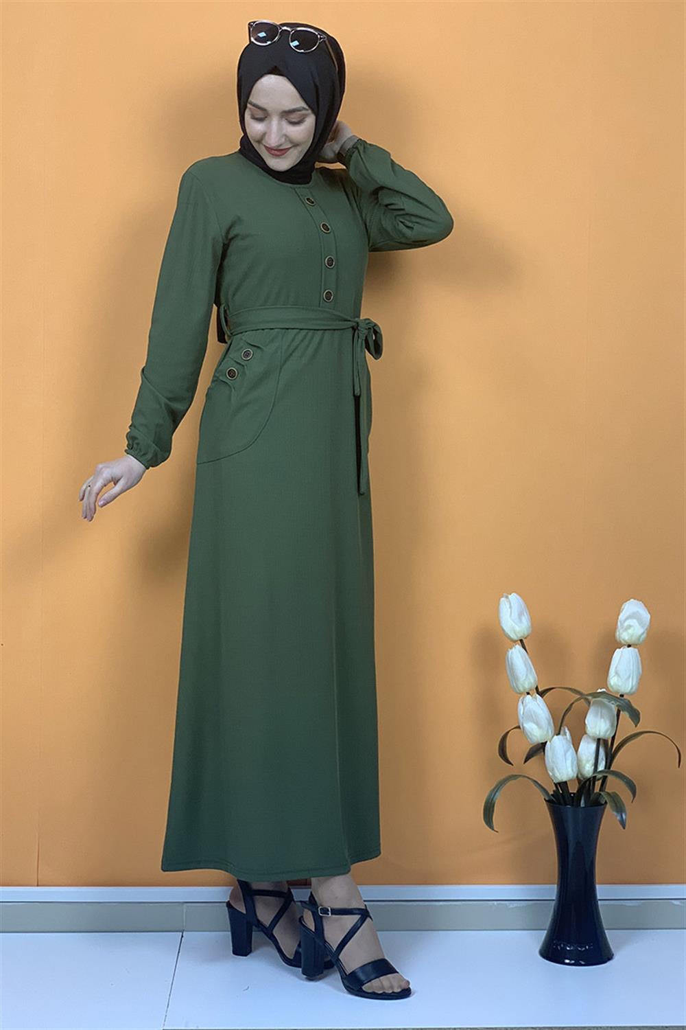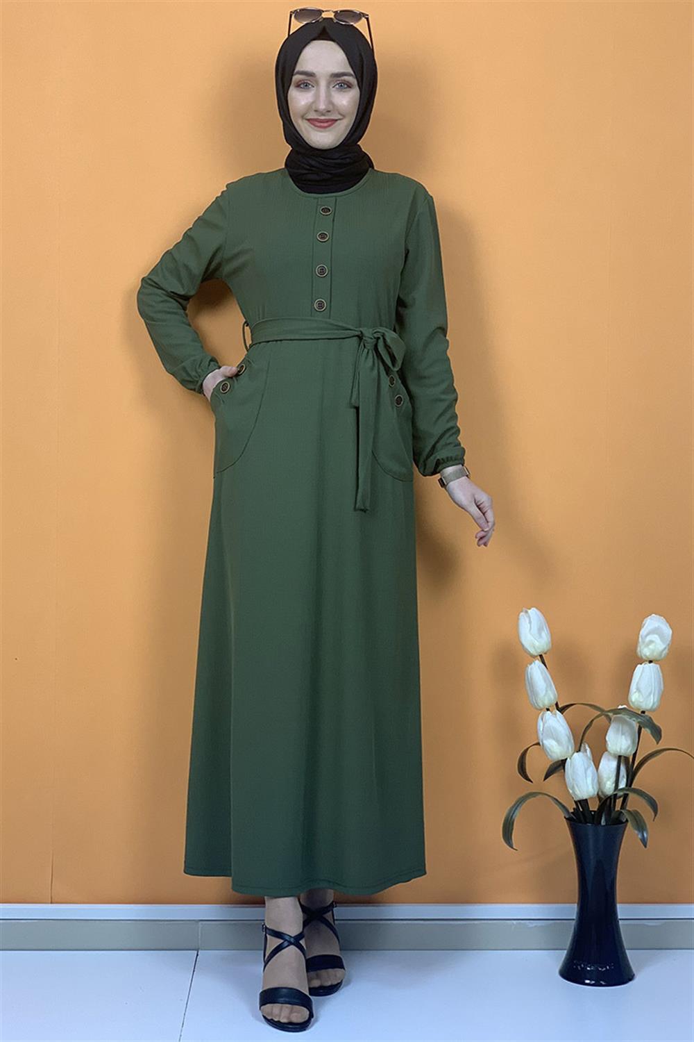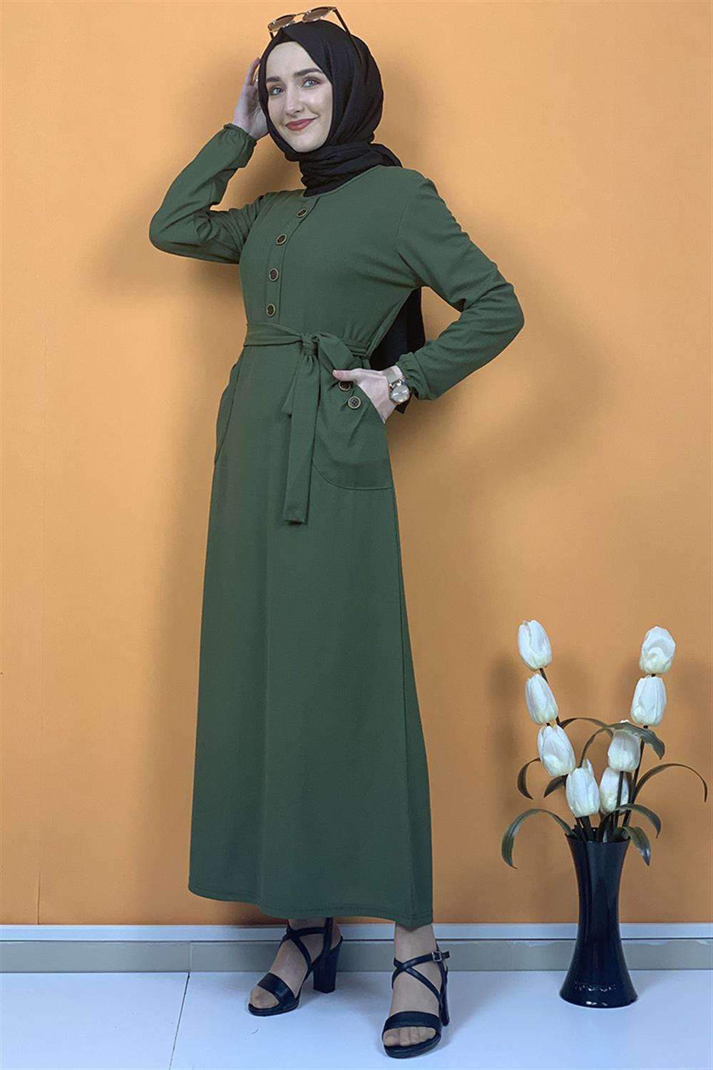 Düğme Ve Cep Detaylı Elbise Haki