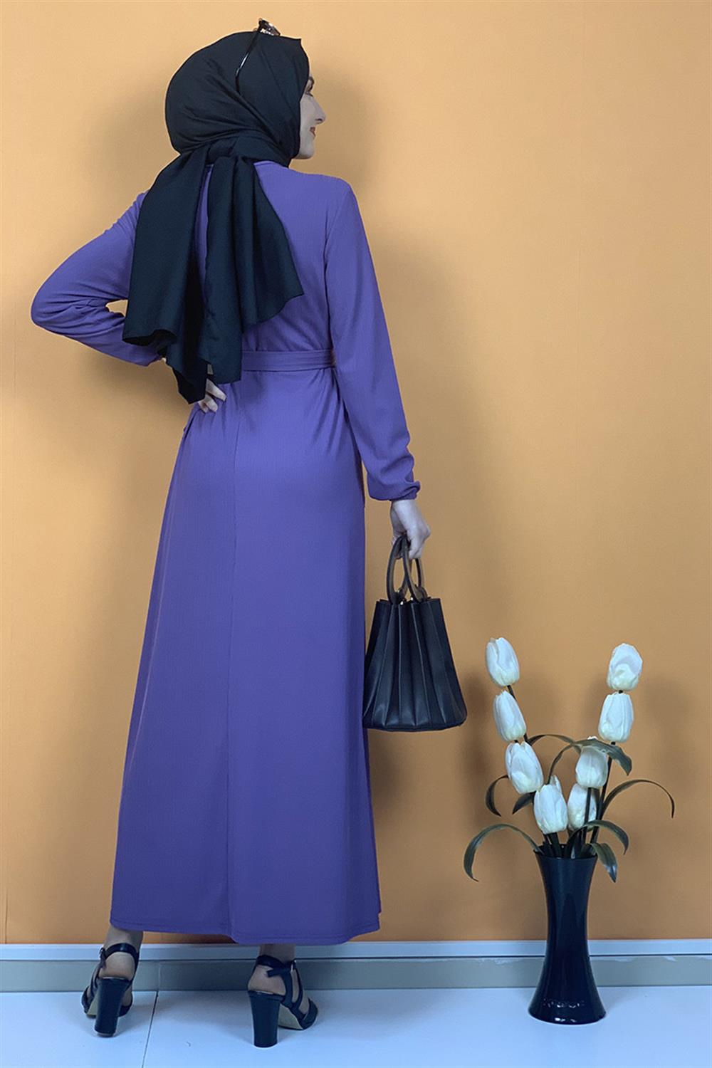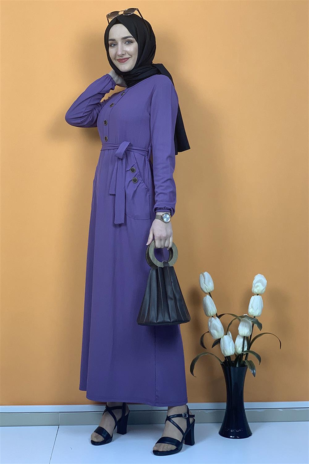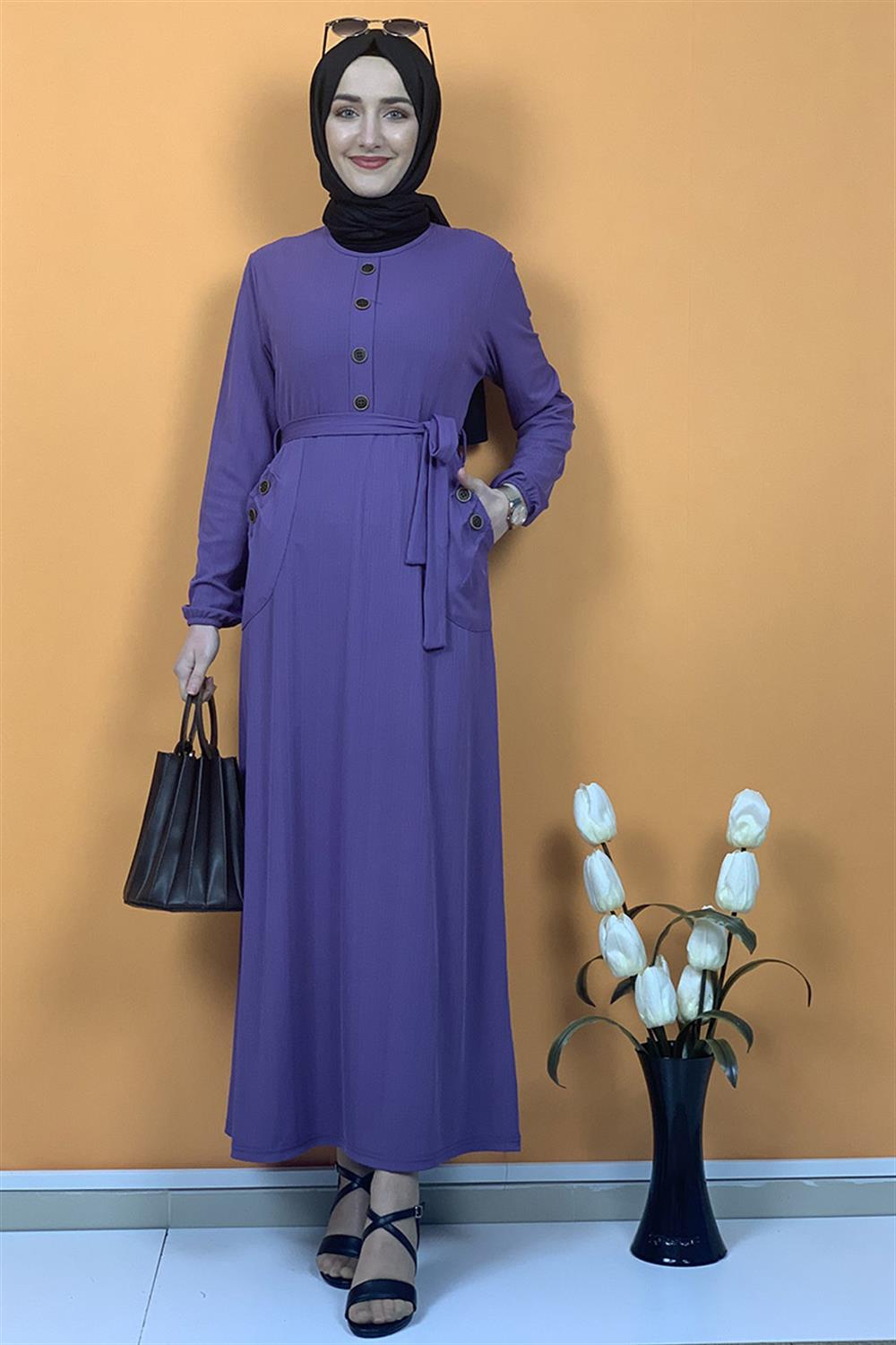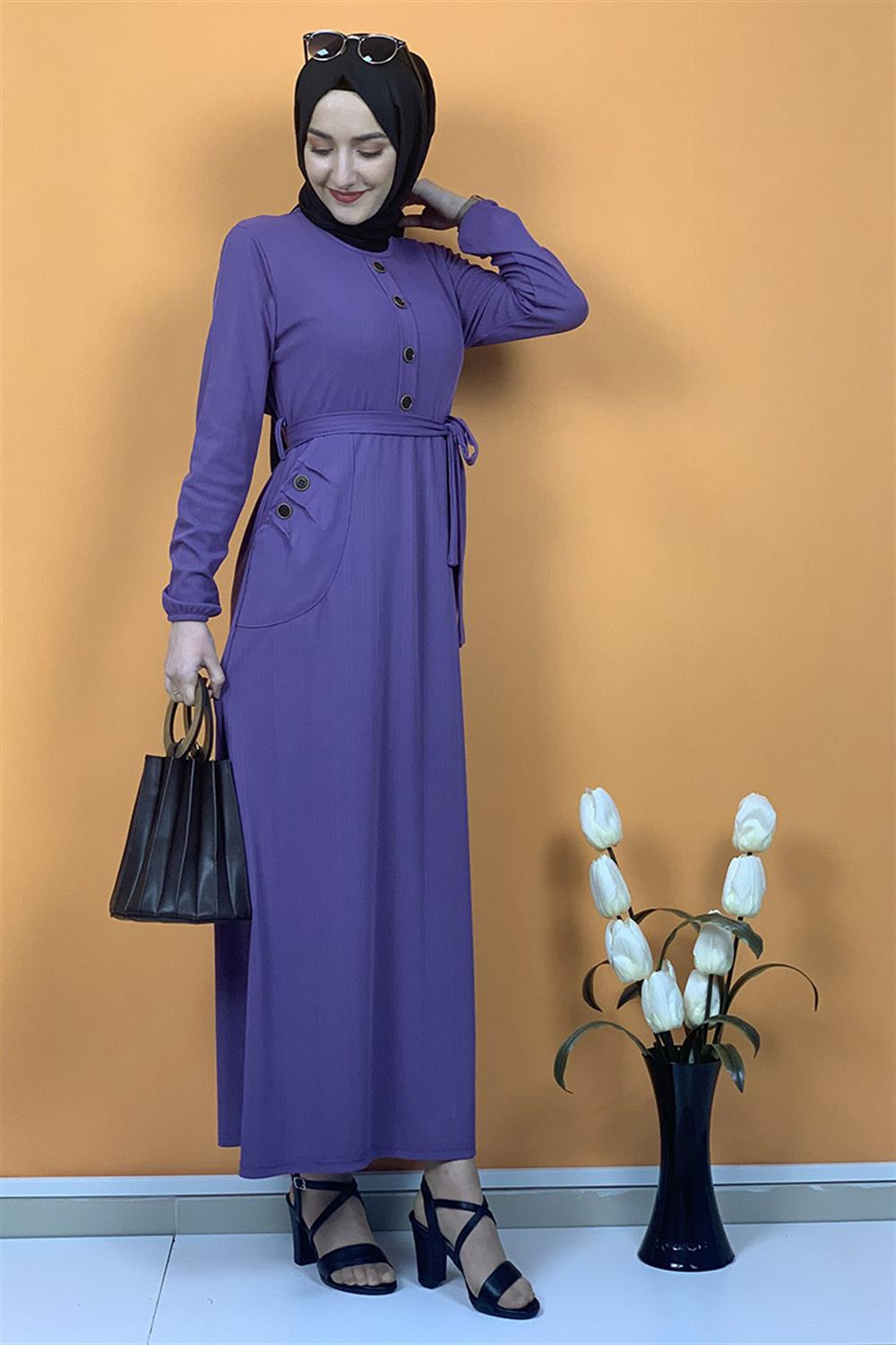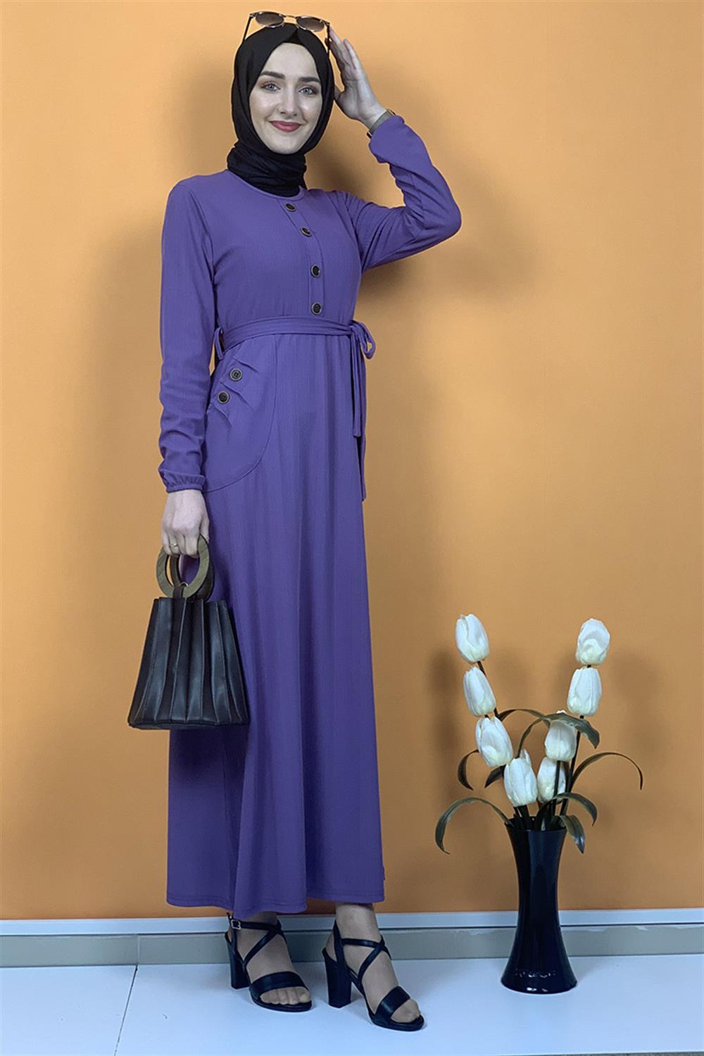 Düğme Ve Cep Detaylı Elbise Lila