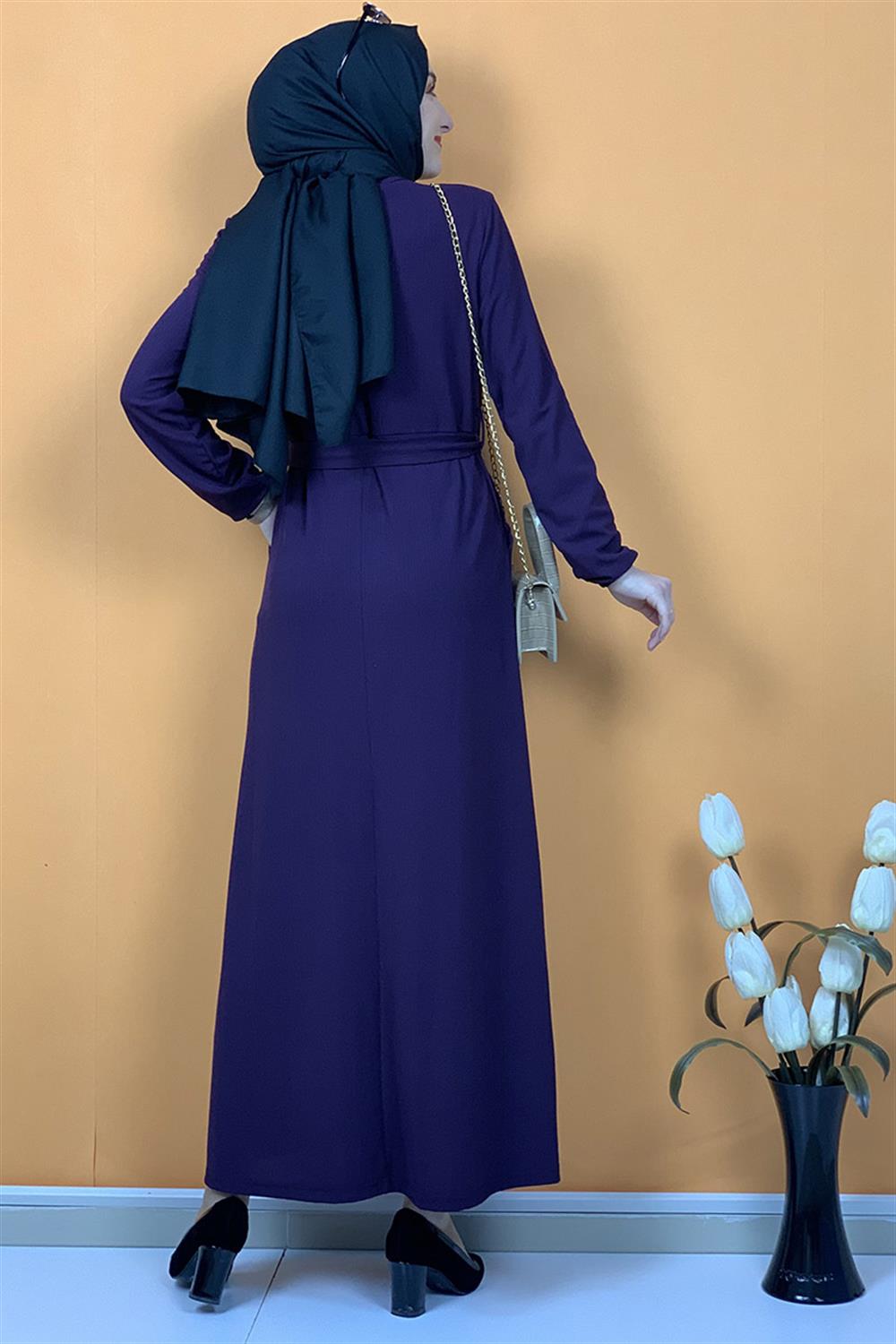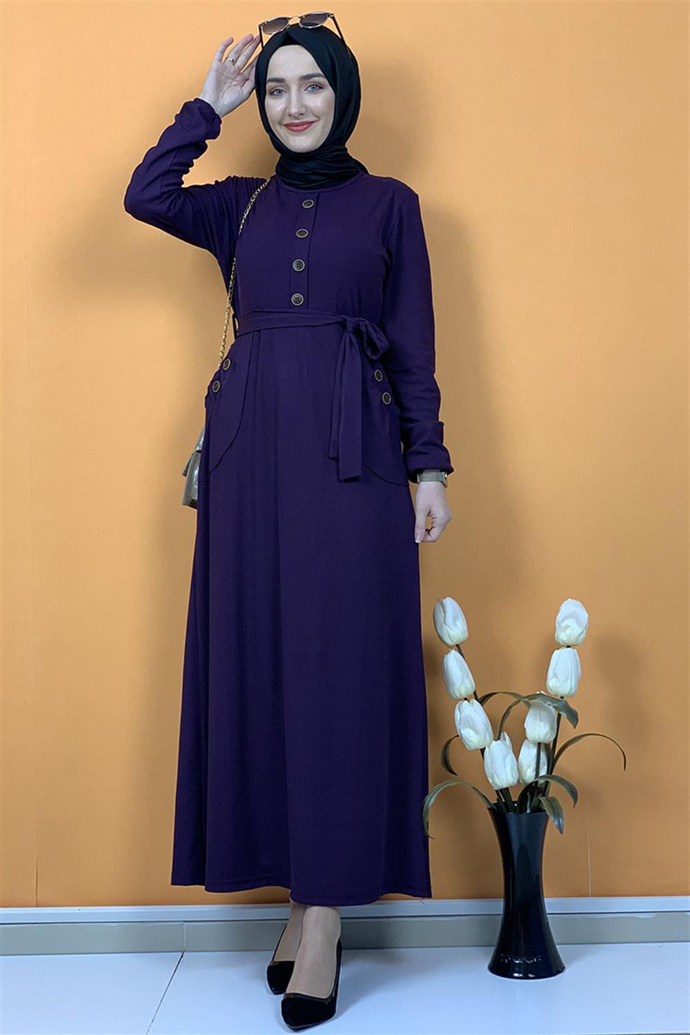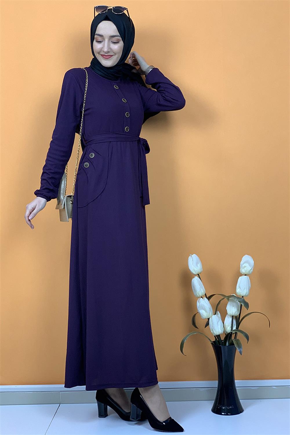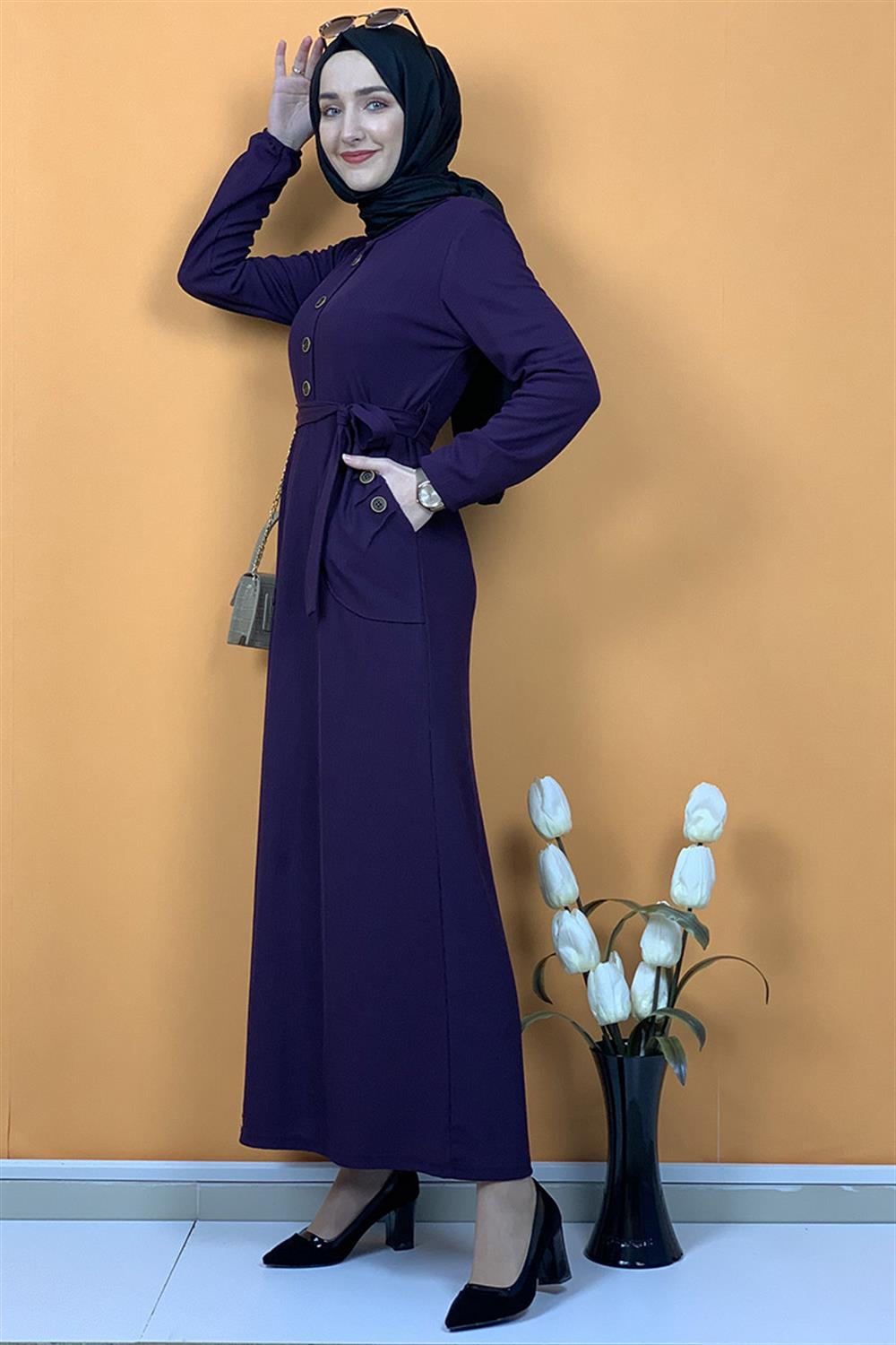 Düğme Ve Cep Detaylı Elbise Mor