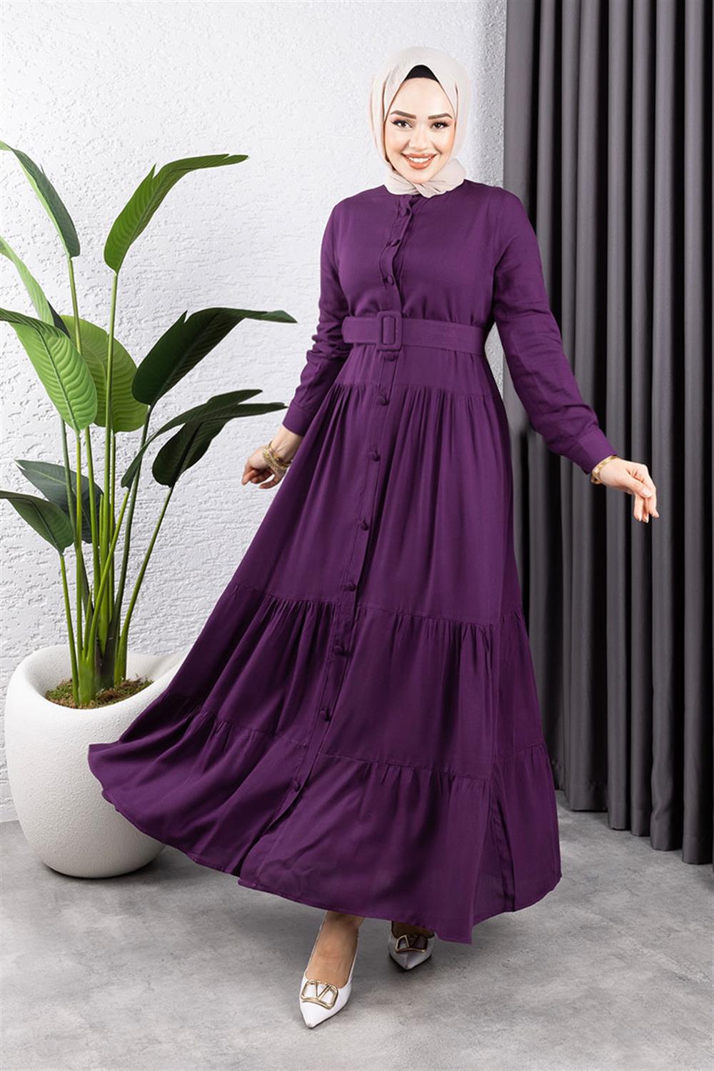 Düğmeli Tesettür Elbise Mor
