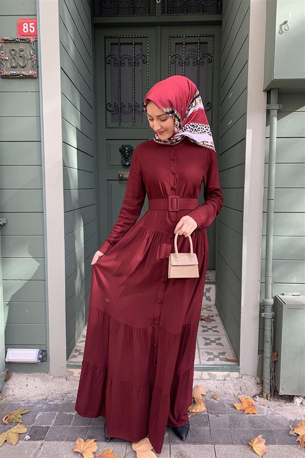 Düğmeli Tesettür Elbise Vişne