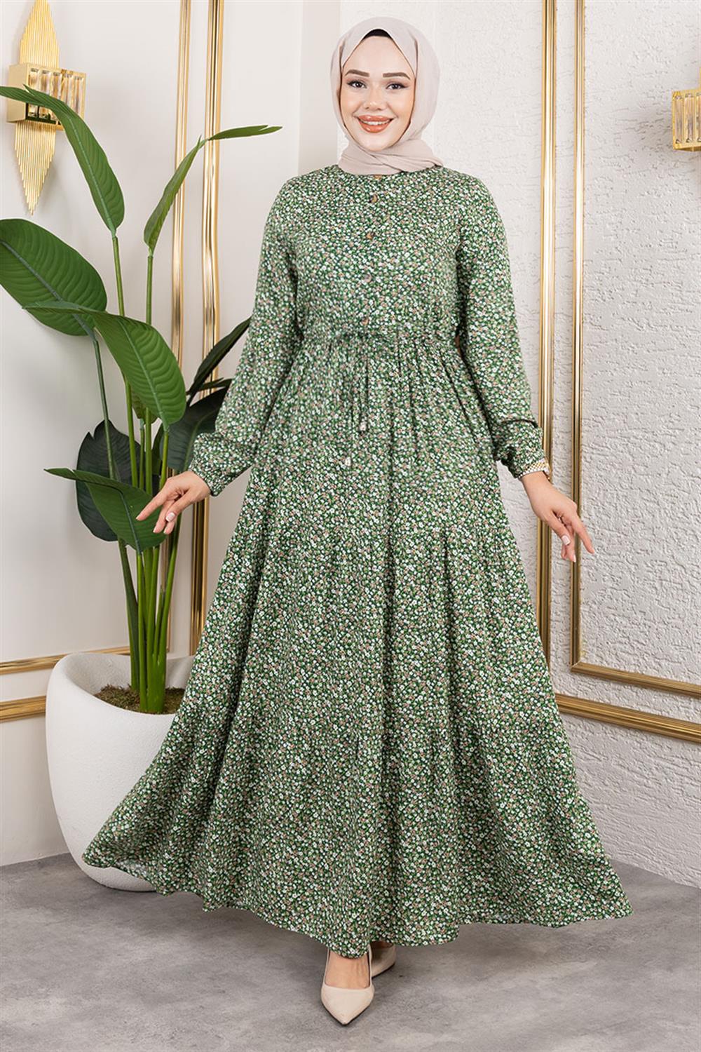 Efsun Çiçek Desenli Elbise KOYU YEŞİL