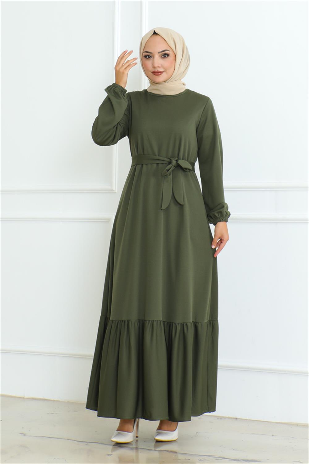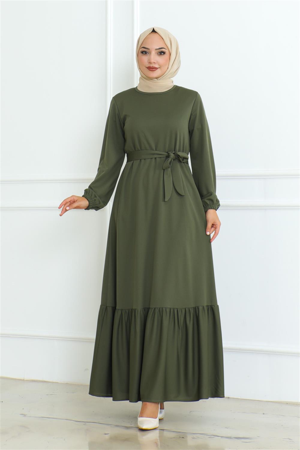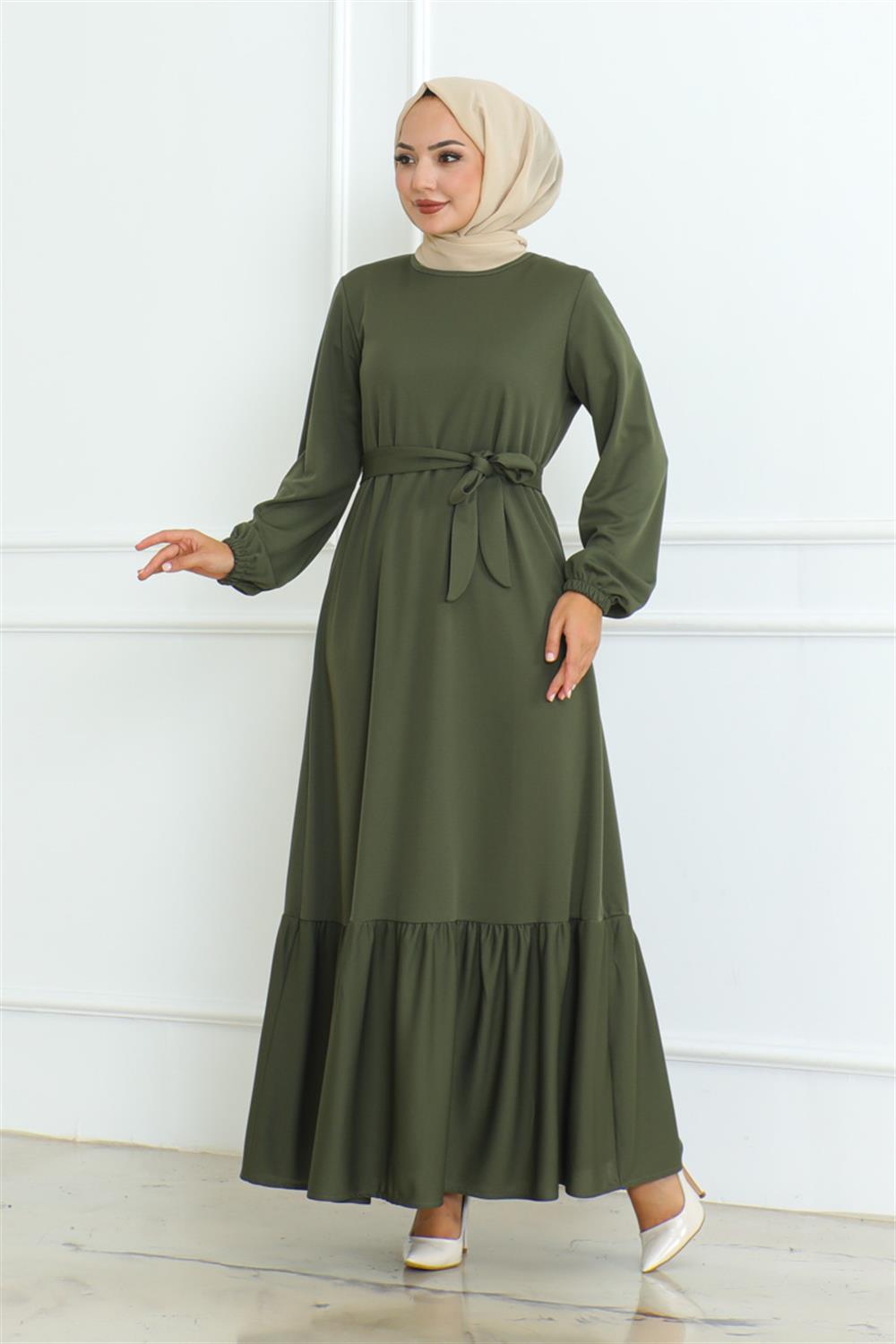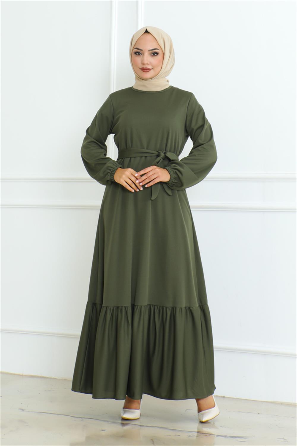 Eteği Fırfırlı Tesettür Elbise HAKİ