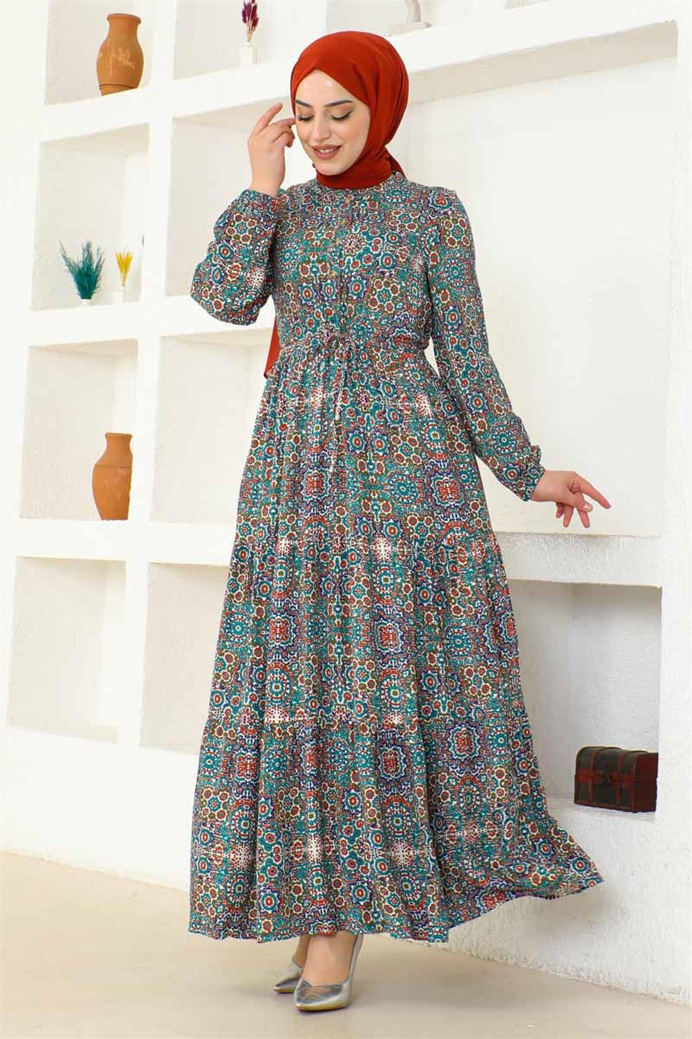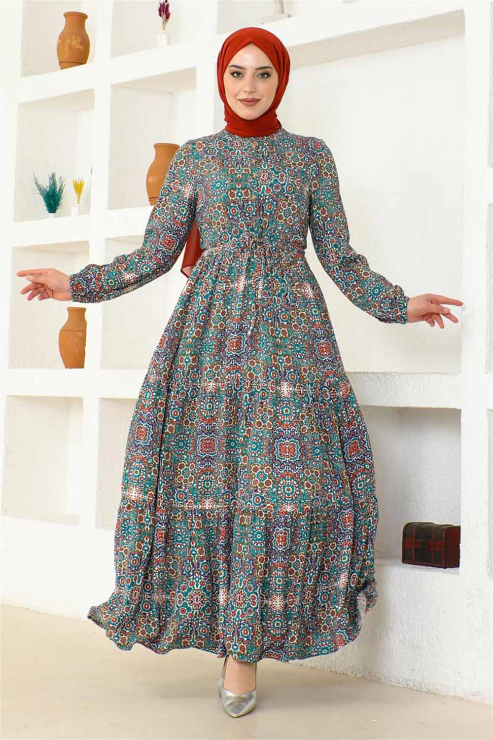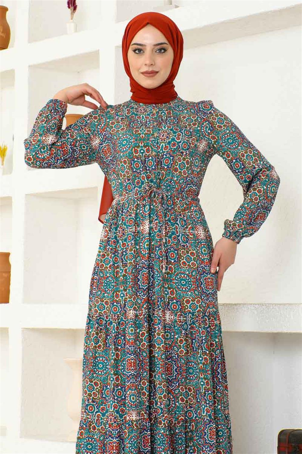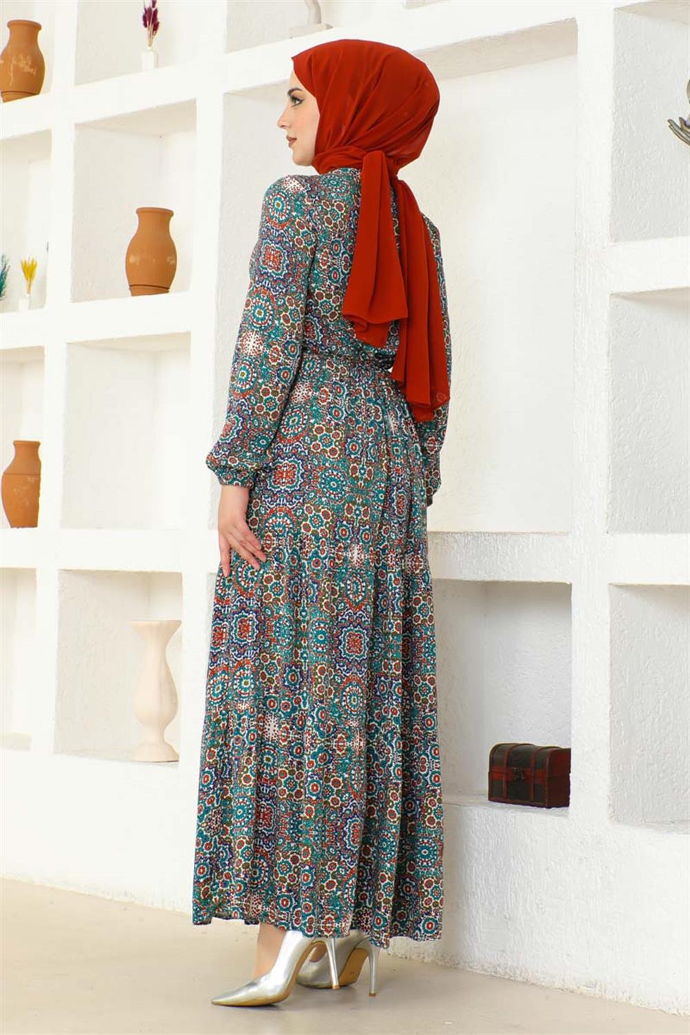 Etnik Desen Viskon Elbise TURKUAZ
