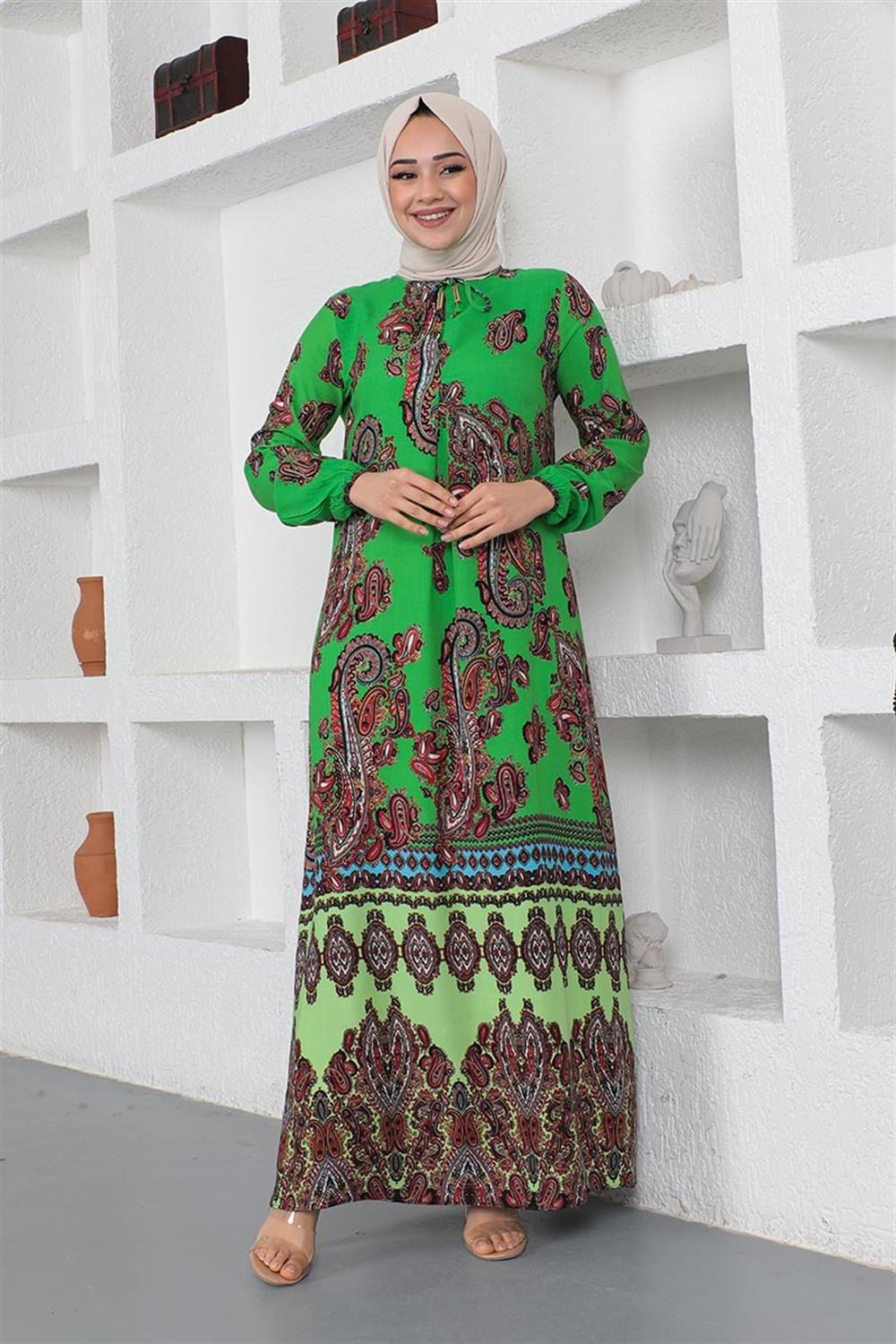Etnik Desenli Model Tesettür Elbise YEŞİL