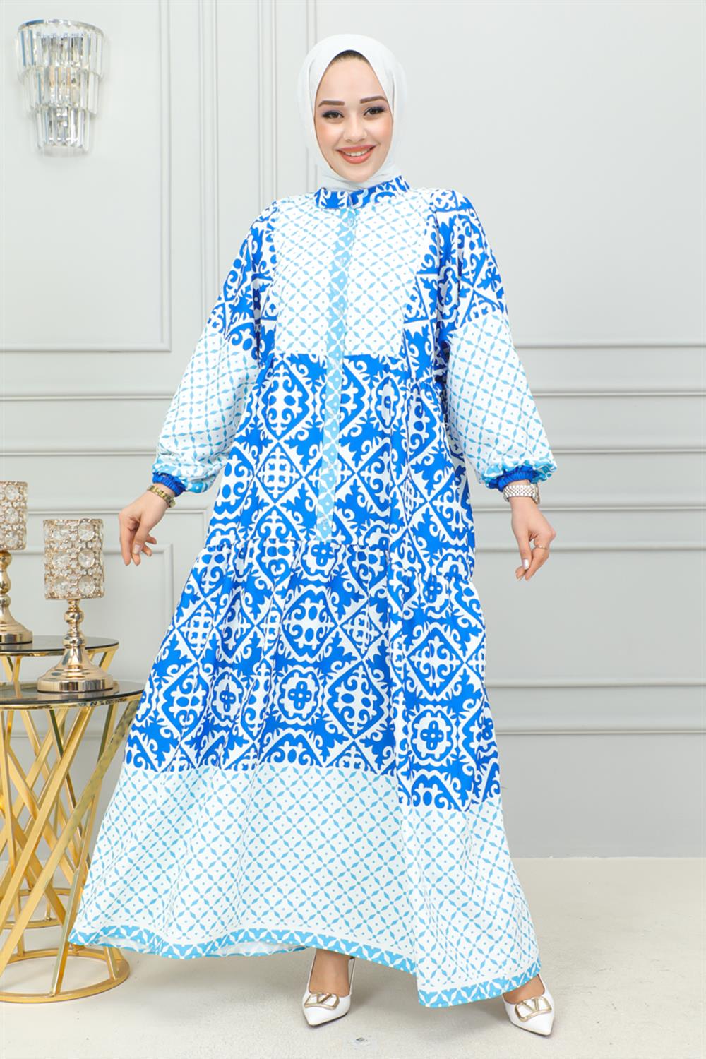 Etnik Desenli Tesettür Elbise MAVİ