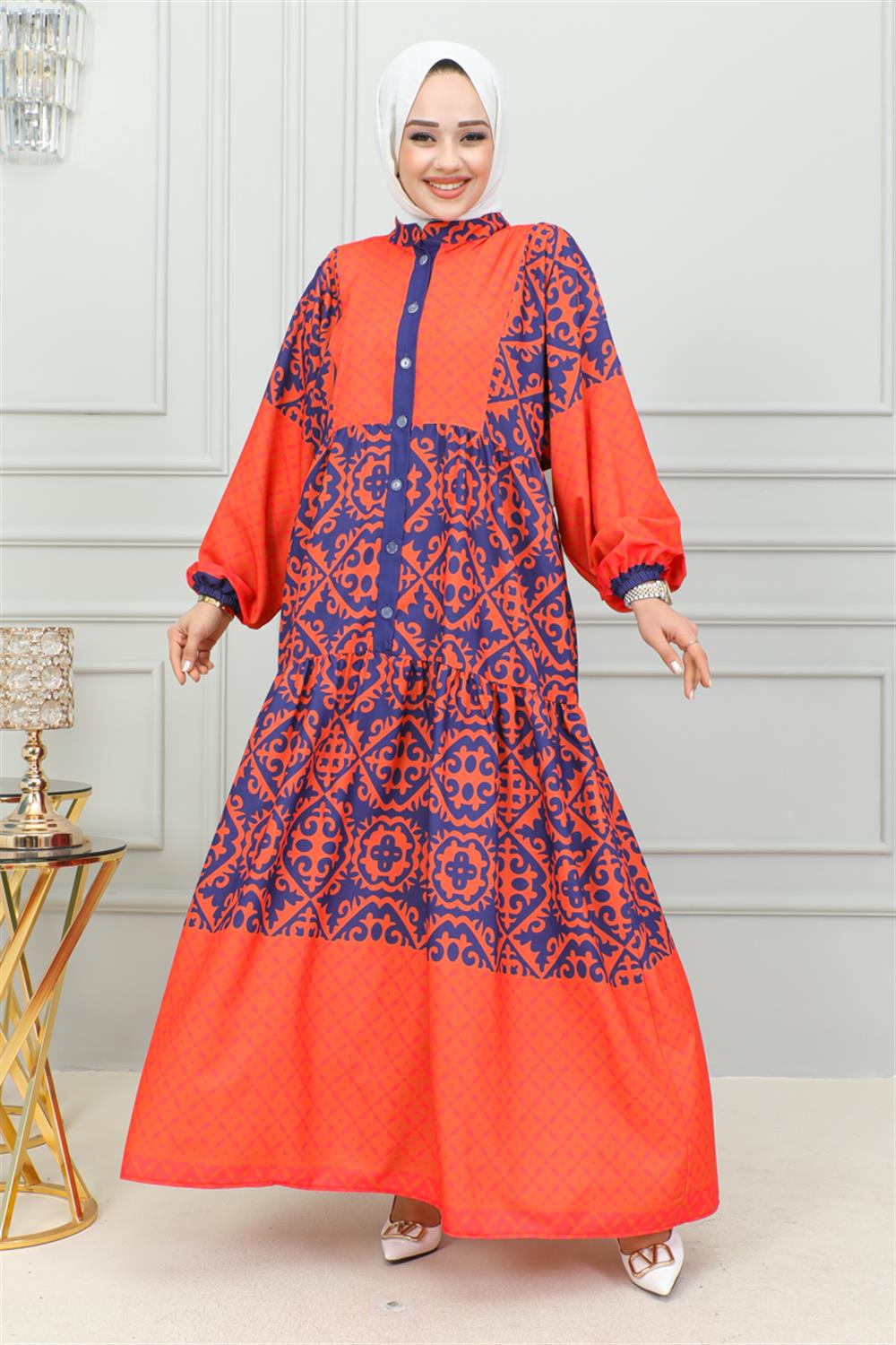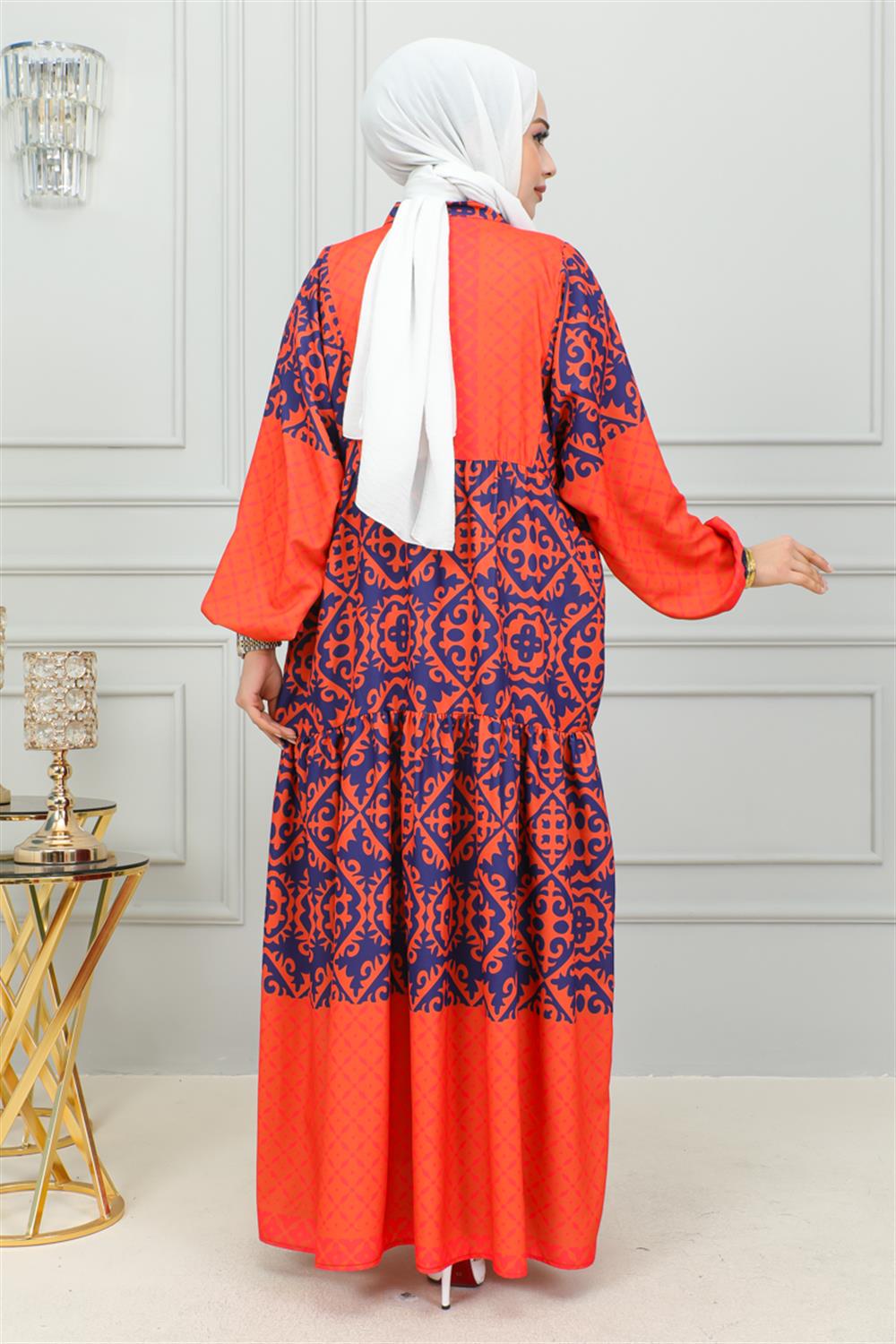 Etnik Desenli Tesettür Elbise TURUNCU