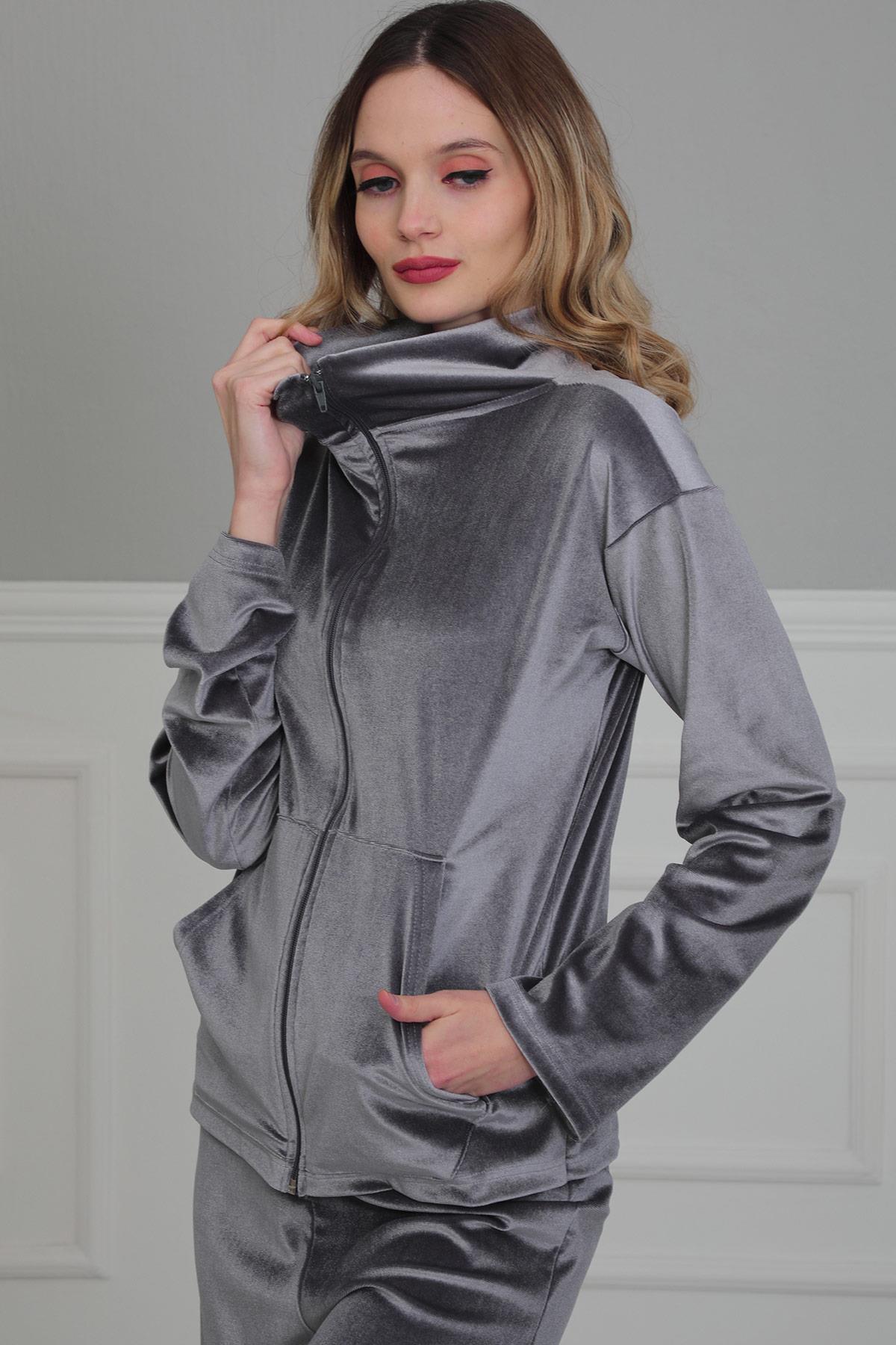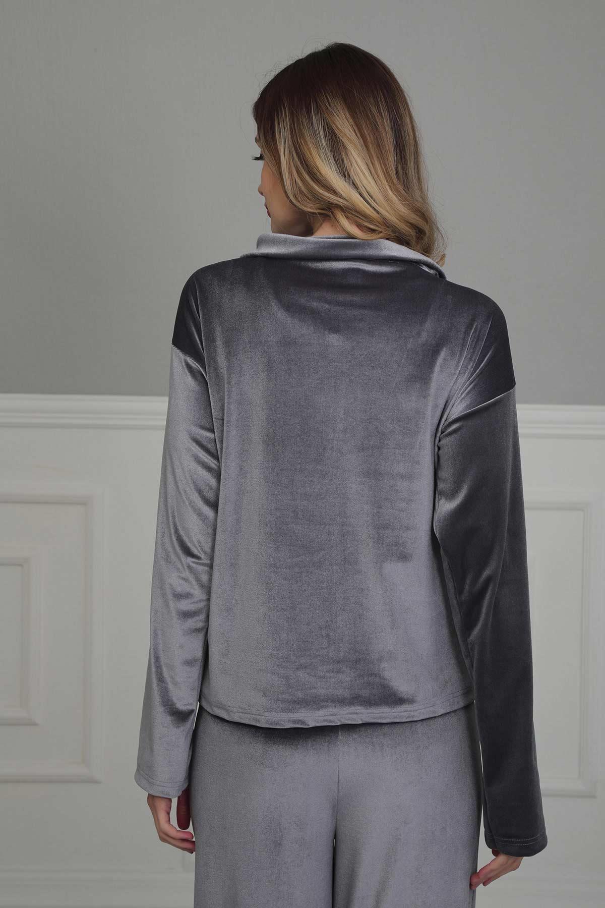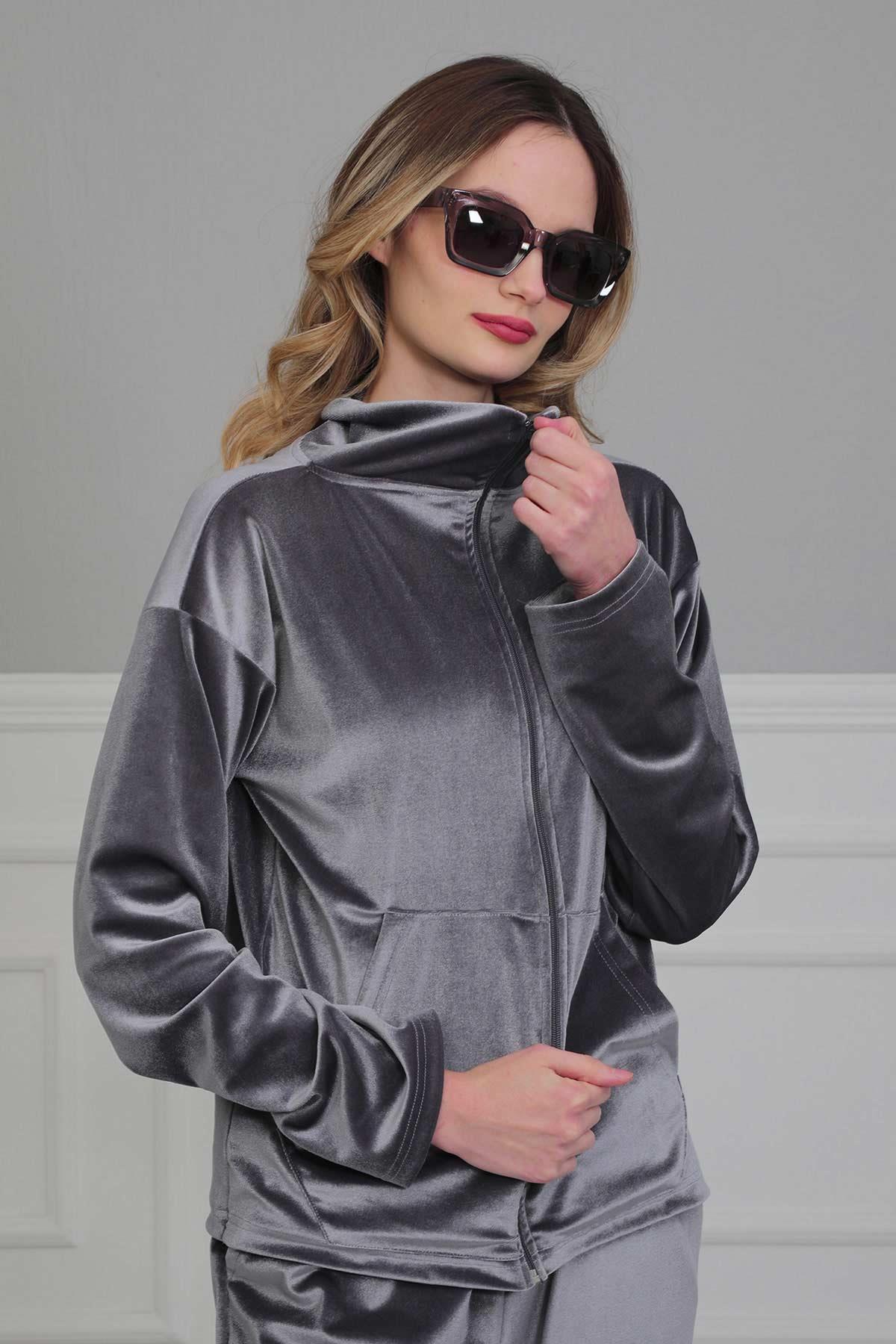 Fermuarlı Cep Detay Kadife Sweatshirt,SW-2 Gri