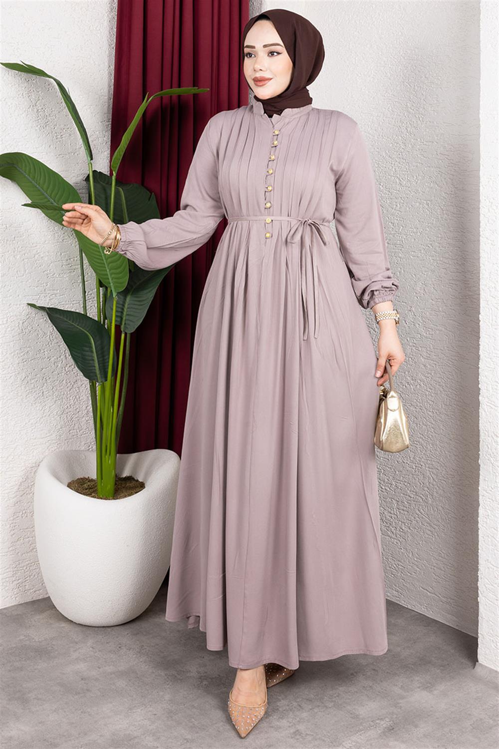Gold Düğmeli Belmando Elbise, tesettür tarzına uygun olup dört mevsim boyunca rahatlıkla kullanılabilir. Hassas yıkama ayarında 30 derecede yıkanabilen bu şık elbise, dayanıklı Belmando kumaştan üretilmiştir. Yarım hakim yaka ve önden yarım düğmeli tasarımı ile modern bir görünüm sunar. Astarsız oluşu, hafifliğiyle öne çıkar. Elbise 38 beden ölçülerinde ve manşetleri lastiklidir. Bel bölgesinde yer alan bağcık ile farklı stiller yaratılabilir.