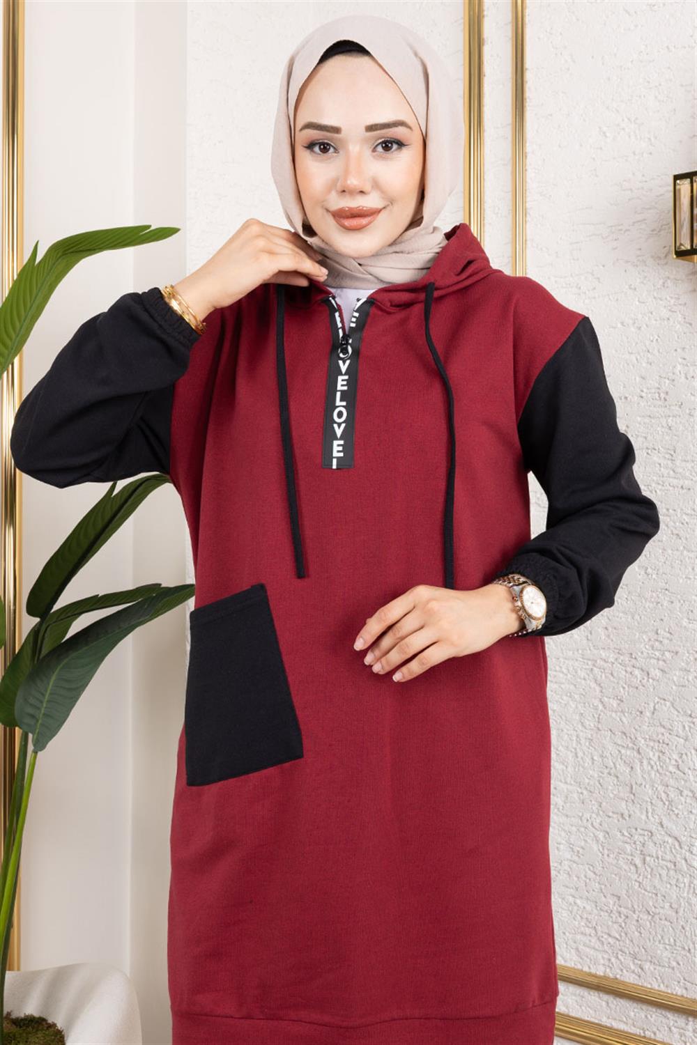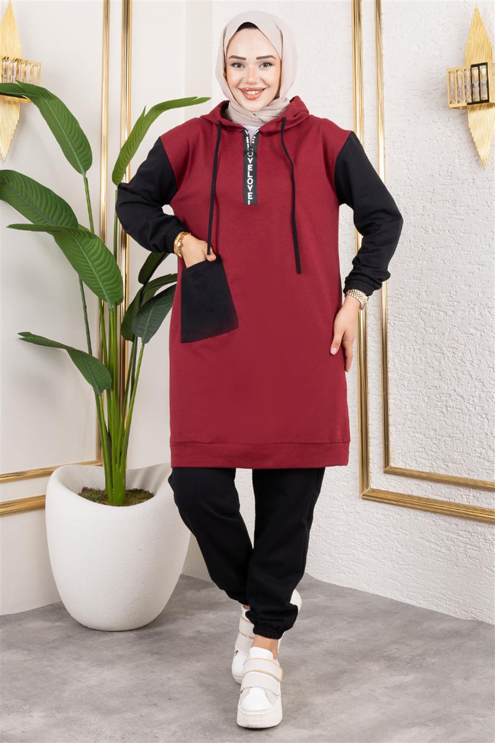 Yeni sezon tesettür moda ürünüdür.Ürünümüz iki iplik kumaştan üretilmiştir. Uzun kolludur . Ürünümüz de tek cep bulunmaktadır. .Eşofman altı paçası lastiklidir. 4 Mevsim kullanıma uygundur.
