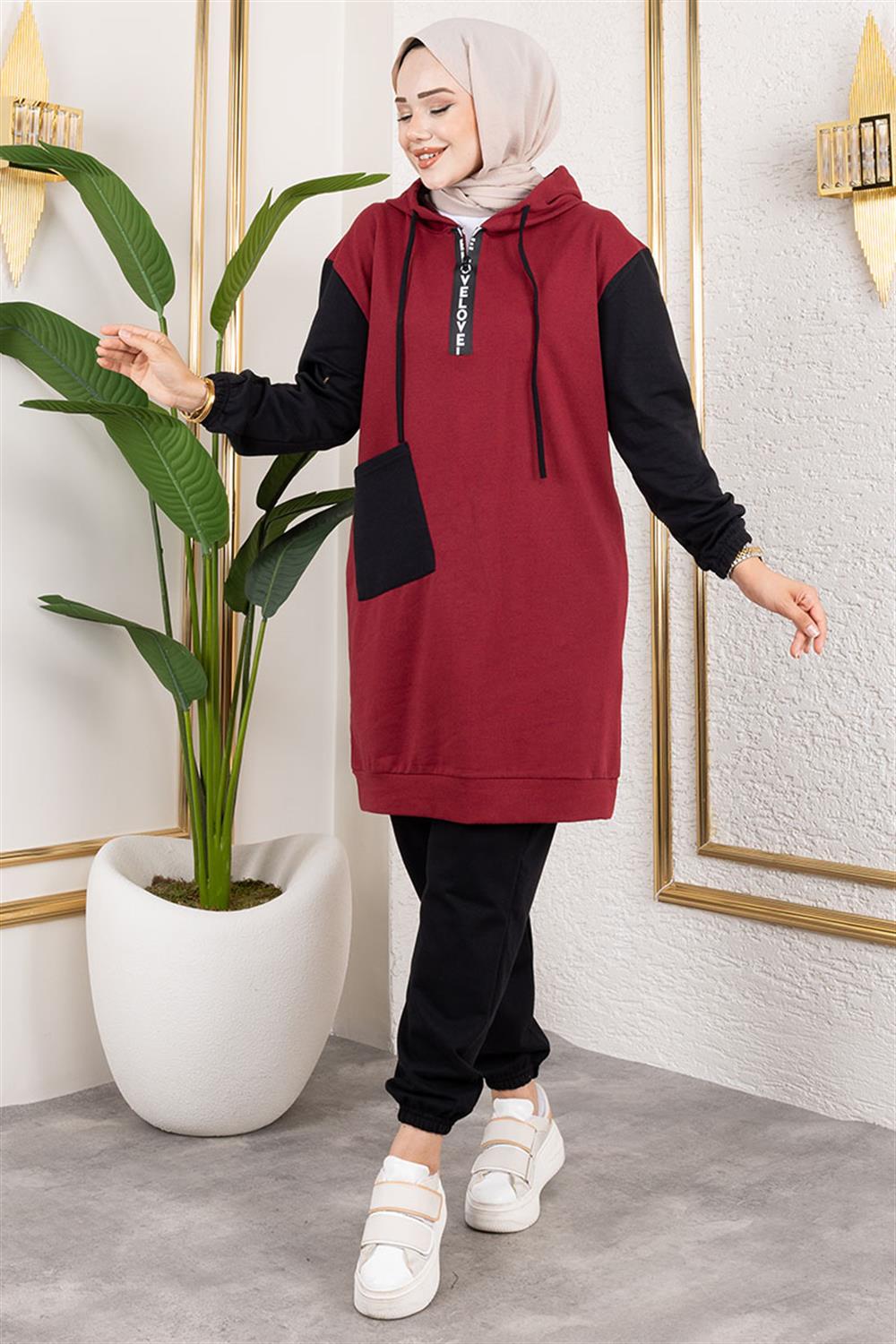 İki Renkli İkili Tesettür Takım Bordo -Siyah