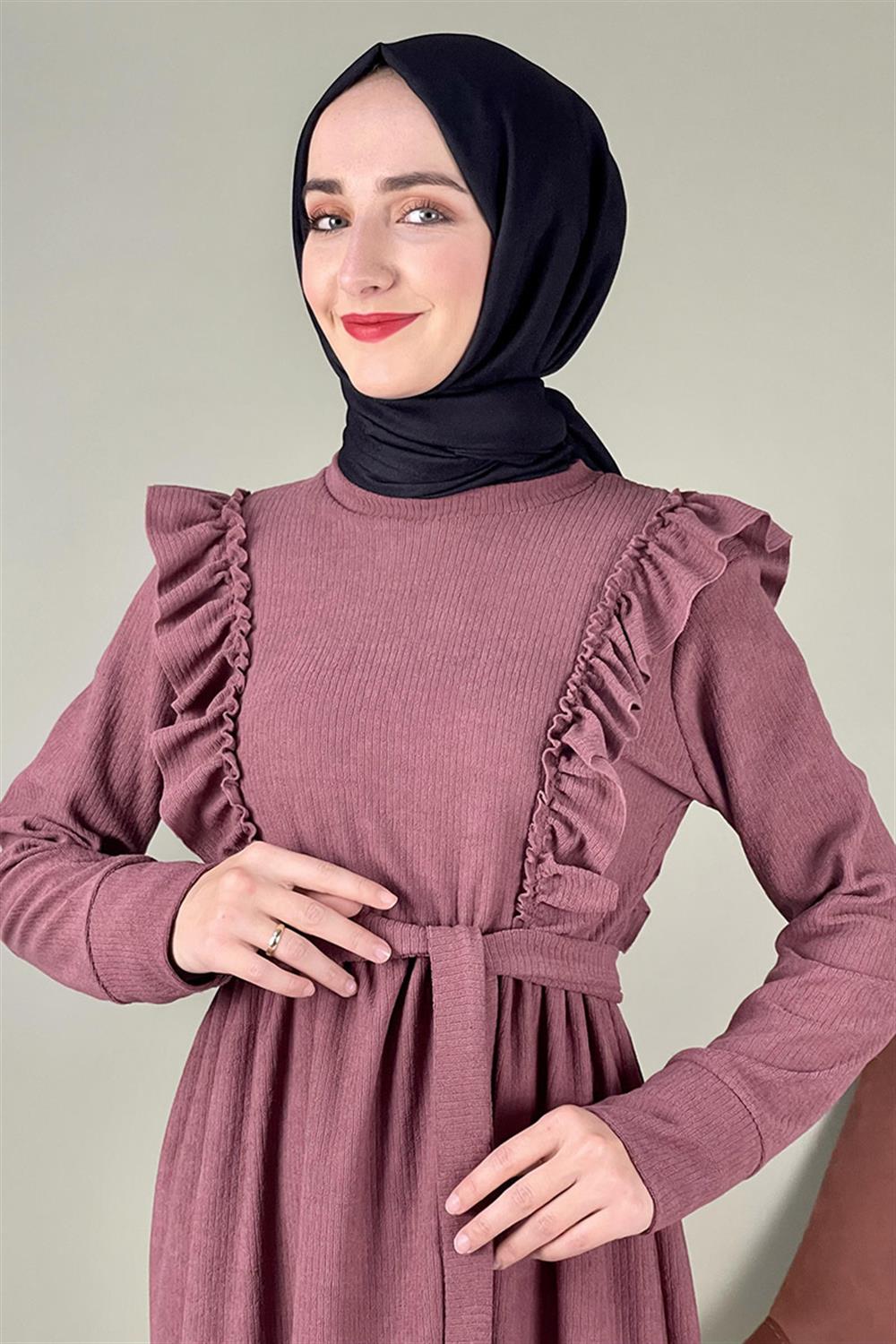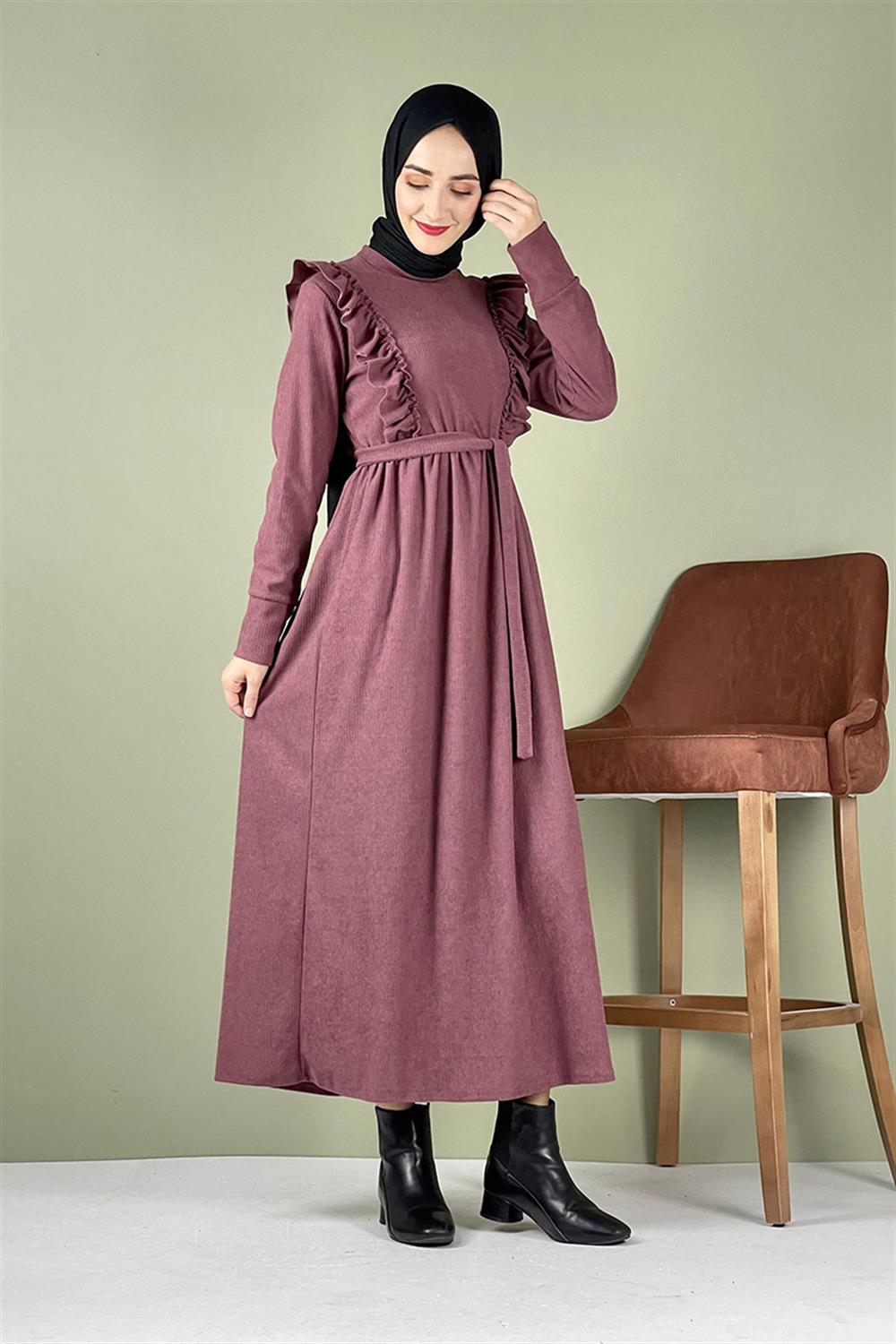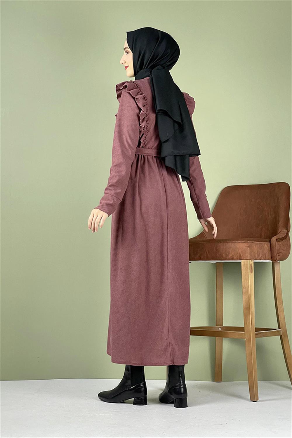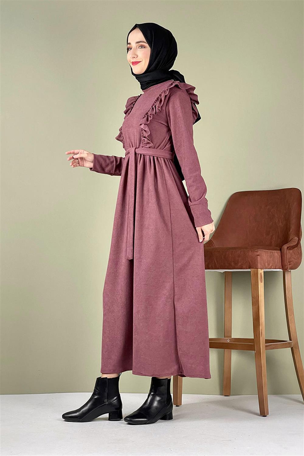 Kadife Fırfırlı Elbise Gül Kurusu