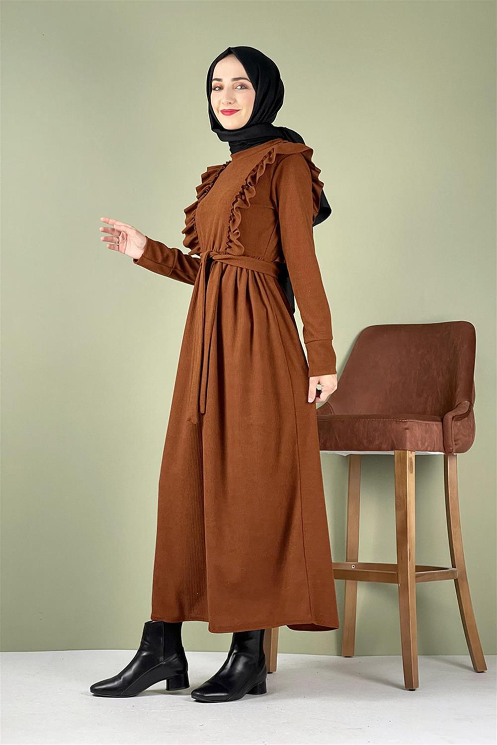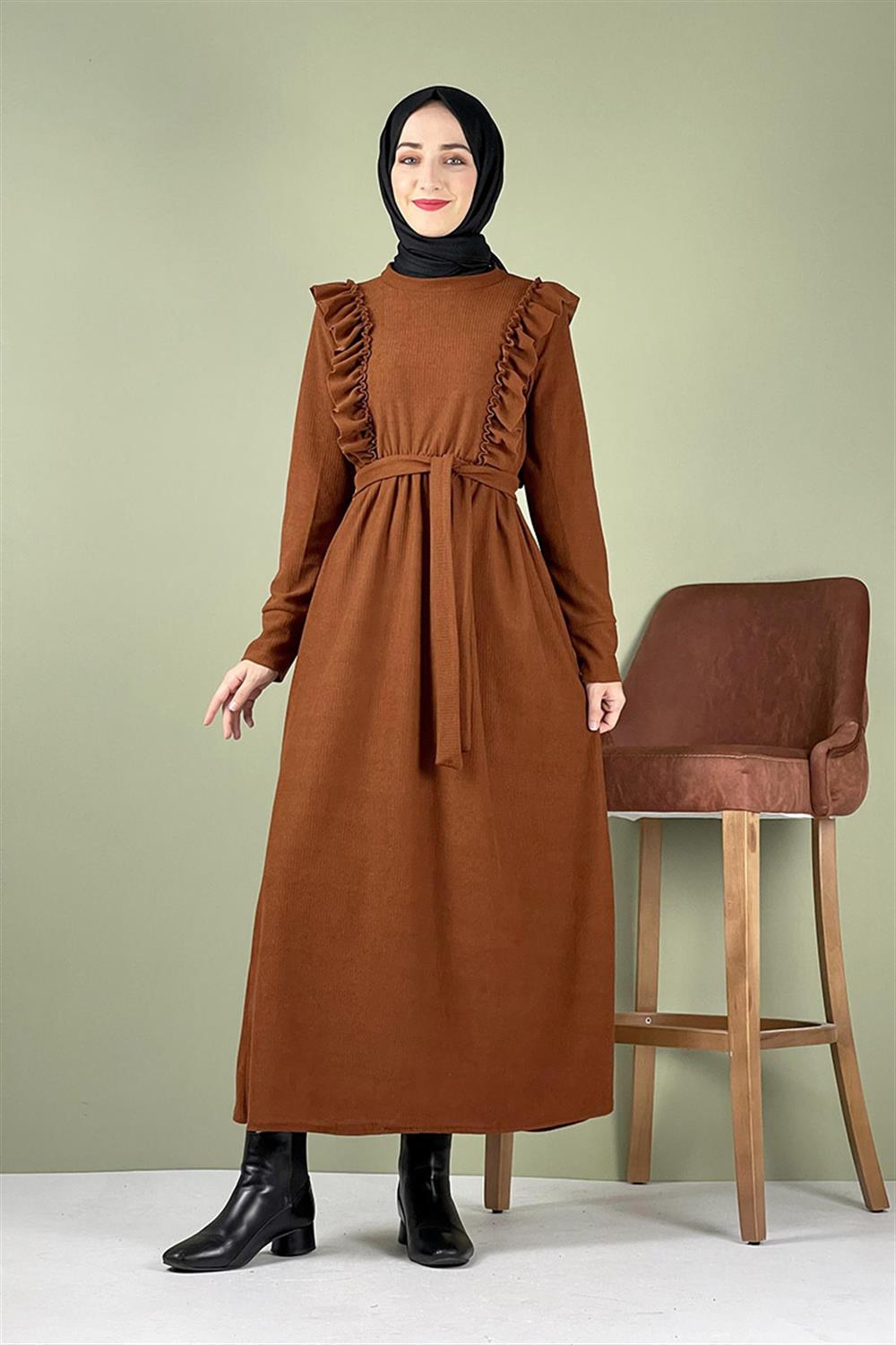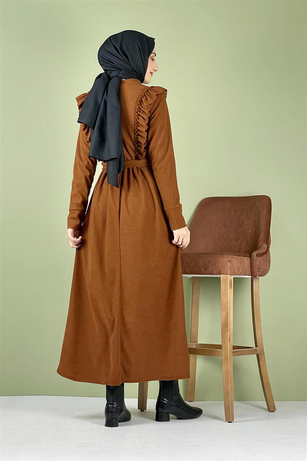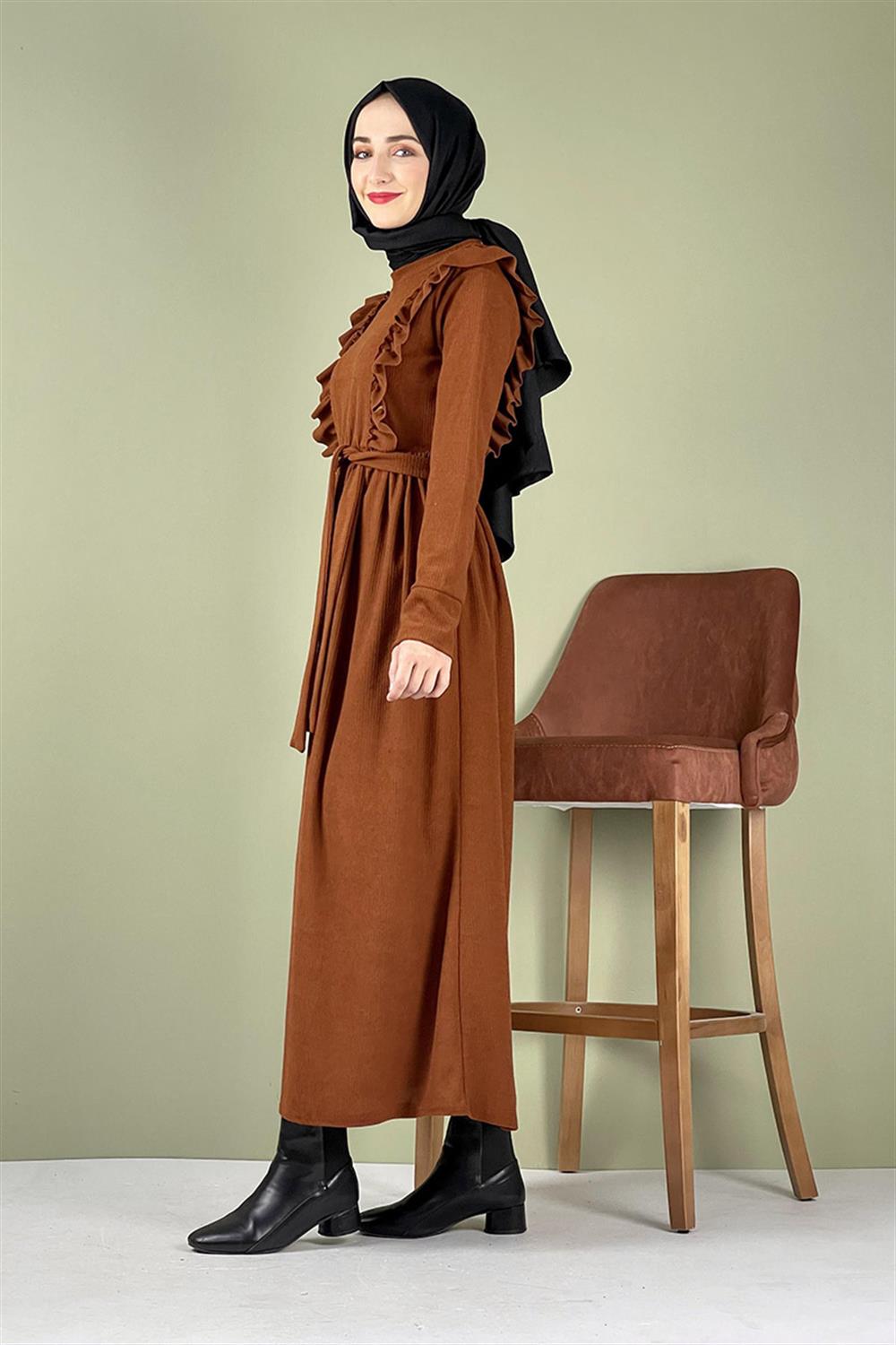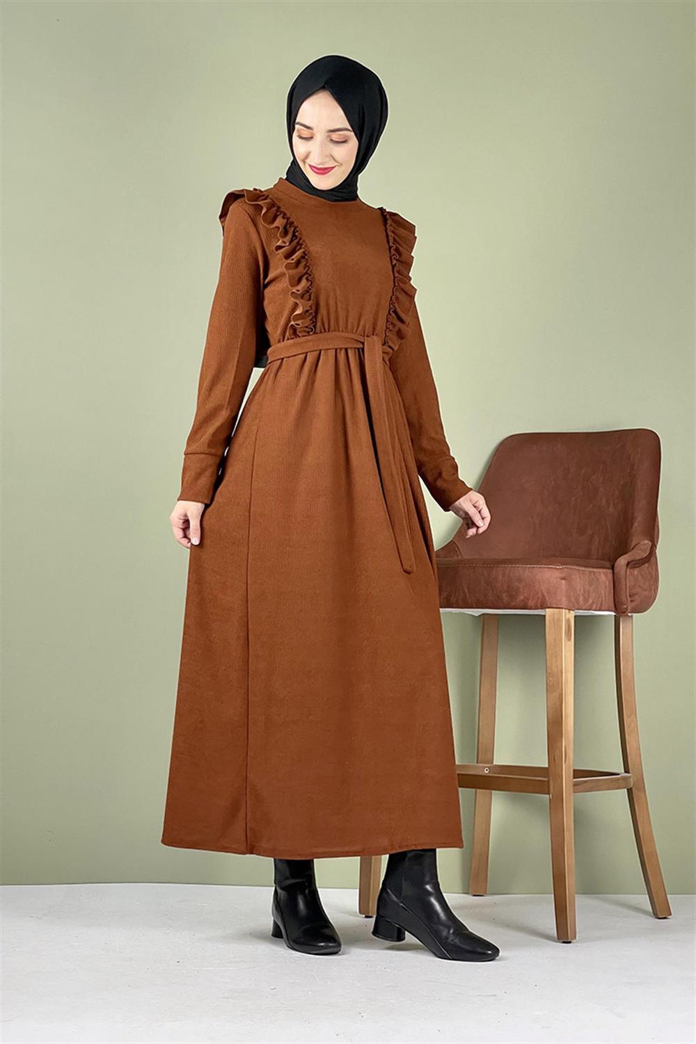 Kadife Fırfırlı Elbise Taba