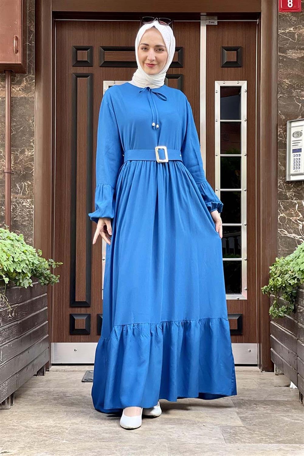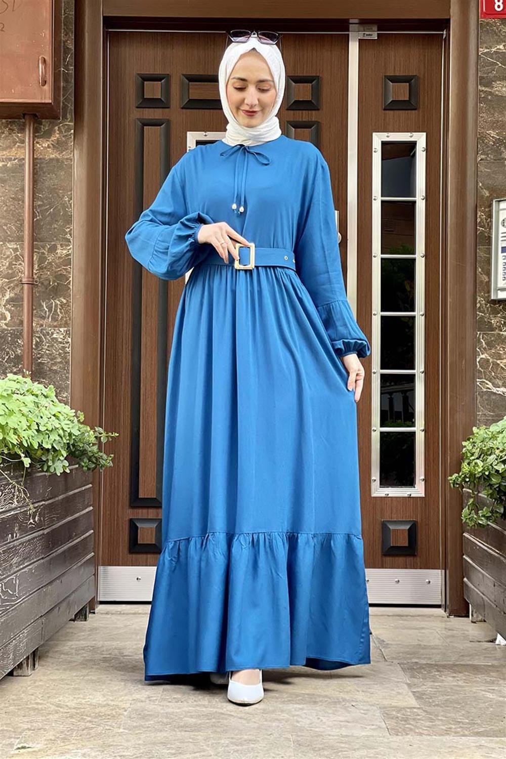 • Kemer Detaylı Tesettür Elbise Koyu İndigo