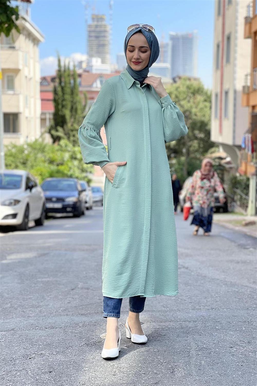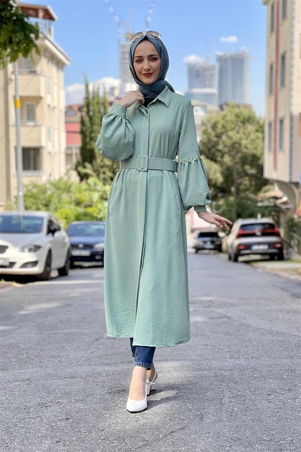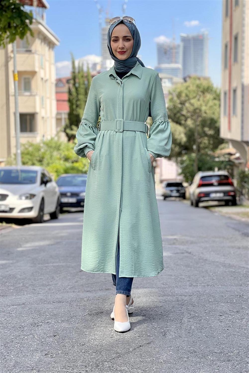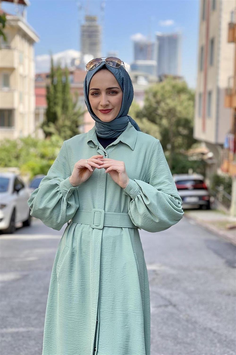 Yeni Sezon Tesettür Moda ürünüdür. Ürün astarsız modeldir. Uzun kollu, önden düğmeli ve kemerli görünüme sahiptir. 4 mevsim tercih edilebilir.