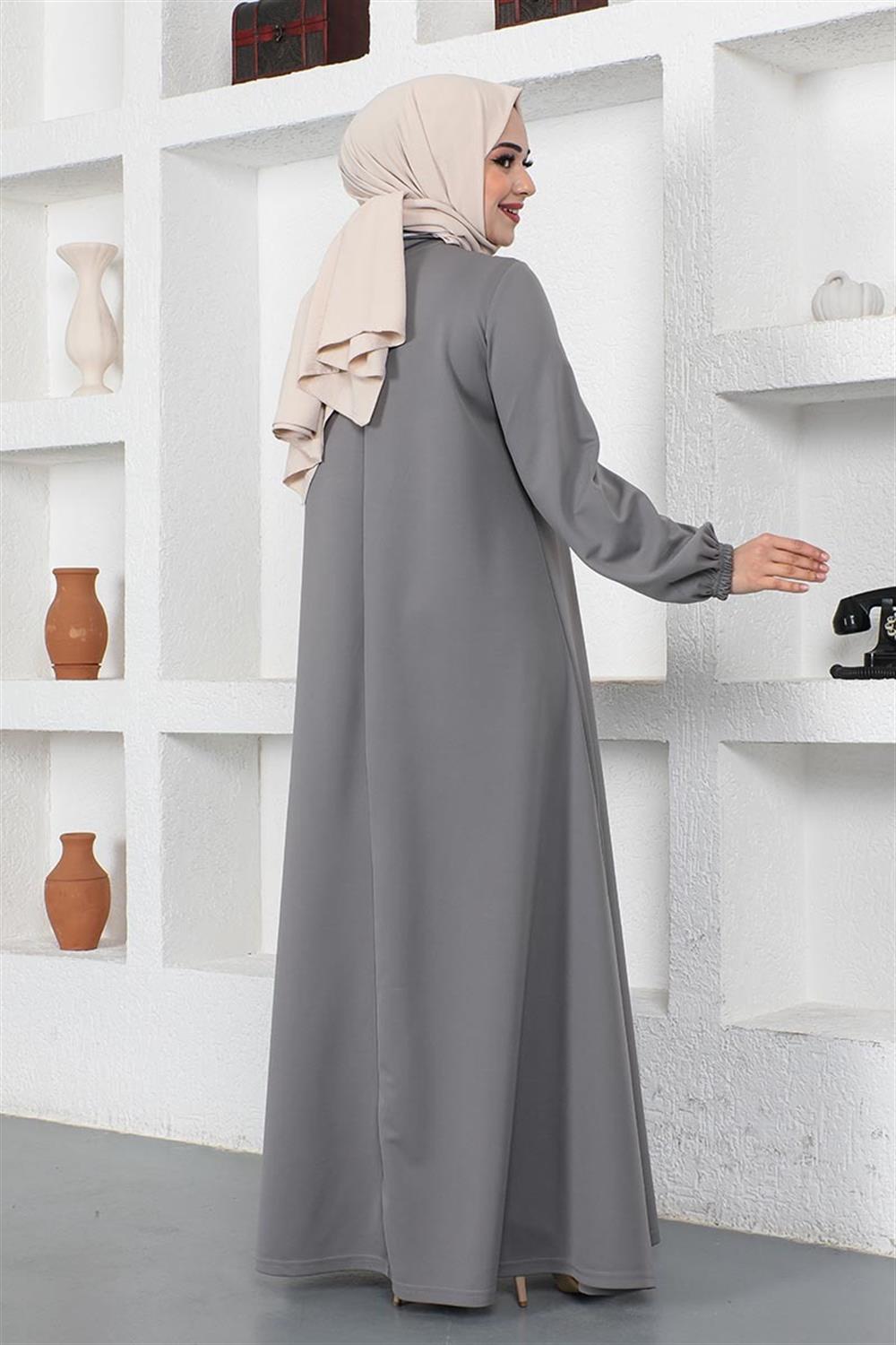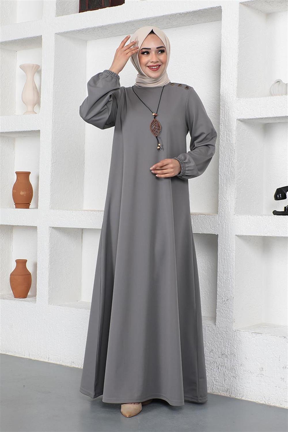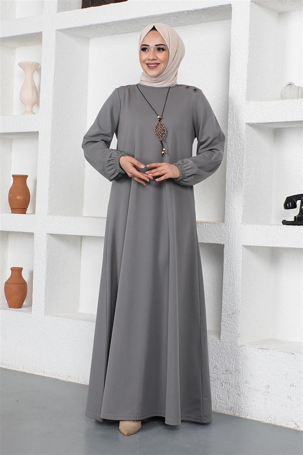 Kolyeli Bisiklet Yaka Tesettür Elbise GRİ
