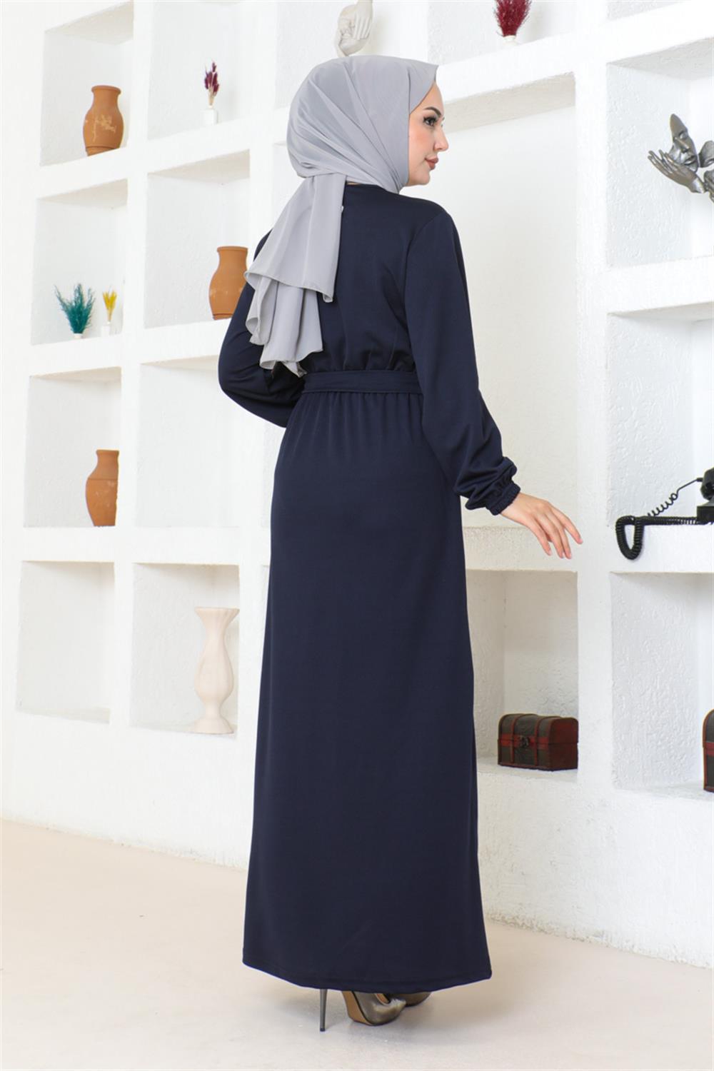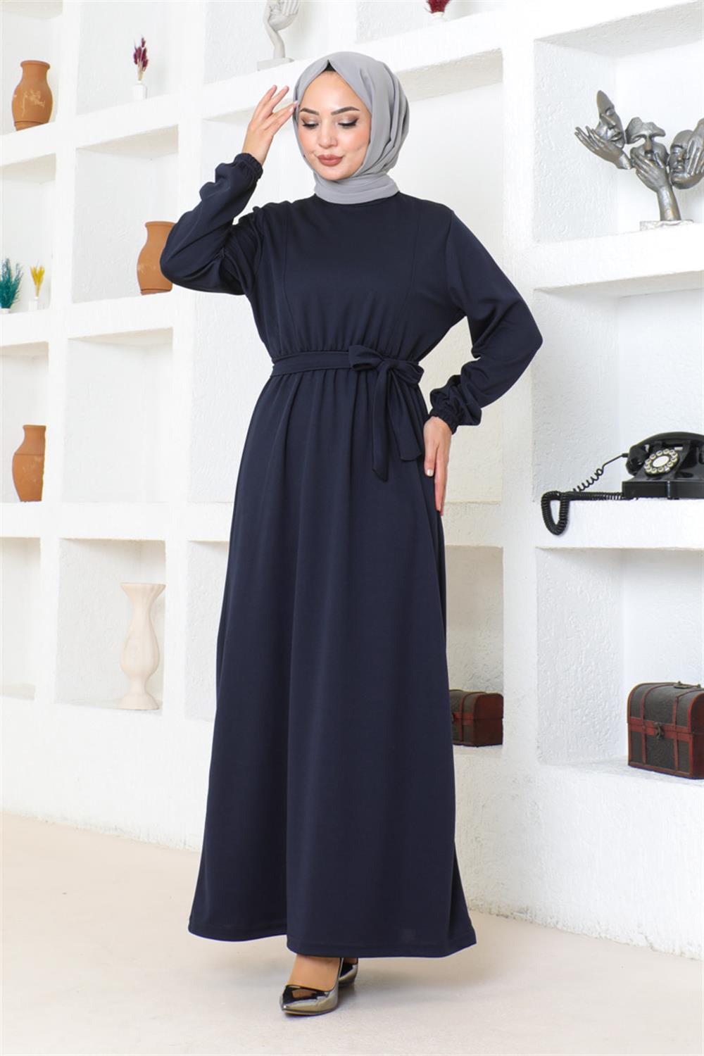 Kuşak Detaylı Tesettür Elbise LACİVERT