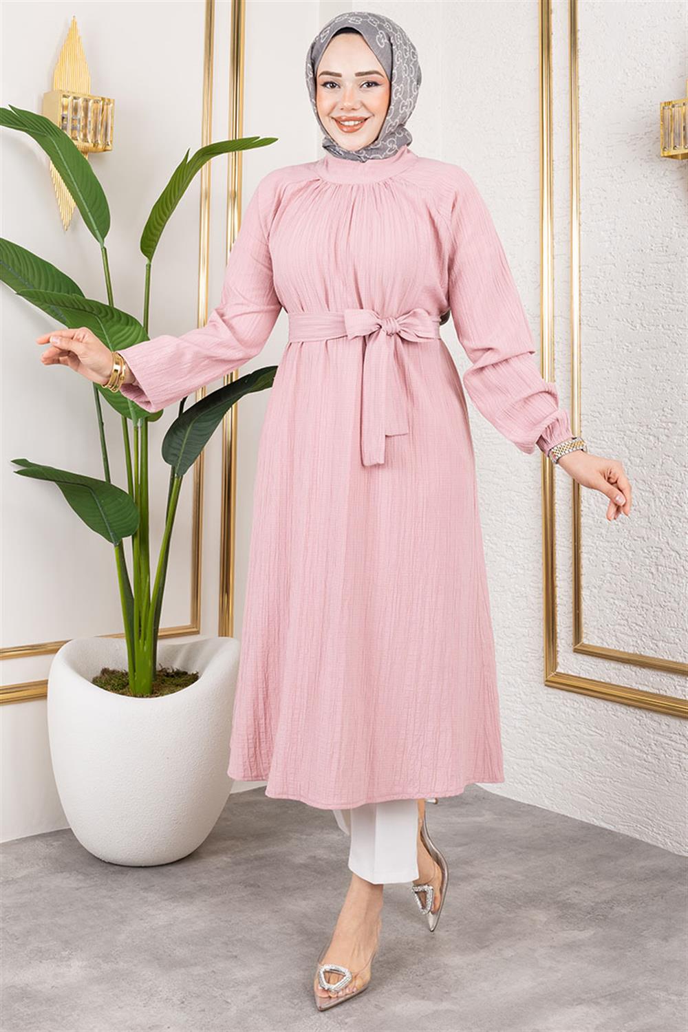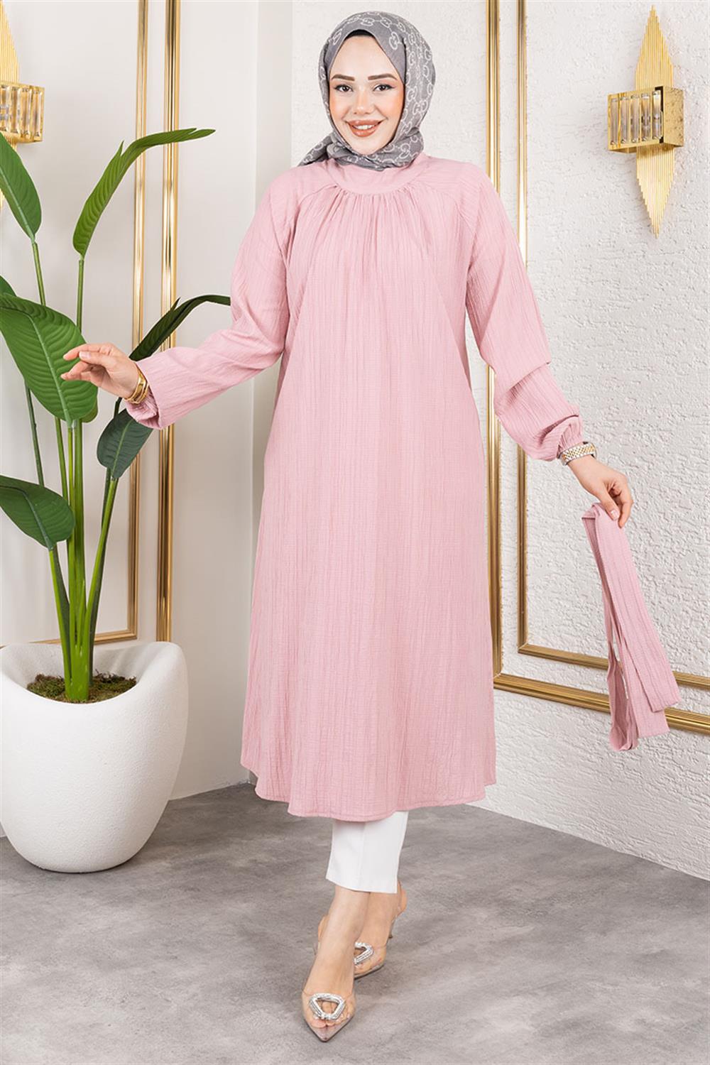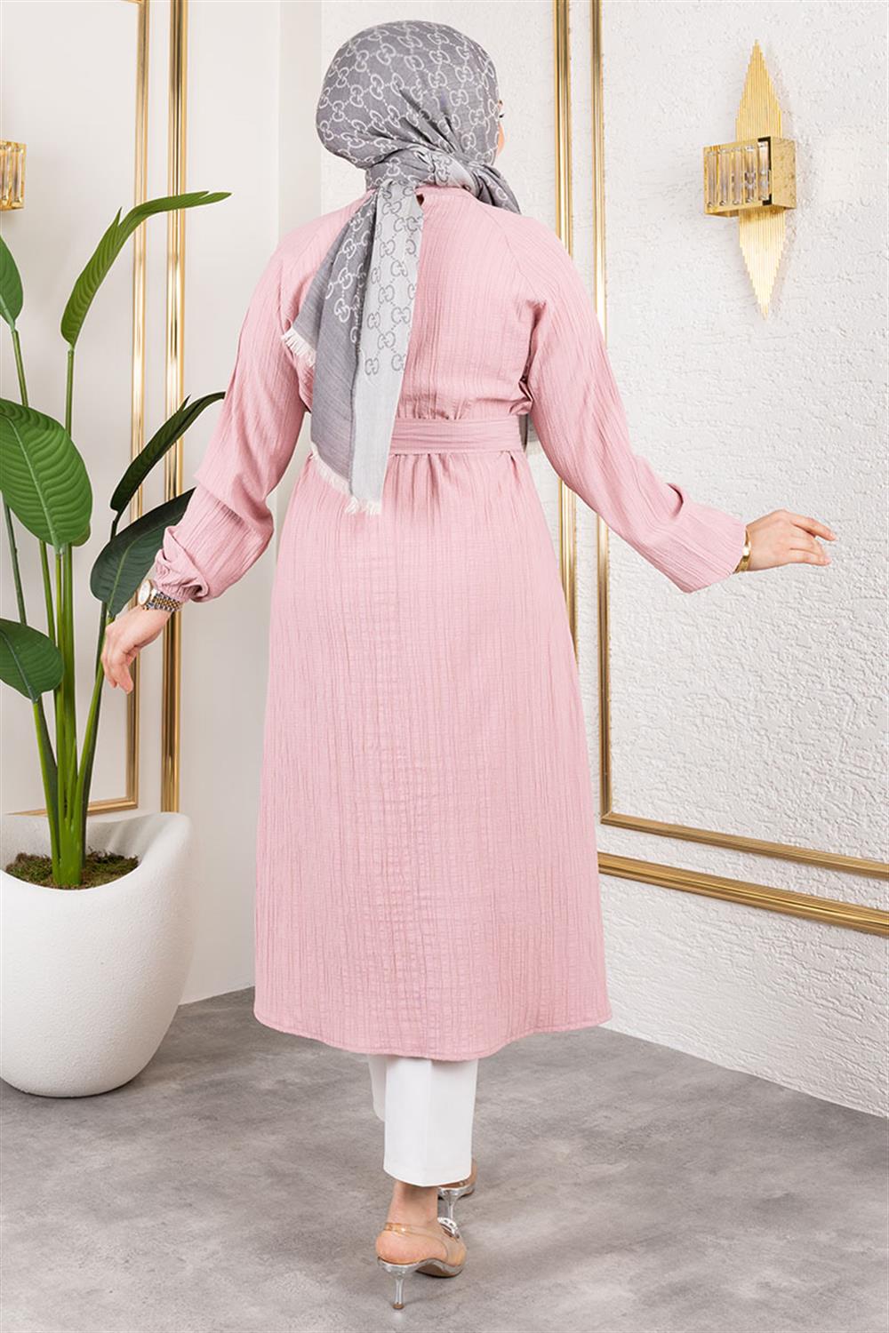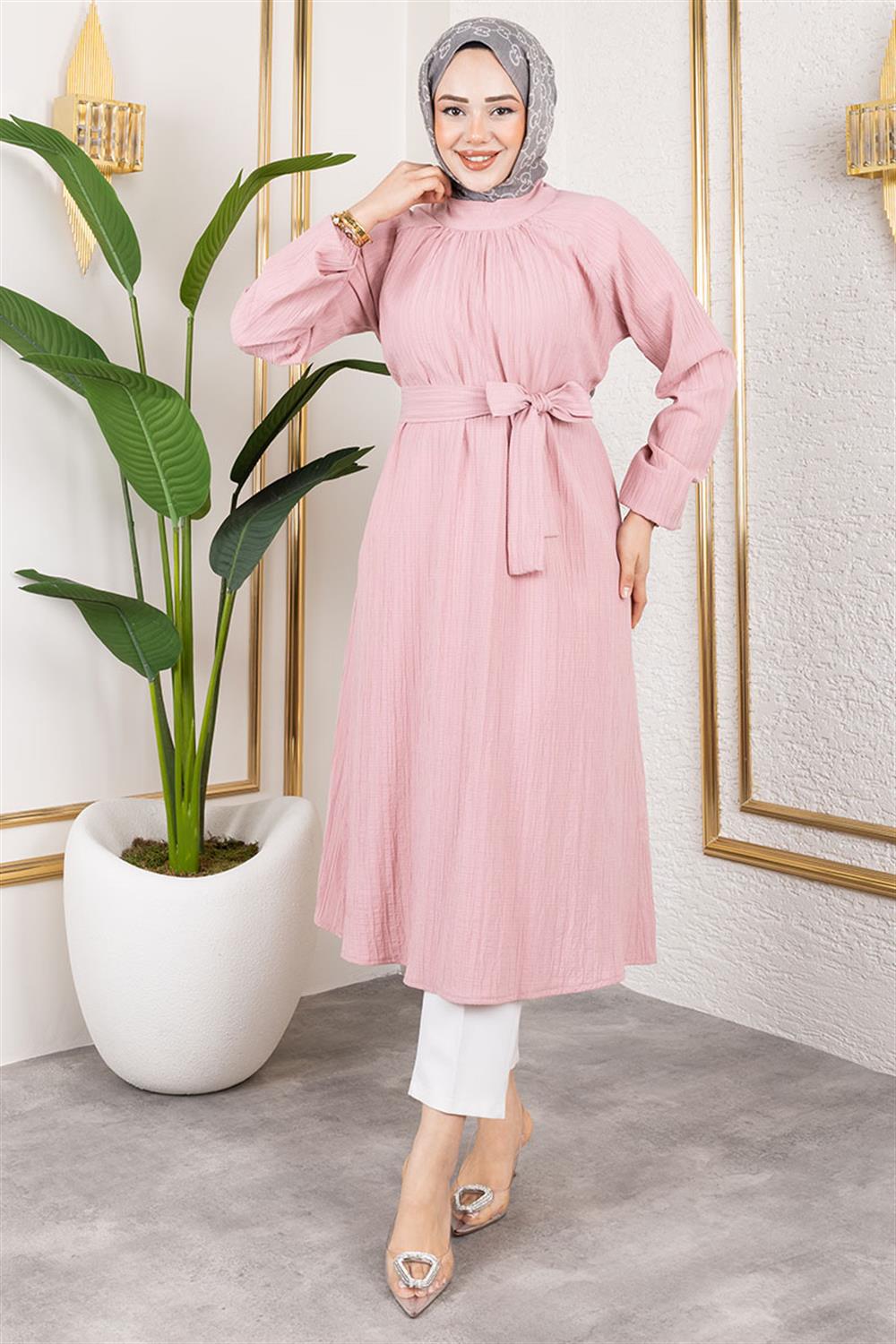 Kuşaklı Uzun Tesettür Tunik GÜL KURUSU