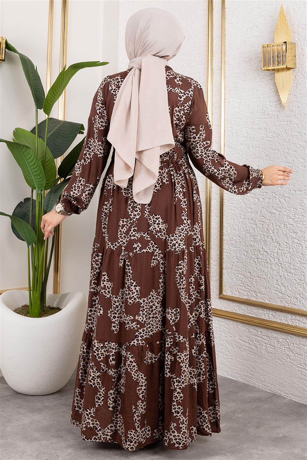Leopar Desenli Viskon Elbise KAHVERENGİ