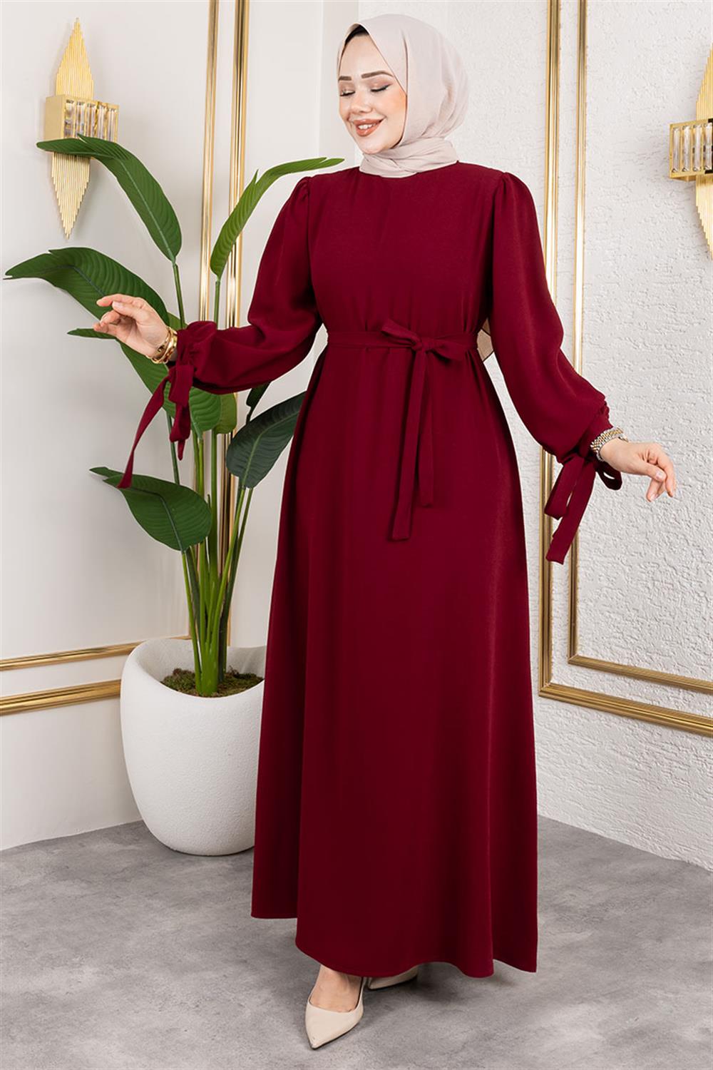 Manşeti Bağcıklı Tesettür Elbise BORDO