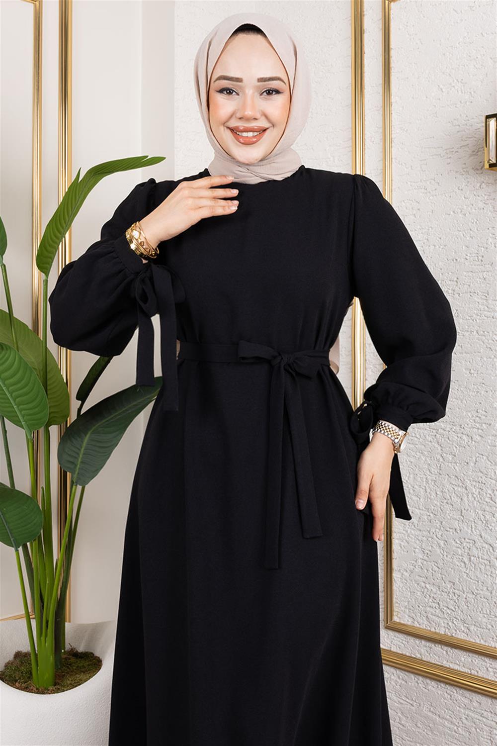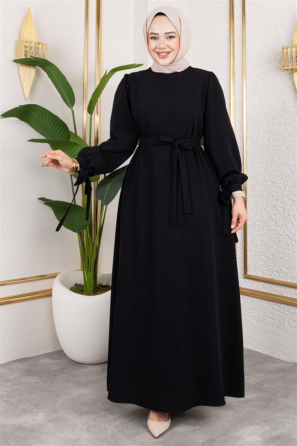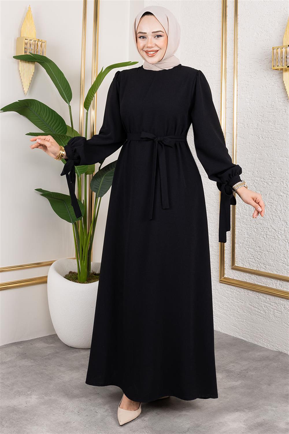 Manşeti Bağcıklı Tesettür Elbise SİYAH