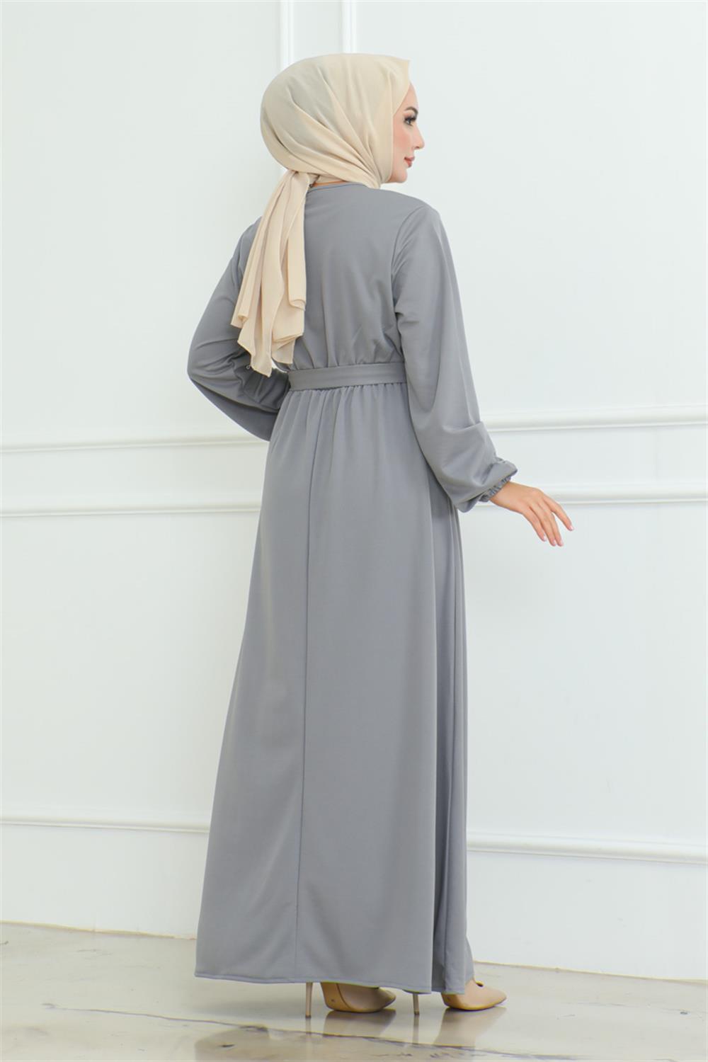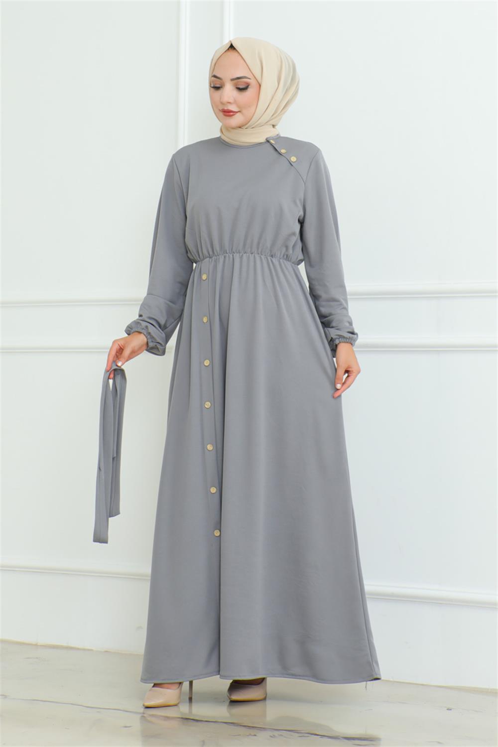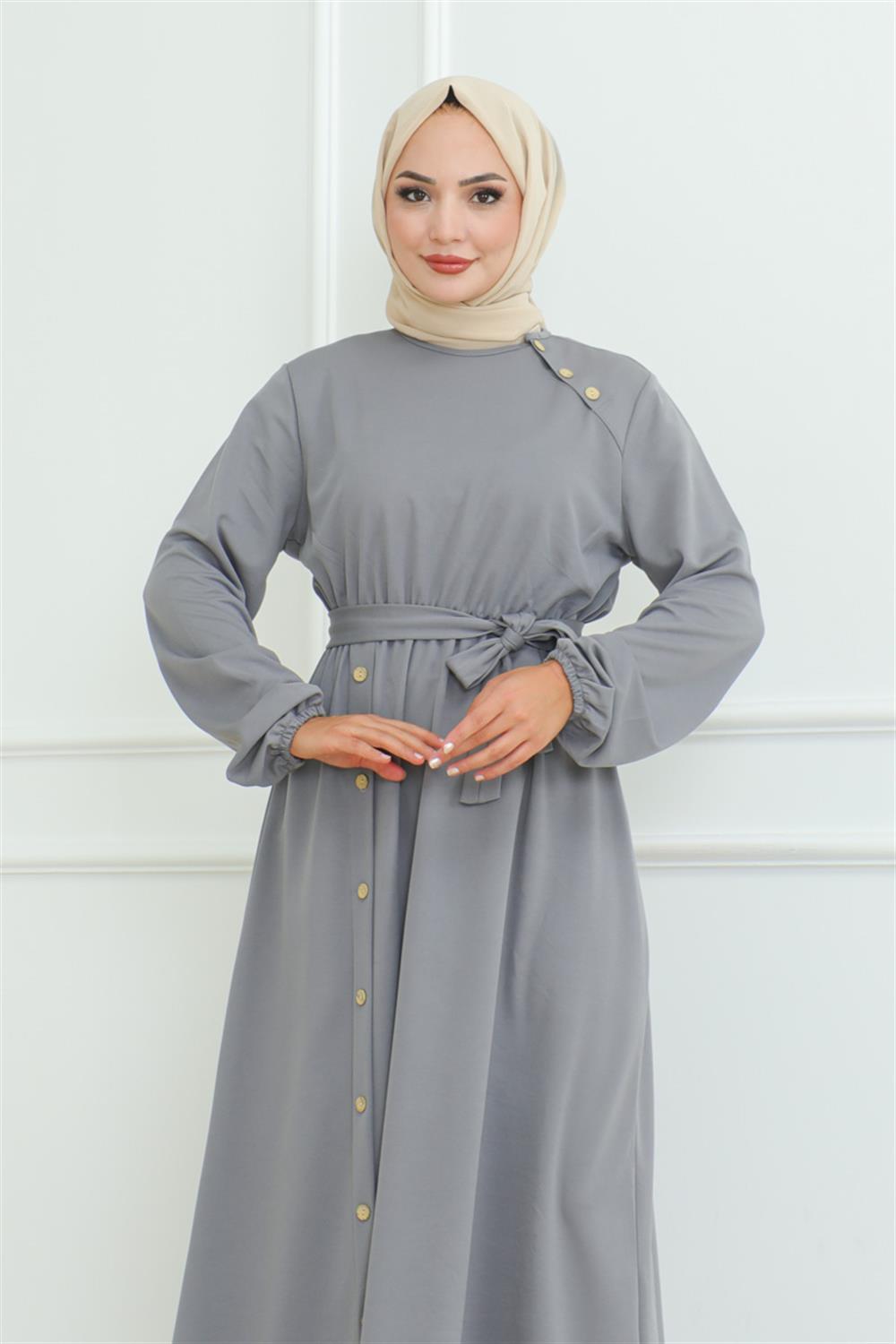 • OMUZ DETAYLI DÜĞMELİ ELBİSE