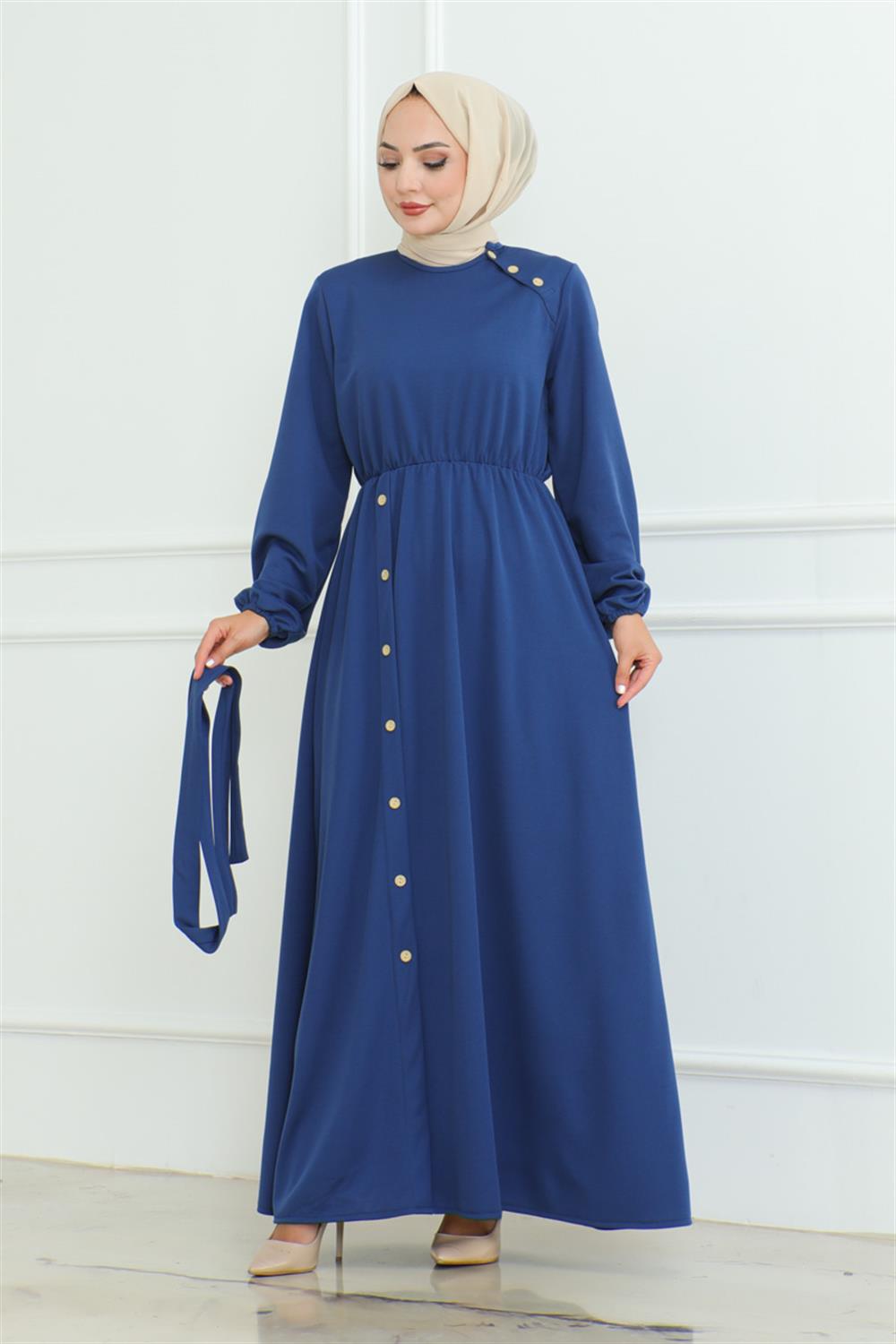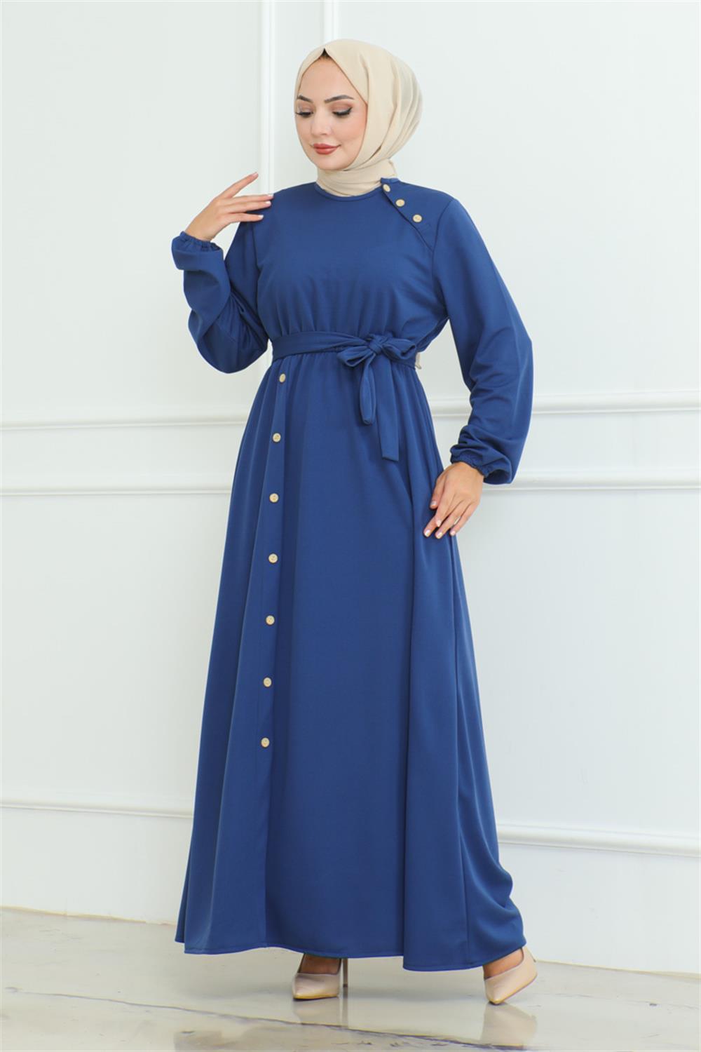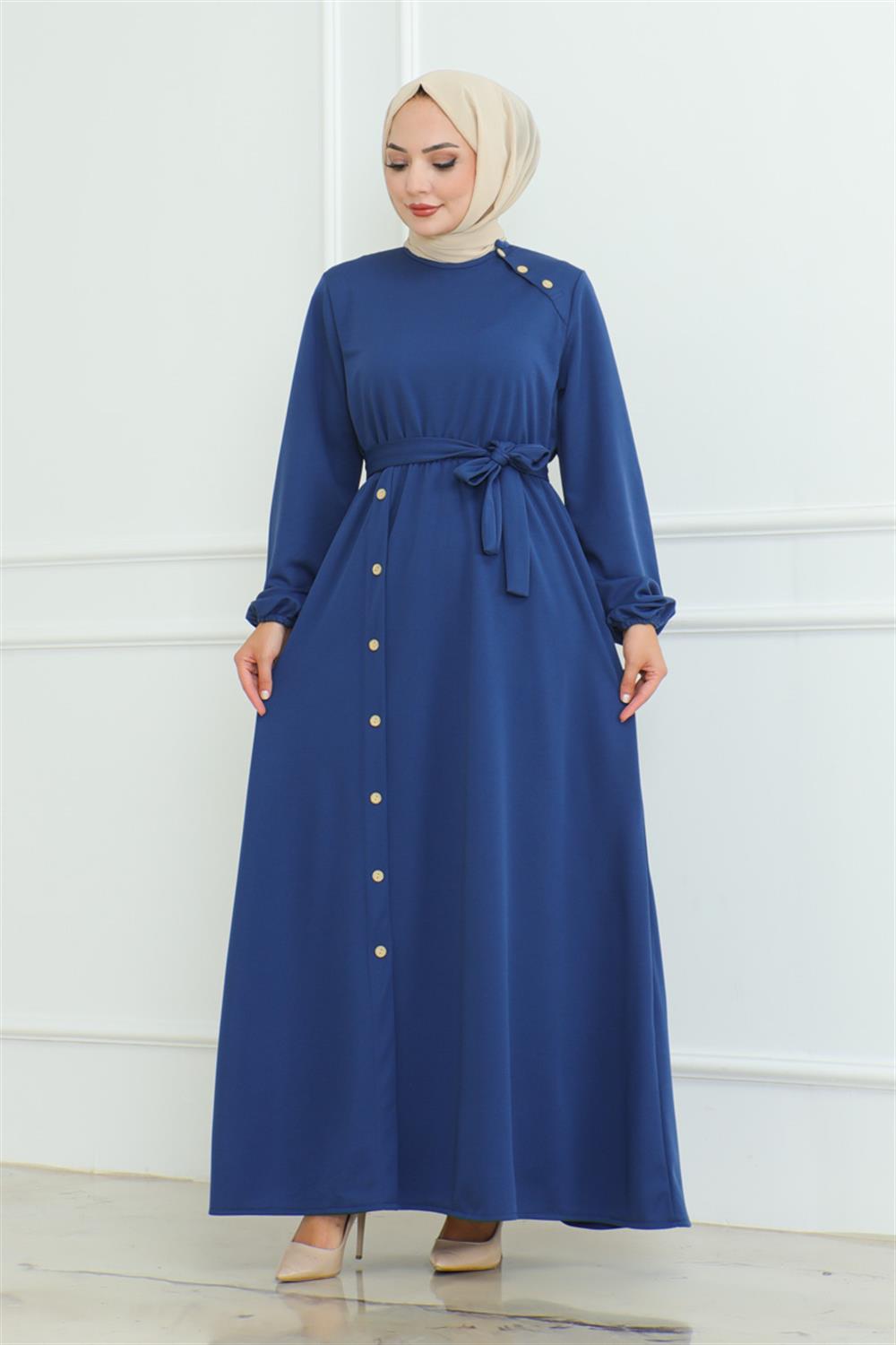 Omuz Detaylı Düğmeli Elbise İNDİGO
