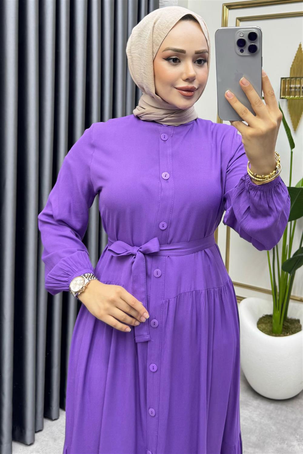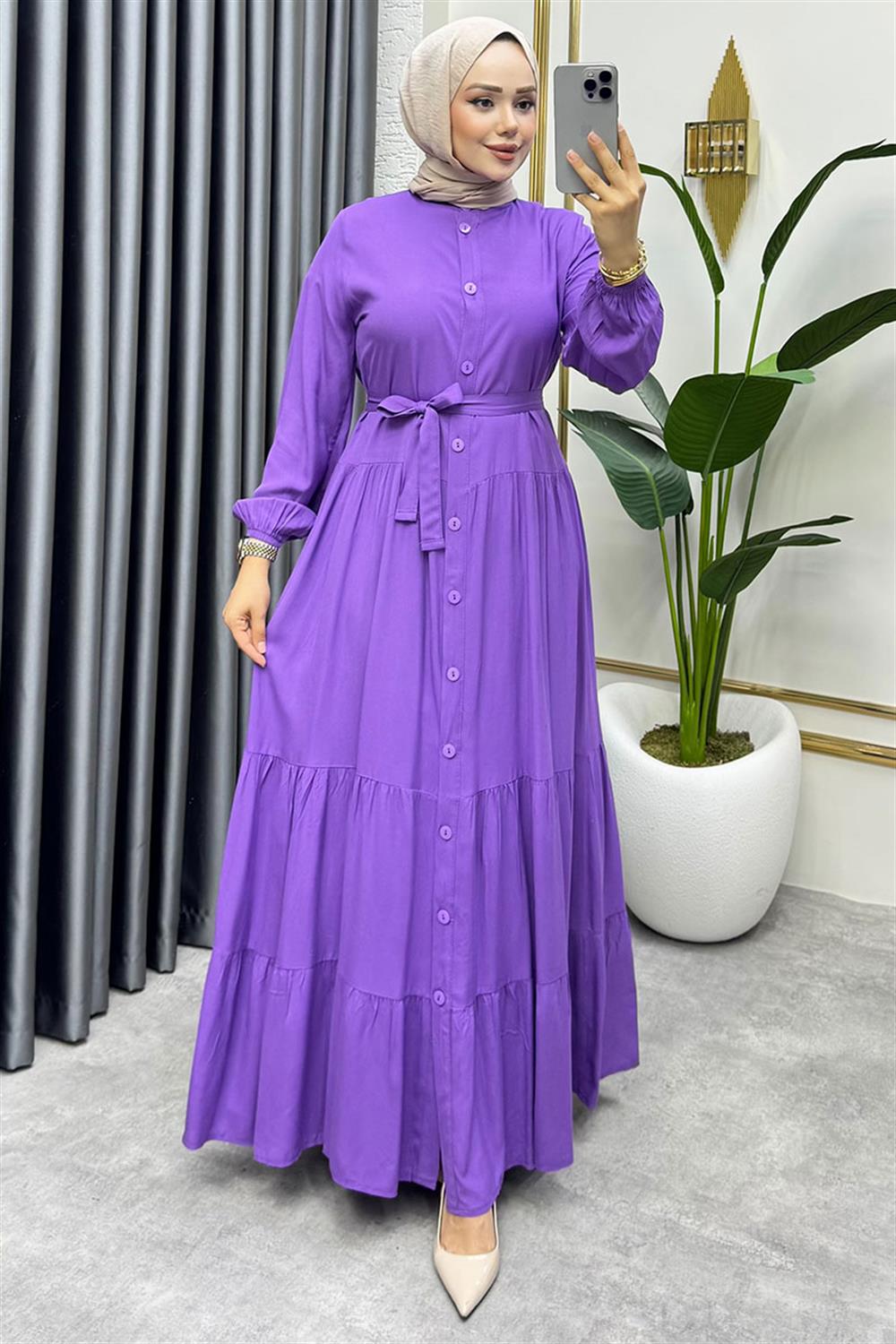 Önden Düğmeli Viskon Elbise LİLA