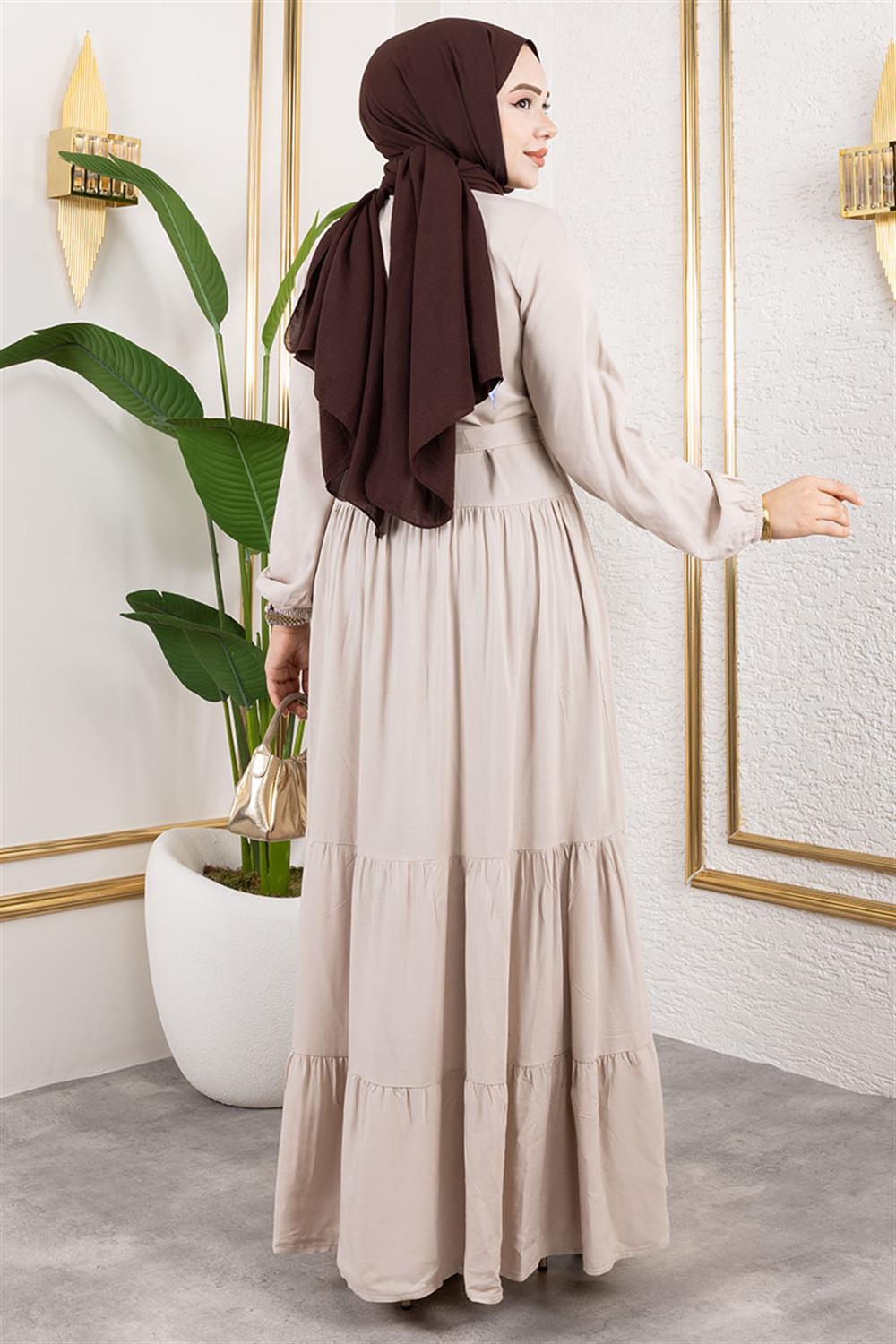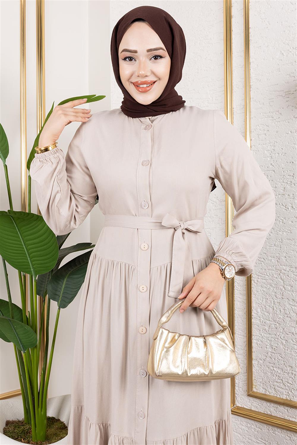 Önden Düğmeli Viskon Elbise VİZON