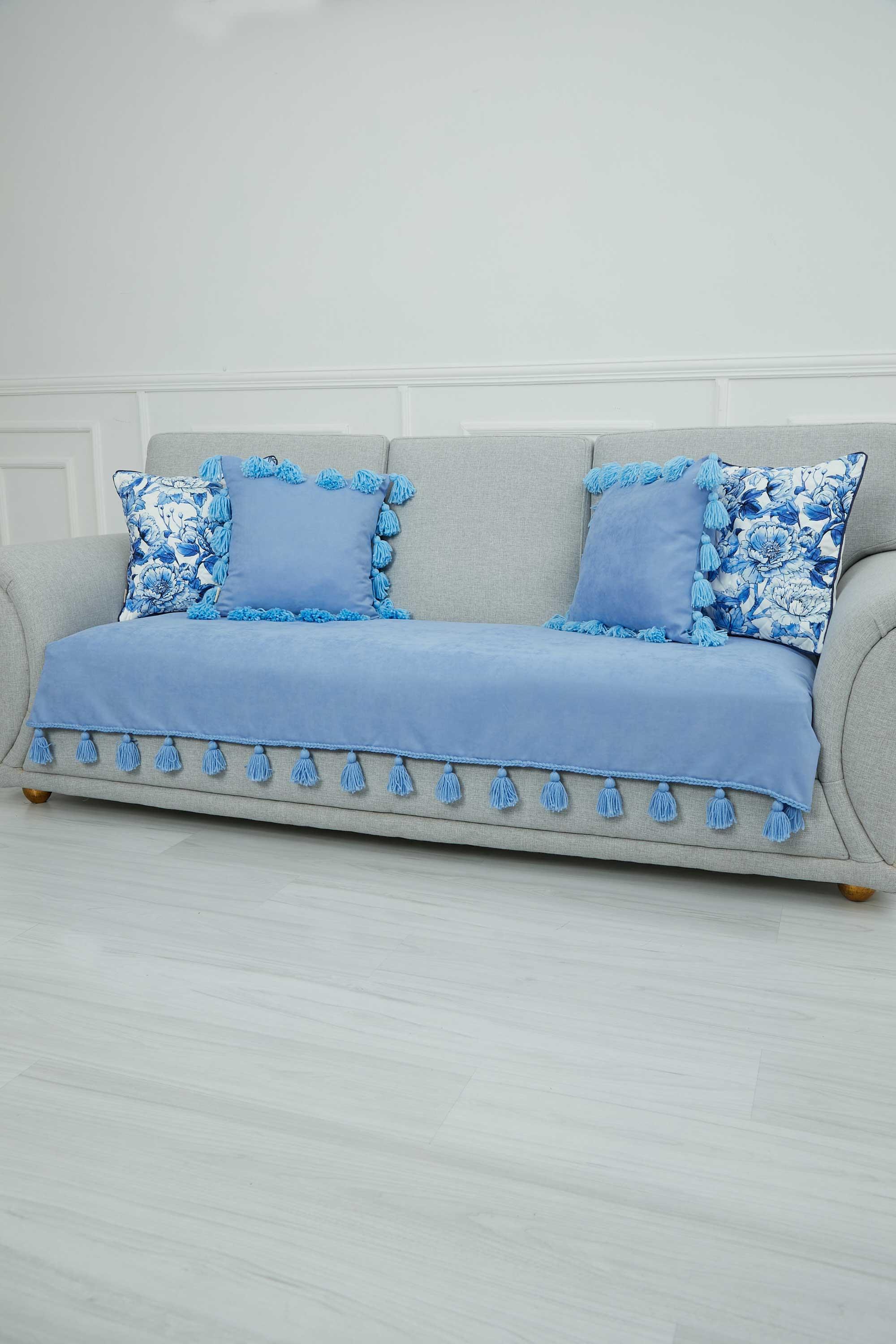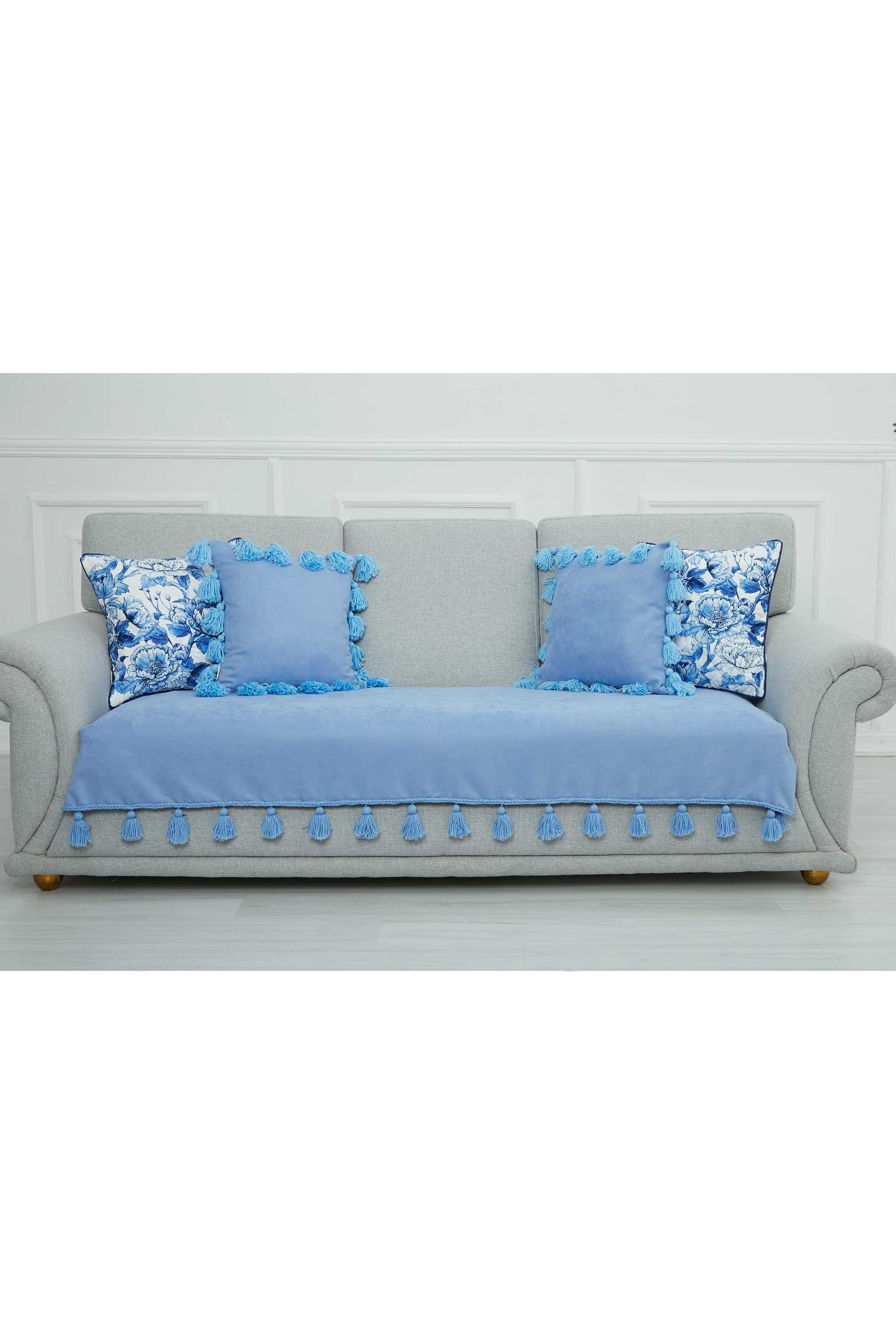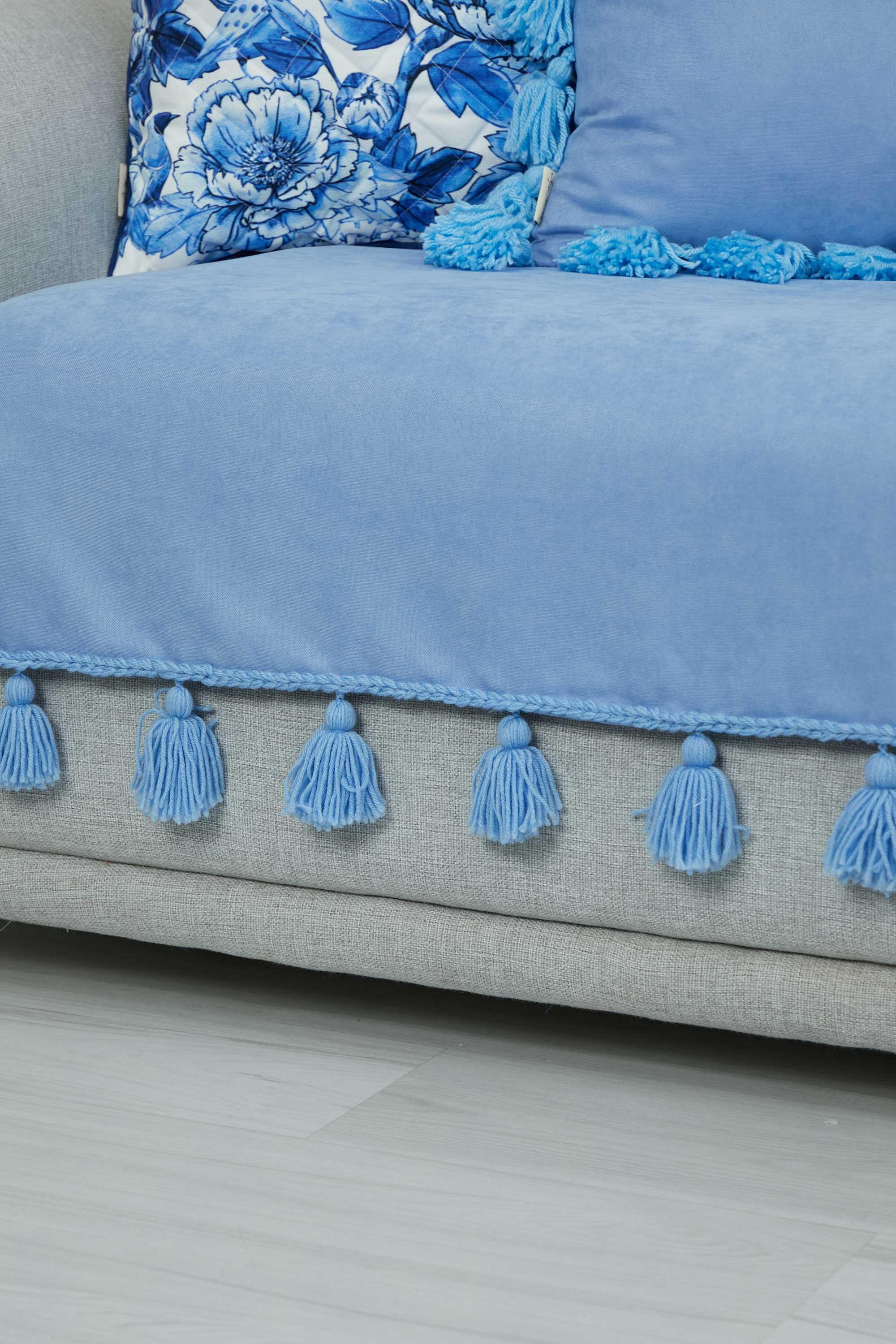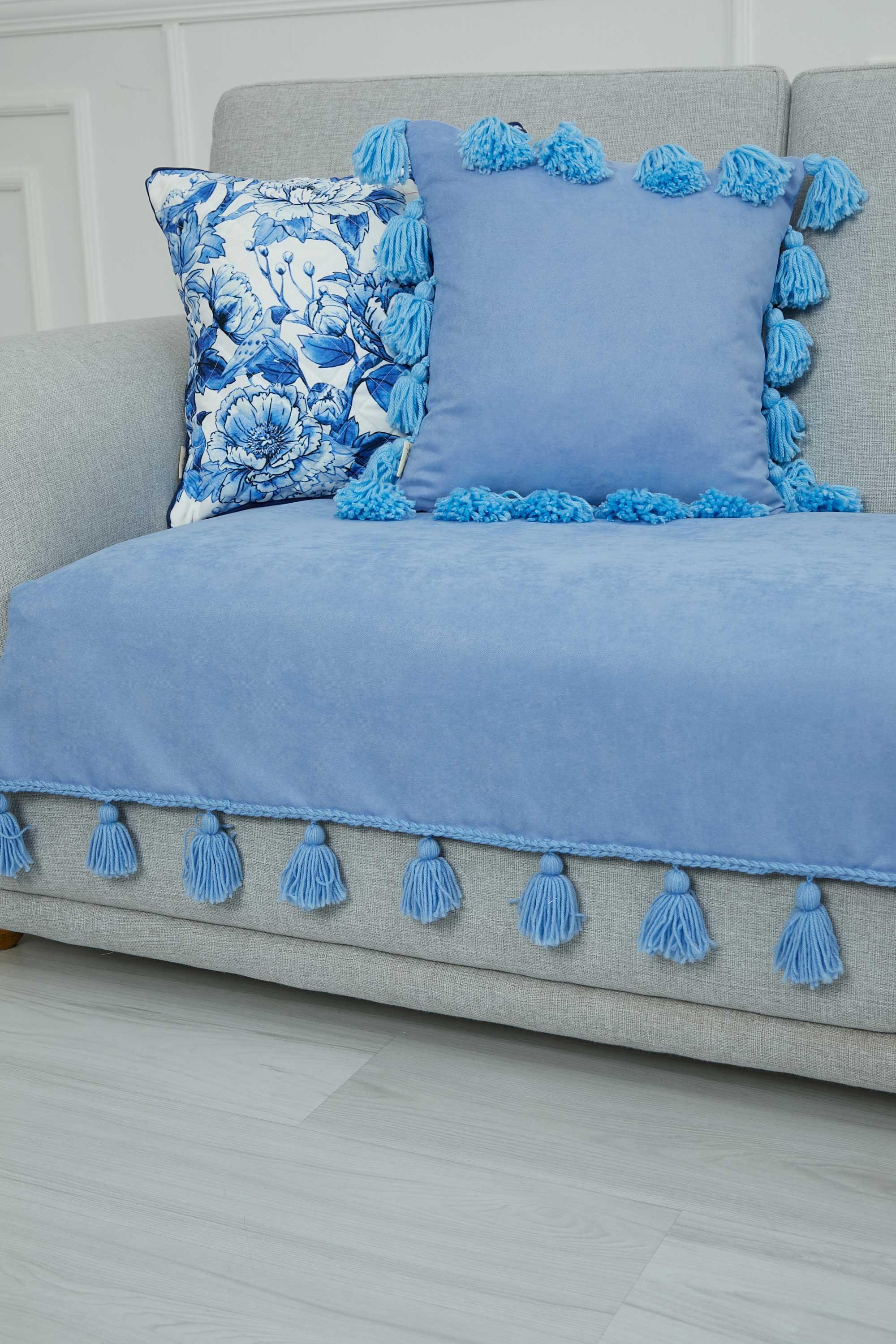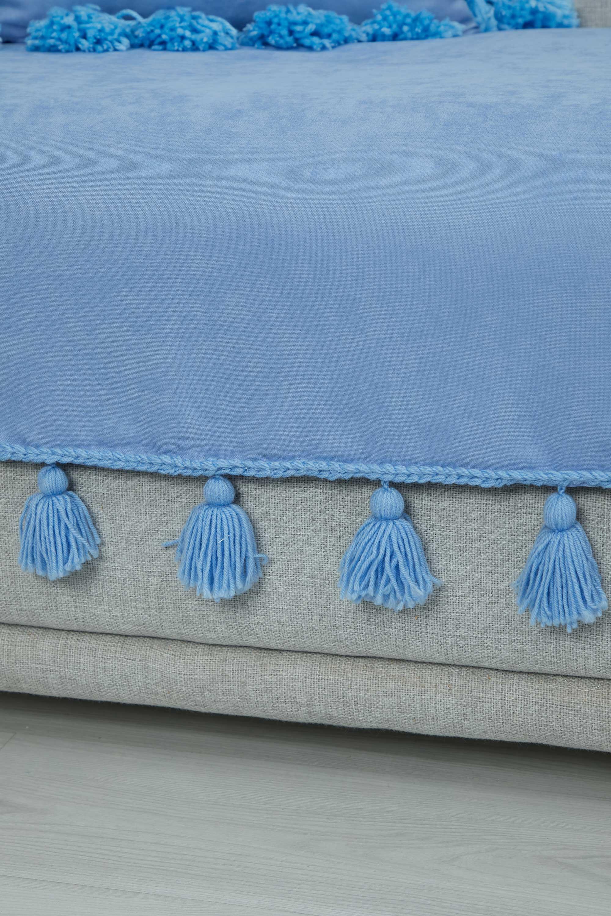 Örgü Kenar Detaylı Püsküllü Koltuk Örtüsü,KO-26 Bebe Mavi