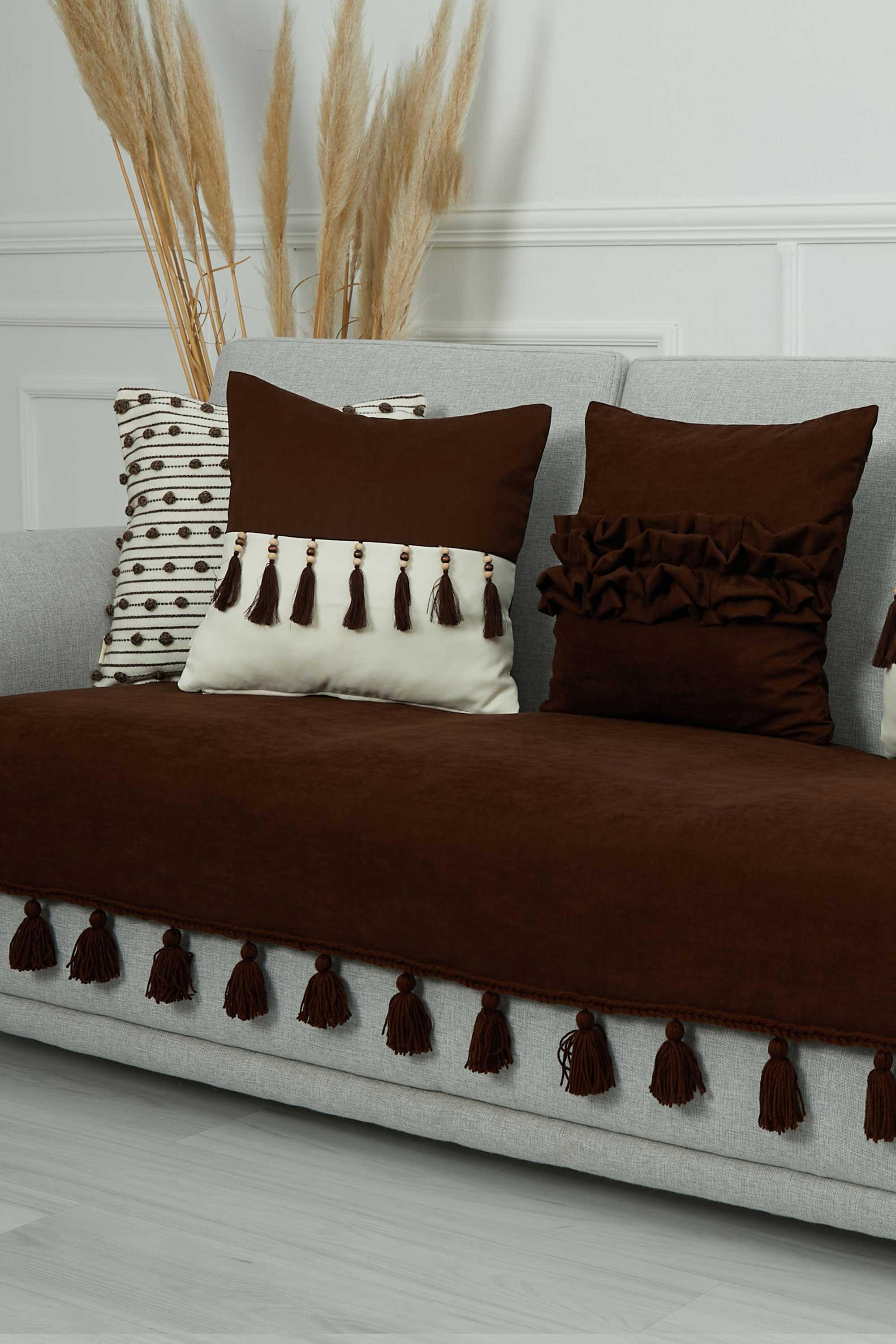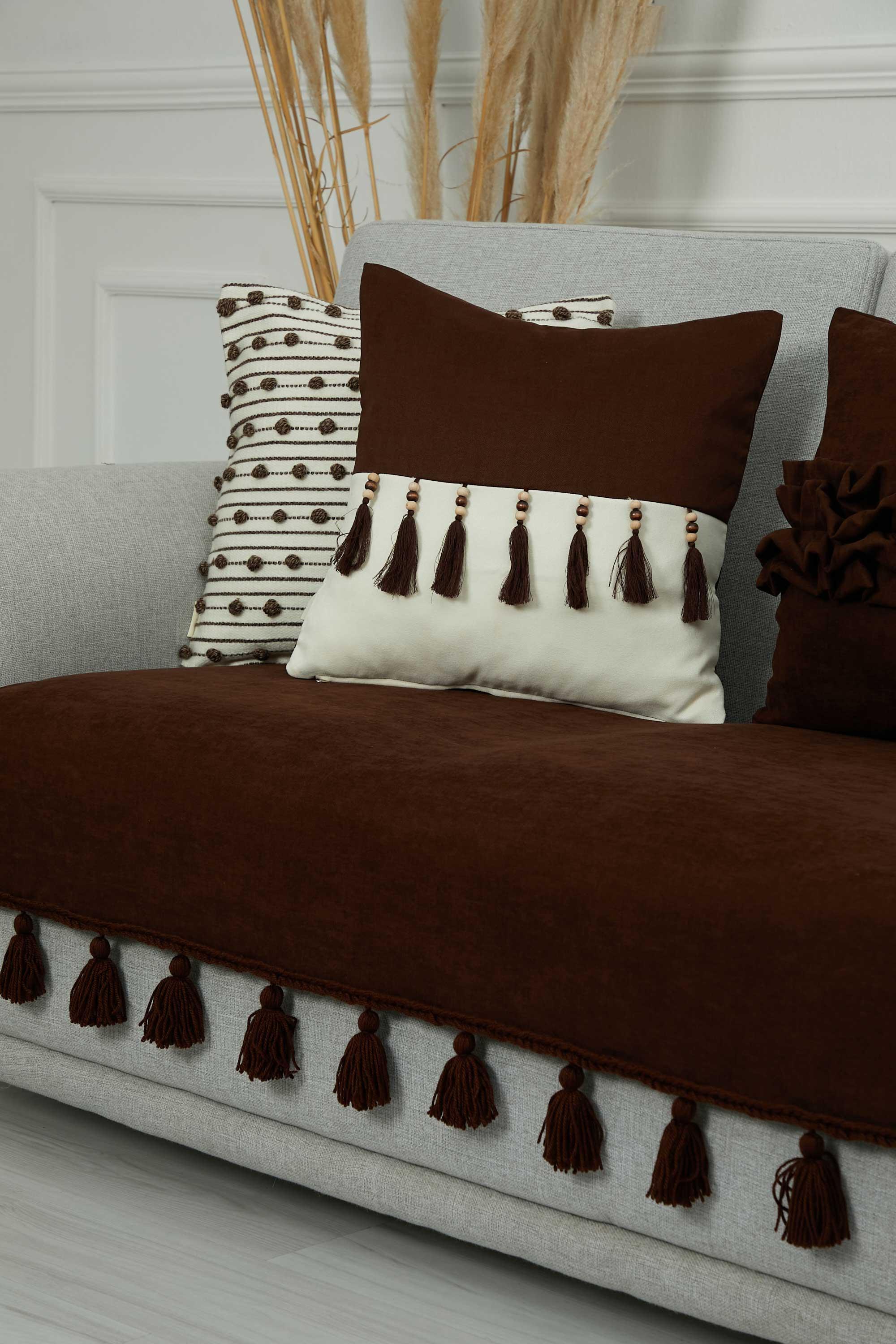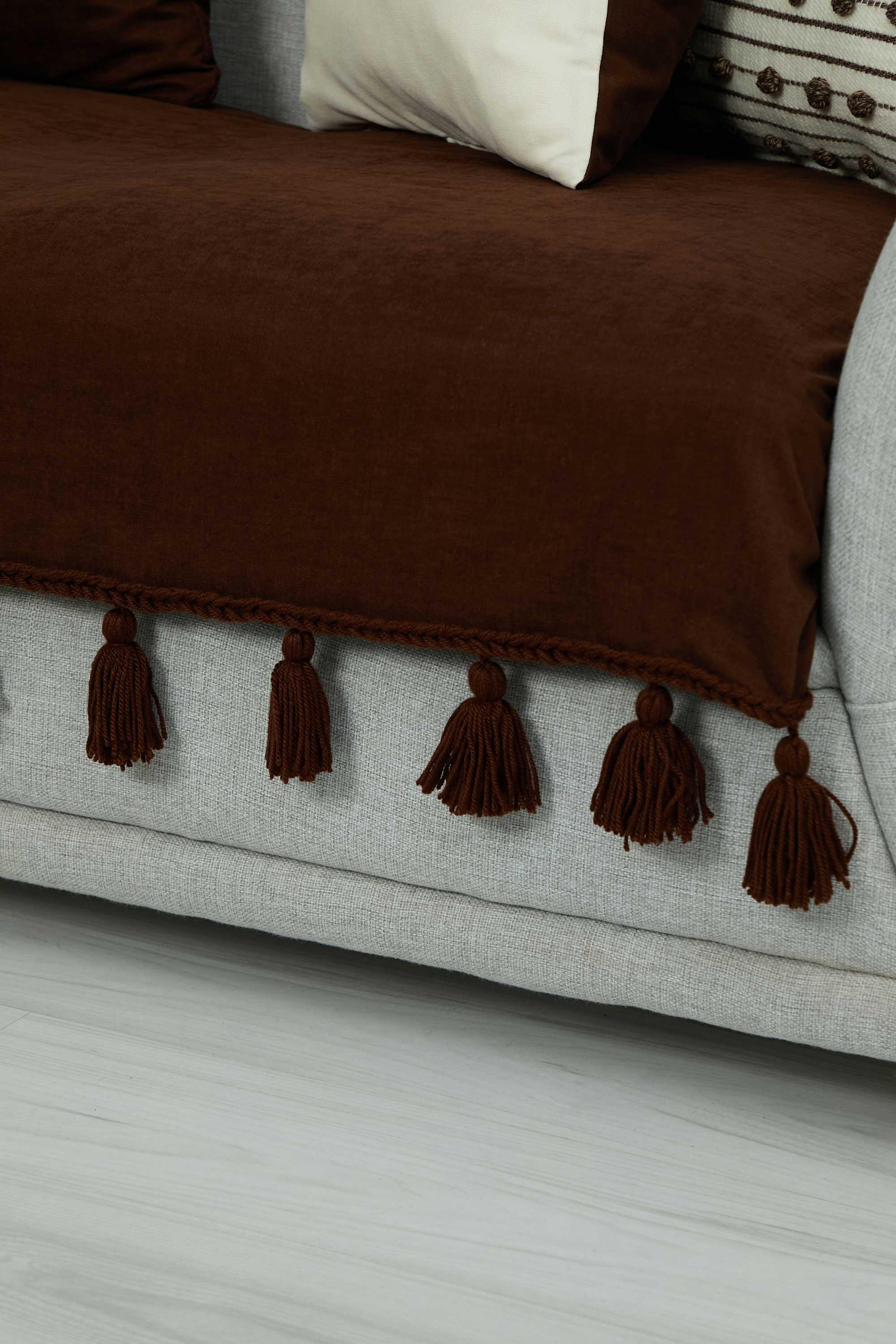 Örgü Kenar Detaylı Püsküllü Koltuk Örtüsü,KO-26 Kahverengi